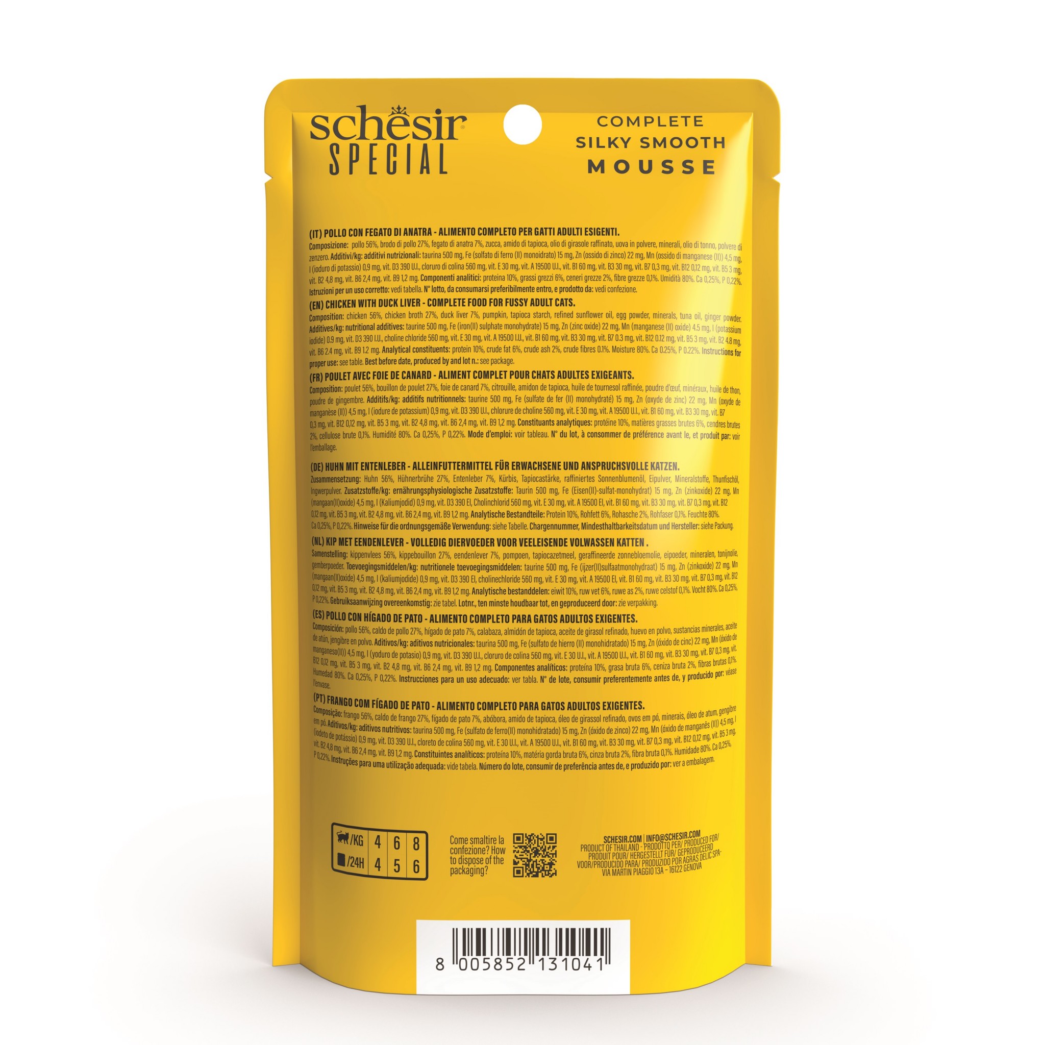 Kompletna karma dla dorosłych kotów. Przepis specjalnie opracowany dla wymagających kotów, oparty na prawdziwym mięsie kurczaka z odżywczą i smaczną wątrobą kaczą, zmiksowany w miękkim, aksamitnym musie.