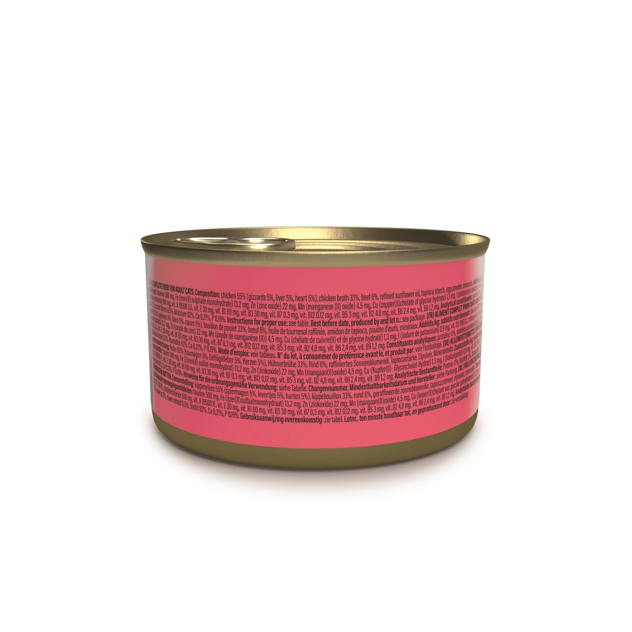 Pasztet mielony pełen białka, oparty na prawdziwym kurczaku, razem z pysznymi i odżywczymi kawałkami serca, wątroby i żołądków oraz pyszną wołowiną.