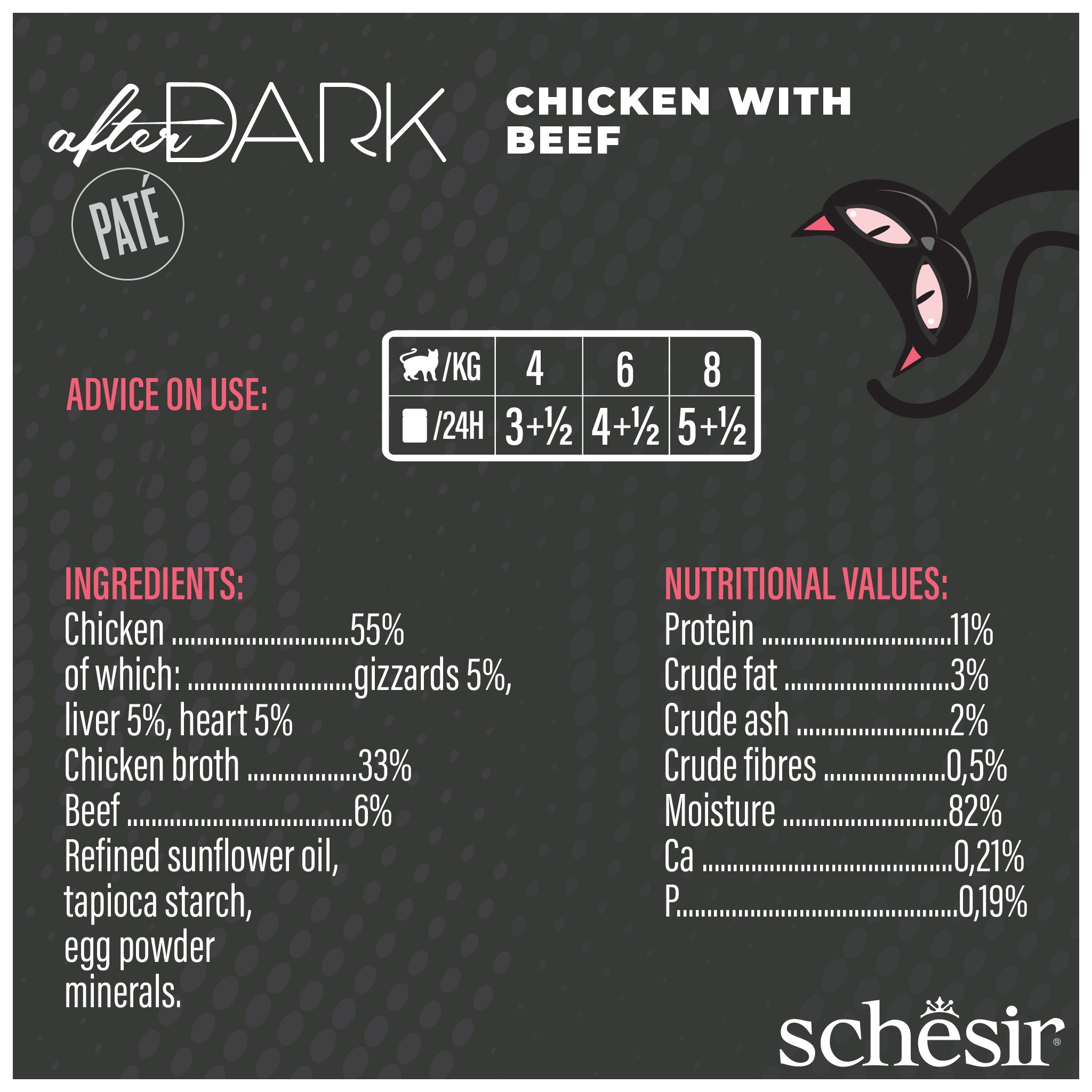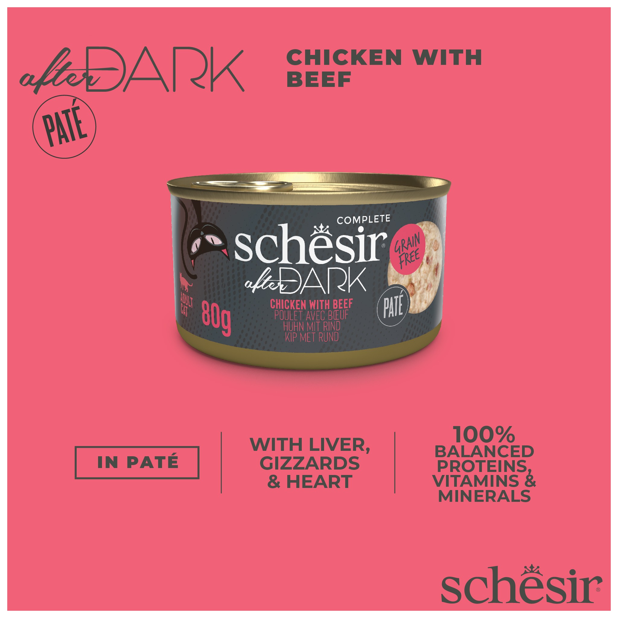 Schesir After Dark to linia minimalnie przetworzonych, kompletnych i zbilansowanych mokrych karm o wysokiej zawartości białka, przeznaczona dla kotów, które kochają smak mięsa i podrobów.