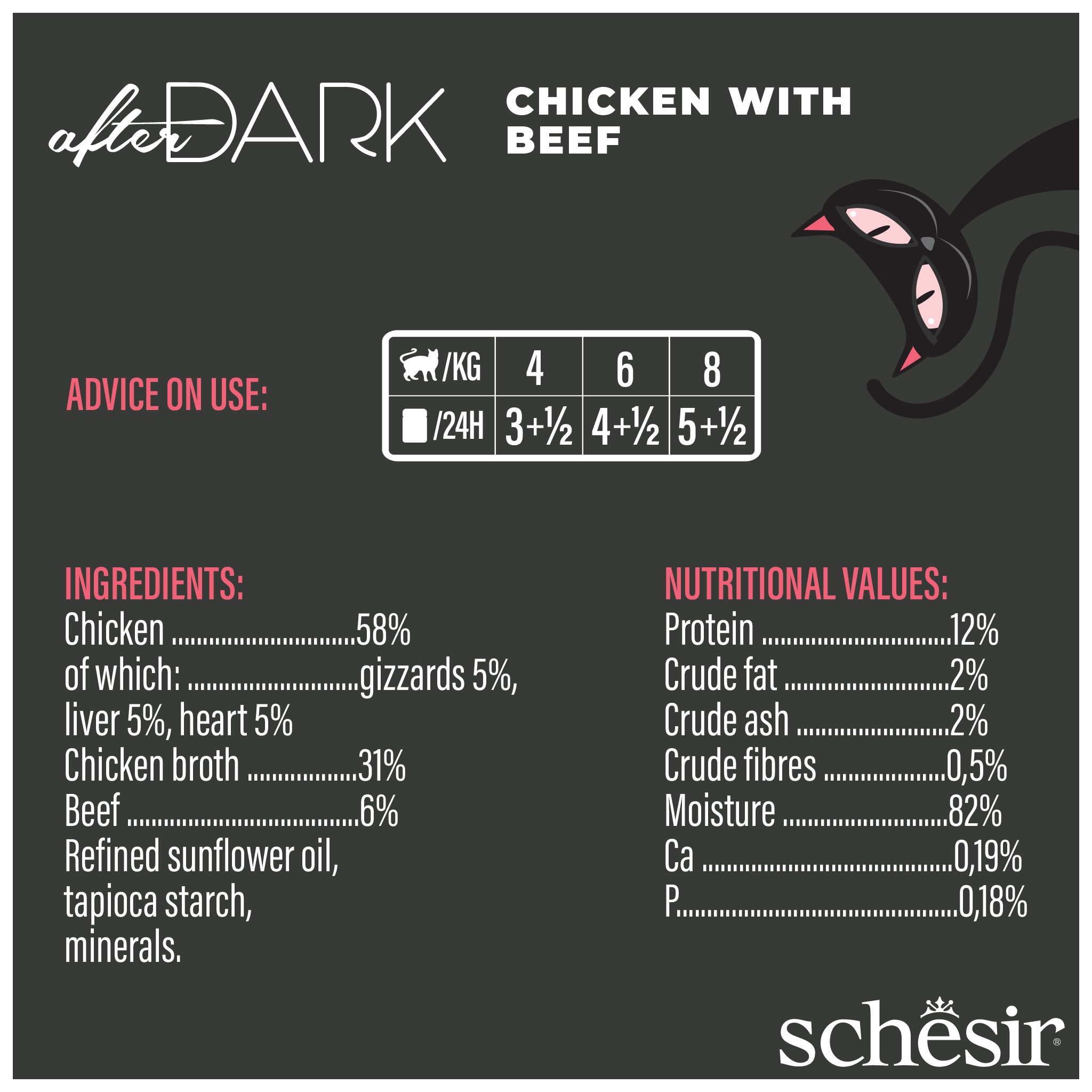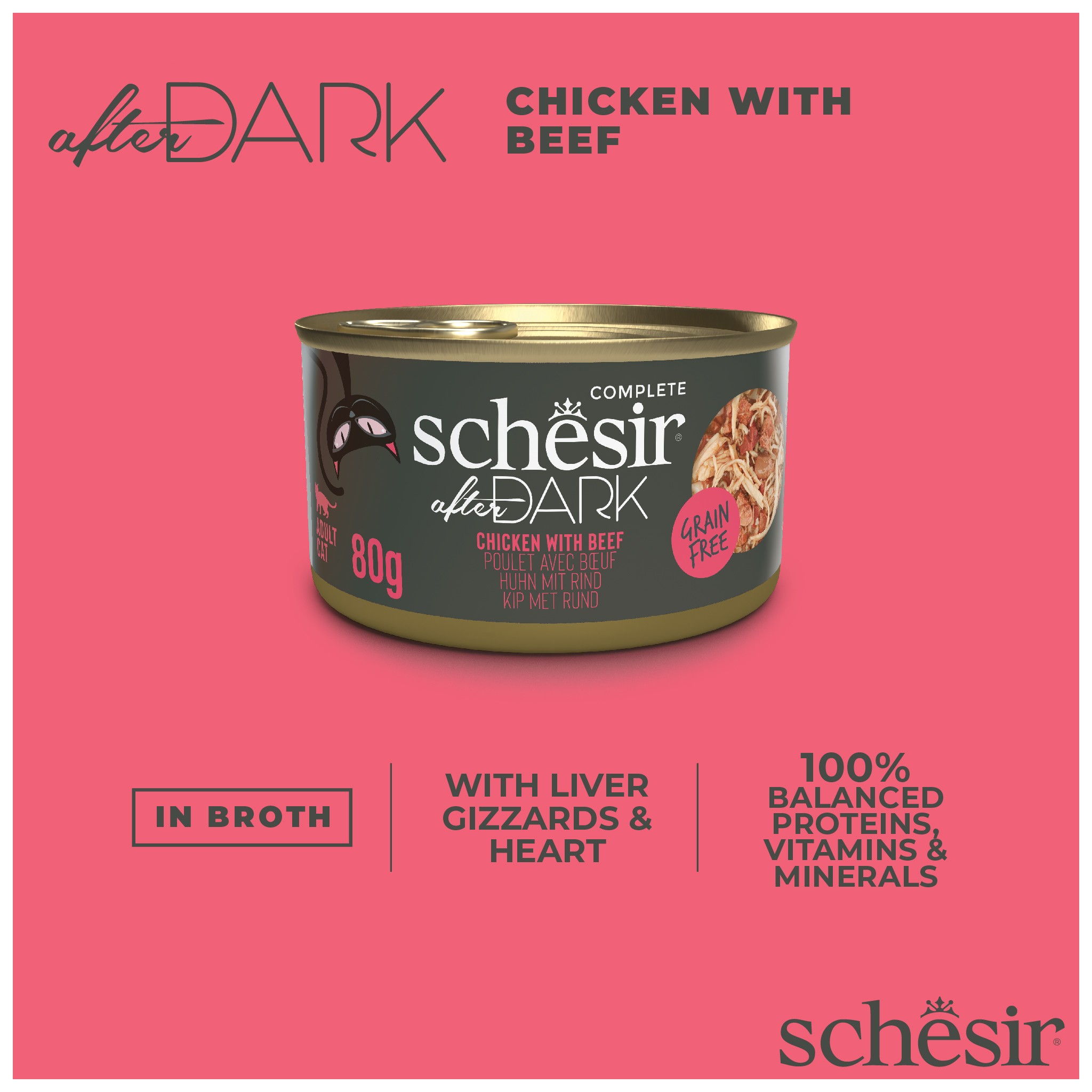 Schesir After Dark to linia minimalnie przetworzonych, kompletnych i zbilansowanych mokrych karm o wysokiej zawartości białka, przeznaczona dla kotów, które kochają smak mięsa i podrobów.