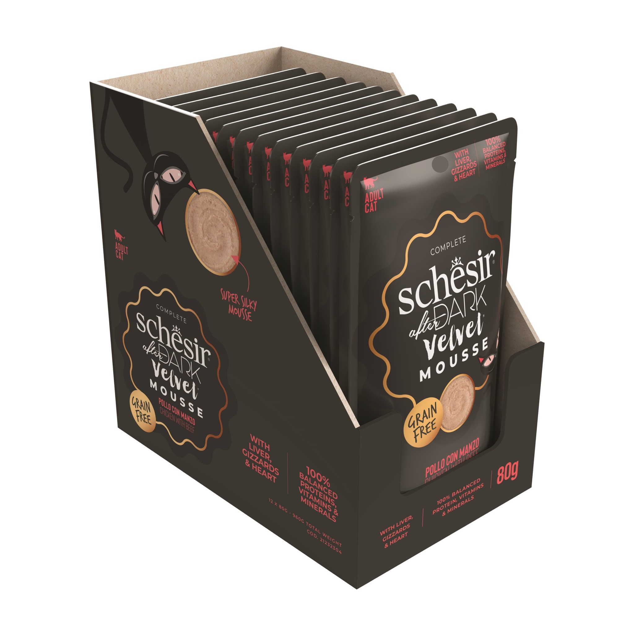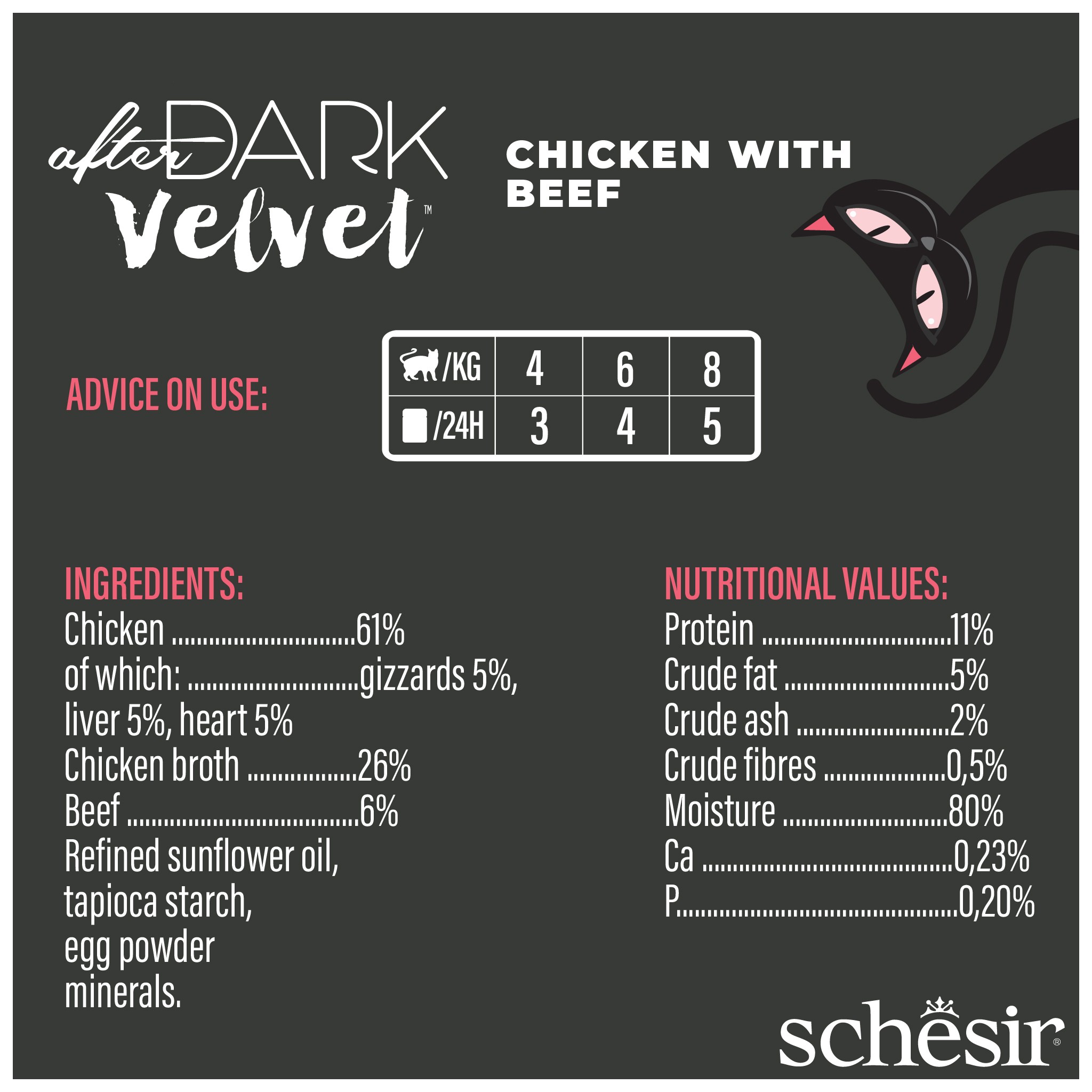 Schesir After Dark to linia minimalnie przetworzonych, kompletnych i zbilansowanych mokrych karm o wysokiej zawartości białka, przeznaczona dla kotów, które kochają smak mięsa i podrobów.