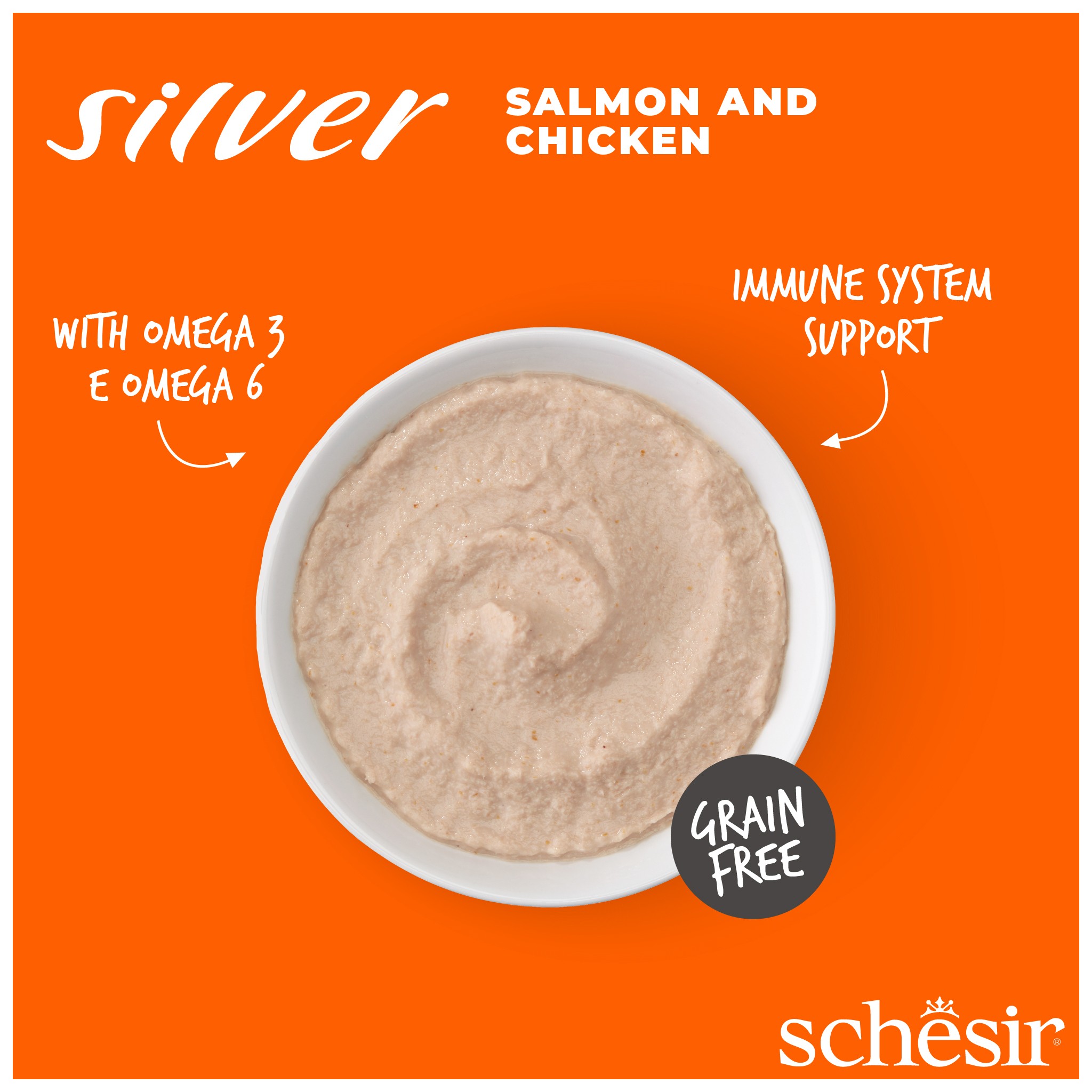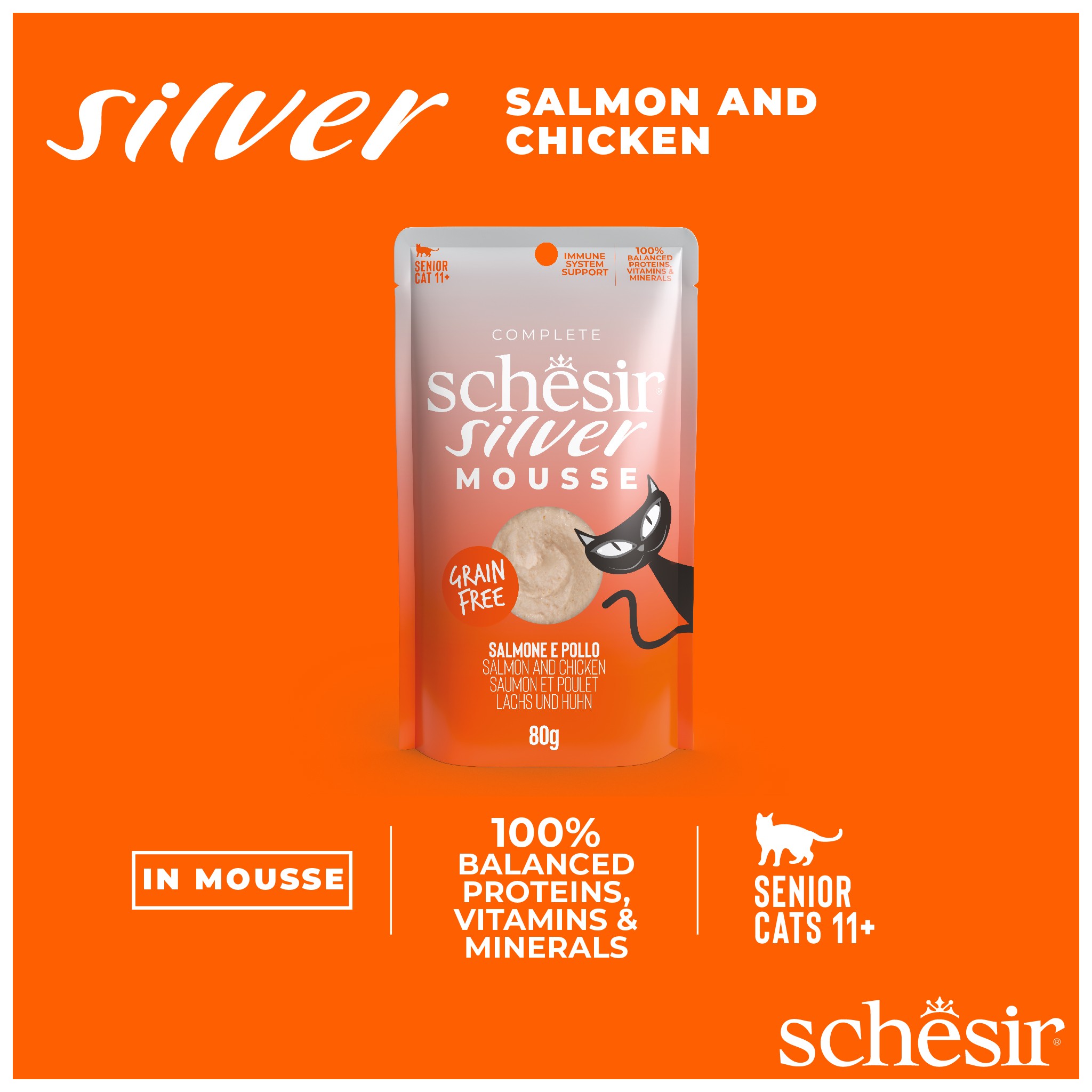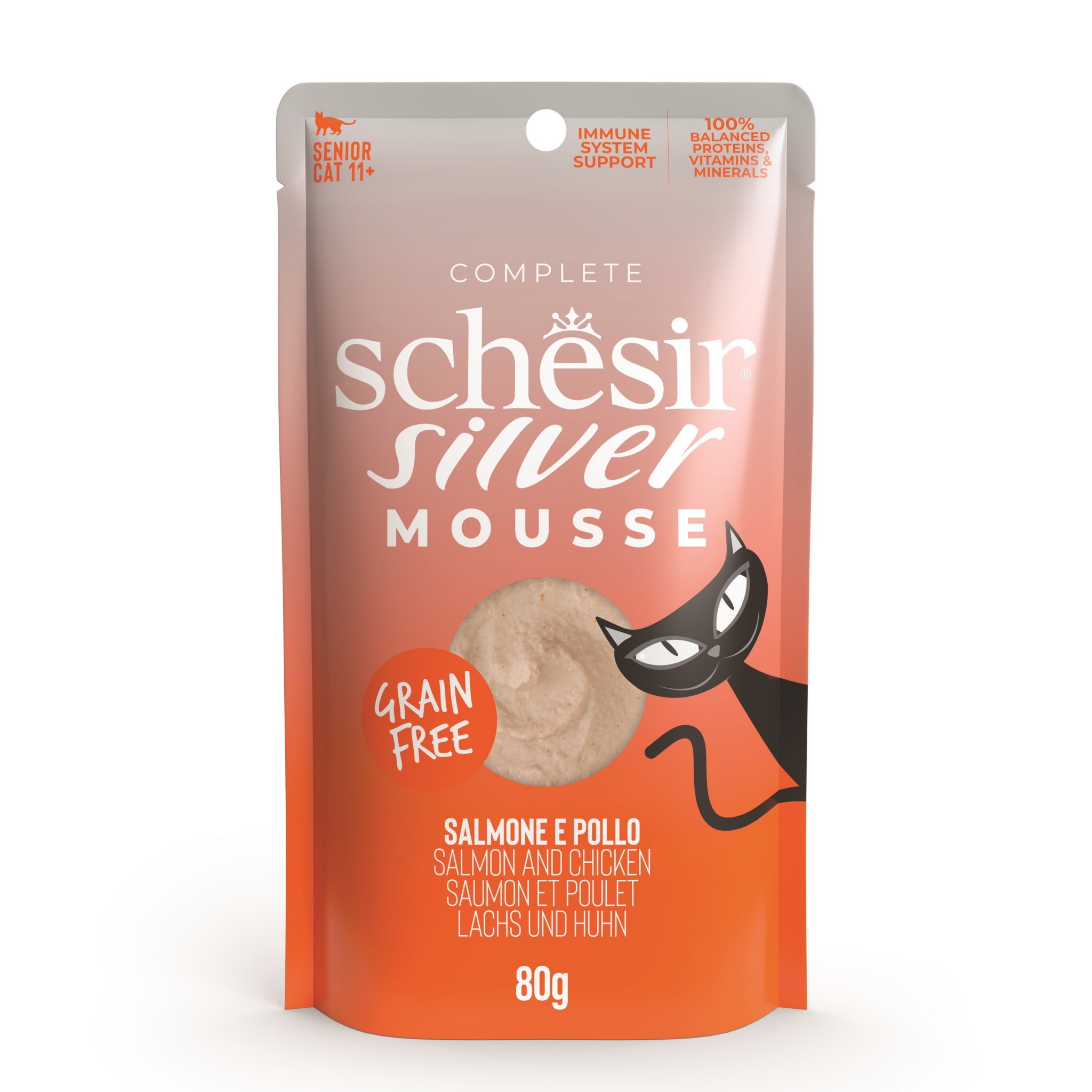 Schesir Silver to linia minimalnie przetworzonych, kompletnych i zbilansowanych mokrych karm, które pomagają utrzymać zdrowie i szczęście starszych kotów, dzięki specjalnym formułom opracowanym specjalnie dla nich.