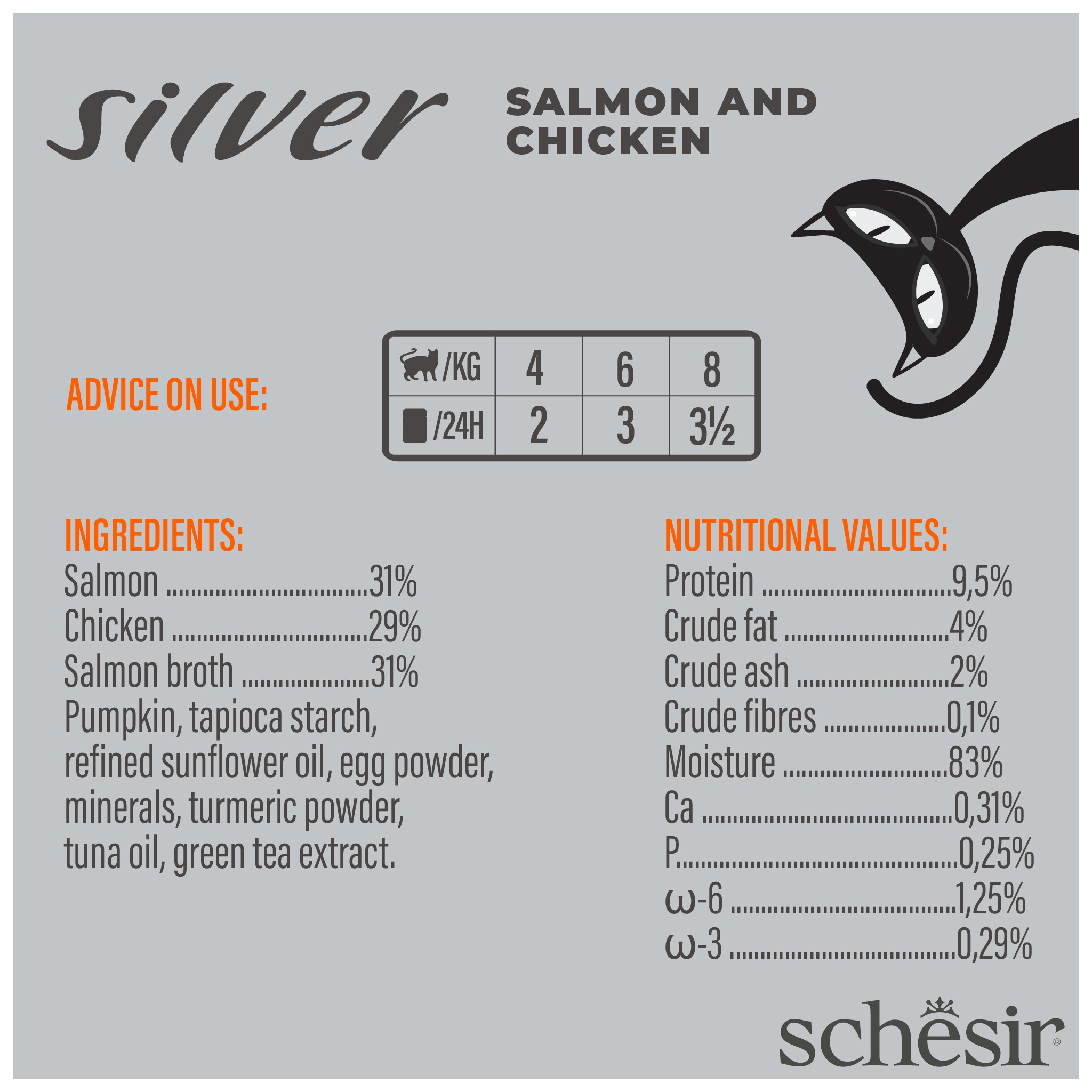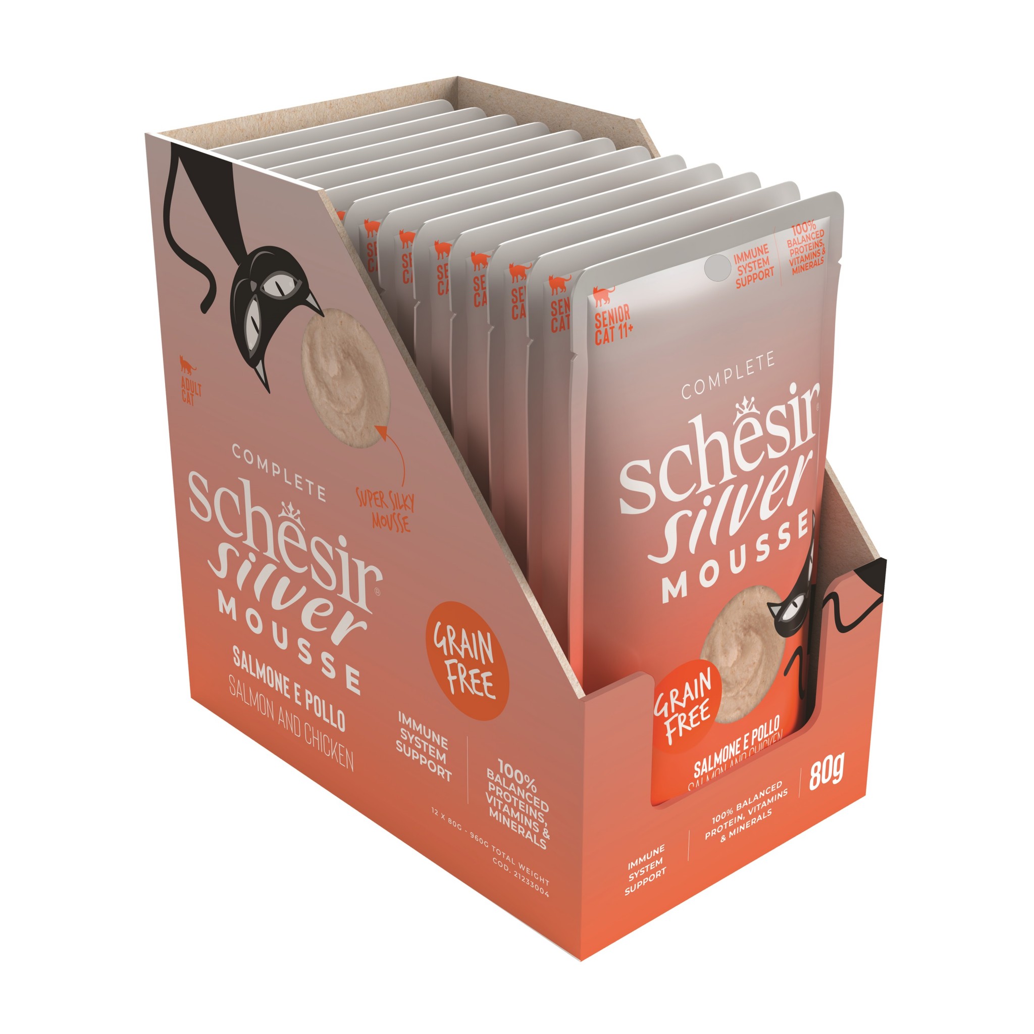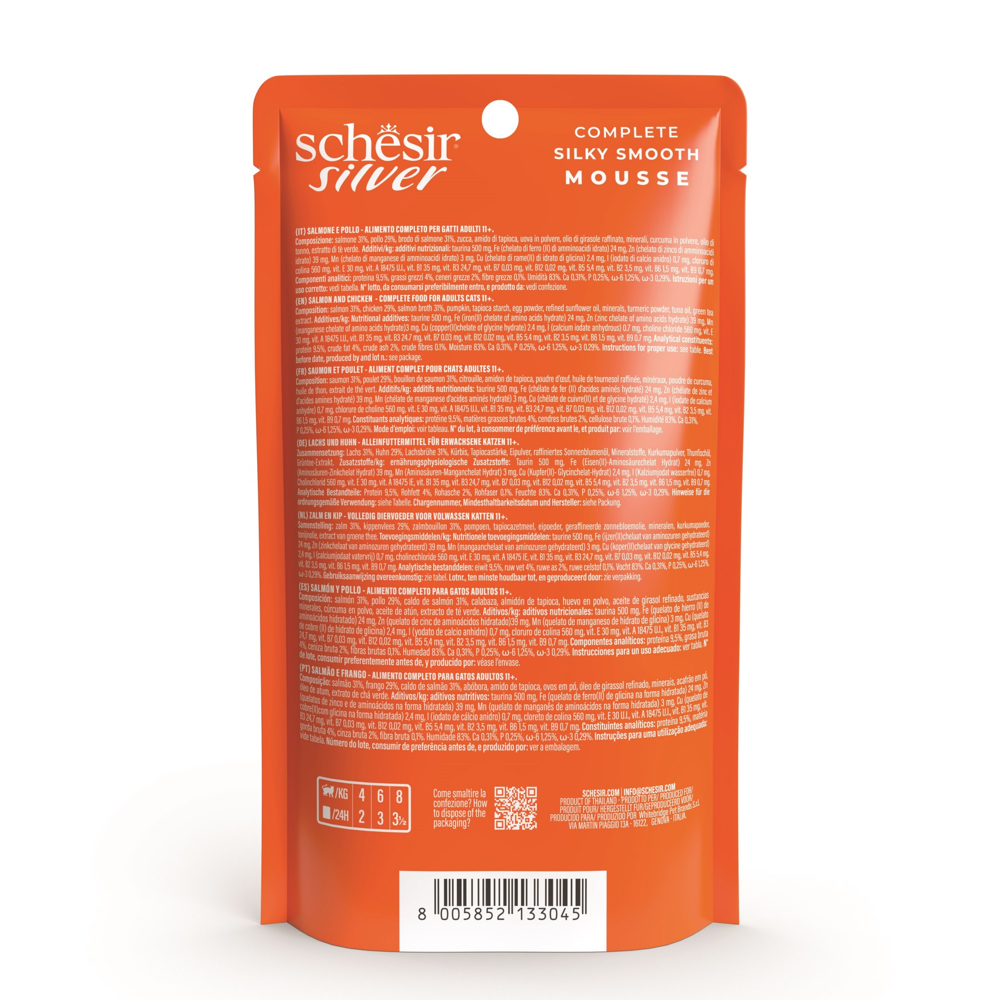 Schesir Silver to linia minimalnie przetworzonych, kompletnych i zbilansowanych mokrych karm, które pomagają utrzymać zdrowie i szczęście starszych kotów, dzięki specjalnym formułom opracowanym specjalnie dla nich.