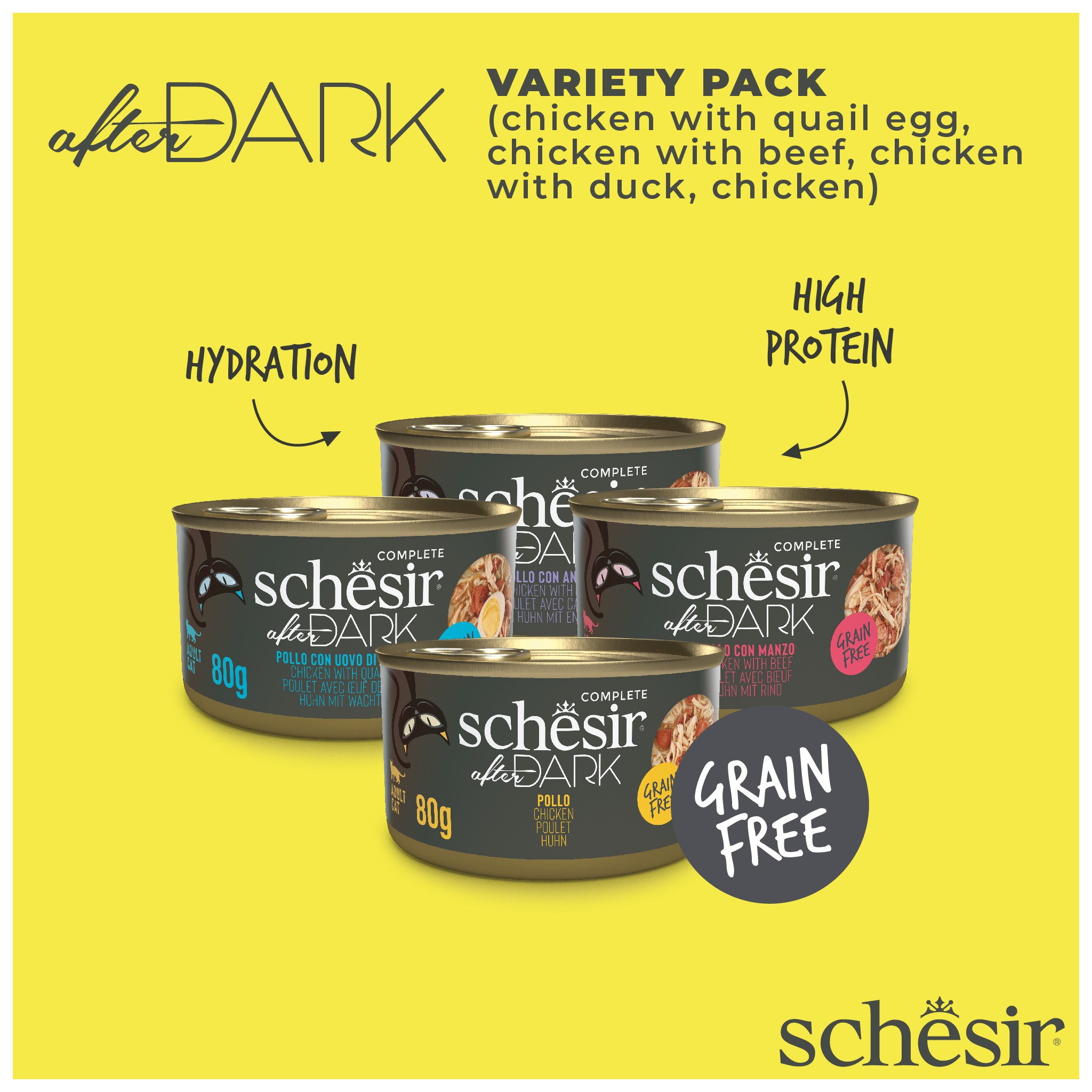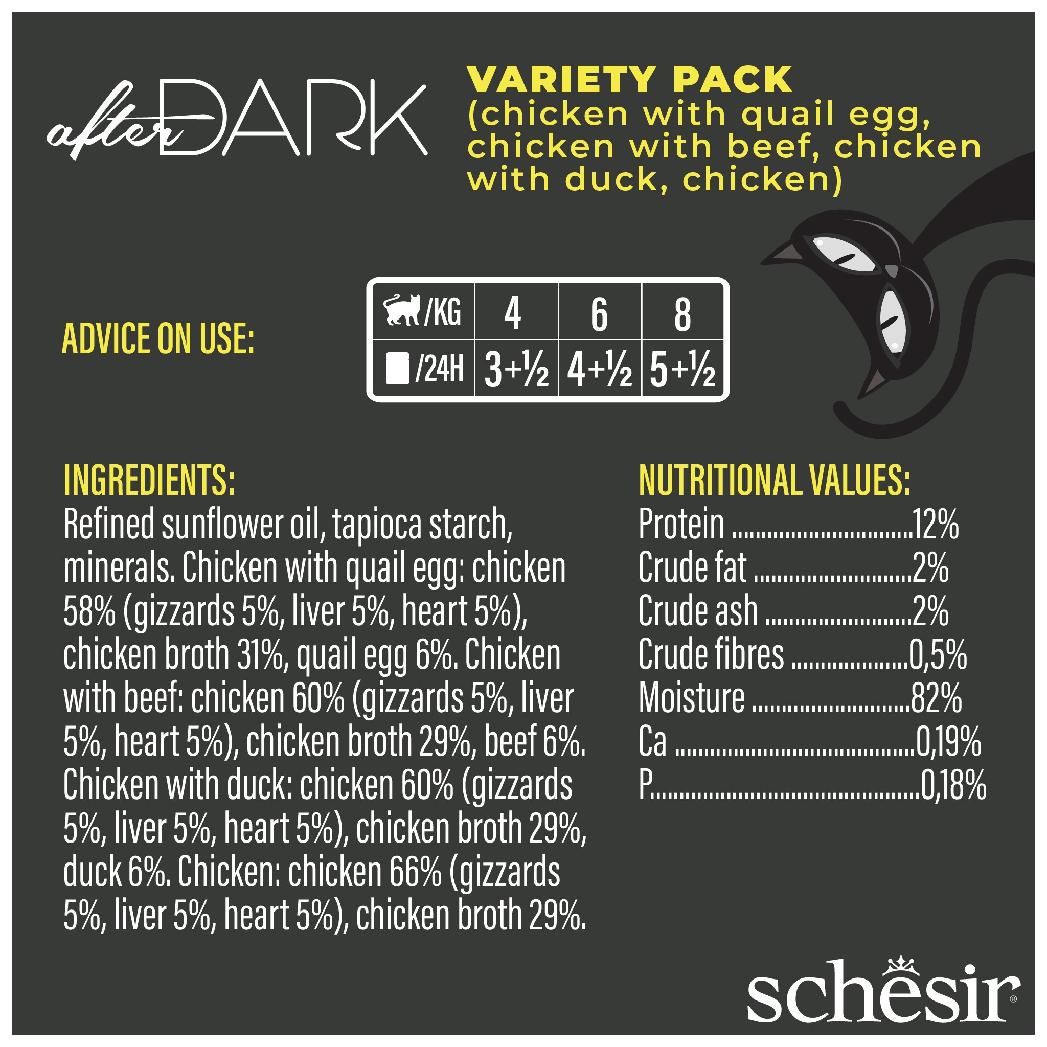 Schesir After Dark to linia minimalnie przetworzonych, kompletnych i zbilansowanych mokrych karm o wysokiej zawartości białka, przeznaczona dla kotów, które kochają smak mięsa i podrobów.