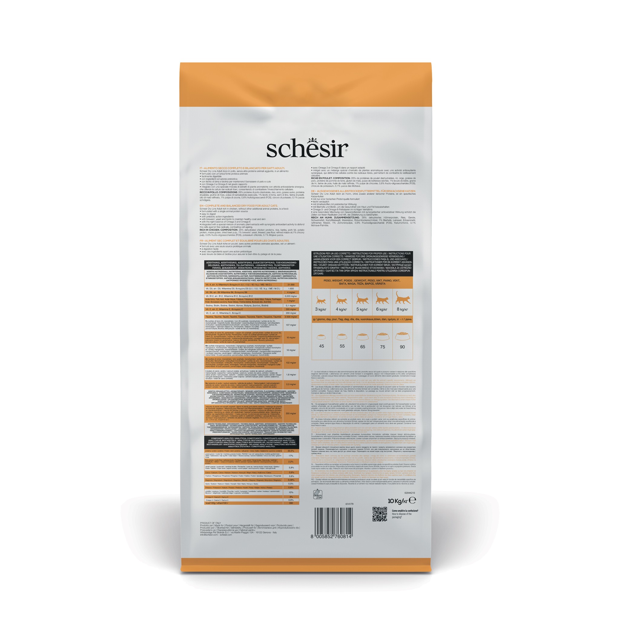 Aby zapewnić prawidłowe, kompletne i zbilansowane żywienie, konieczne jest codzienne podawanie kotu zarówno suchej, jak i mokrej karmy Schesir. Przejście na nową karmę musi być stopniowe. Podane ilości odnoszą się do podawania samego suchego produktu lub produktu w połączeniu z mokrym i mogą się różnić w zależności od konkretnych potrzeb zwierzęcia.