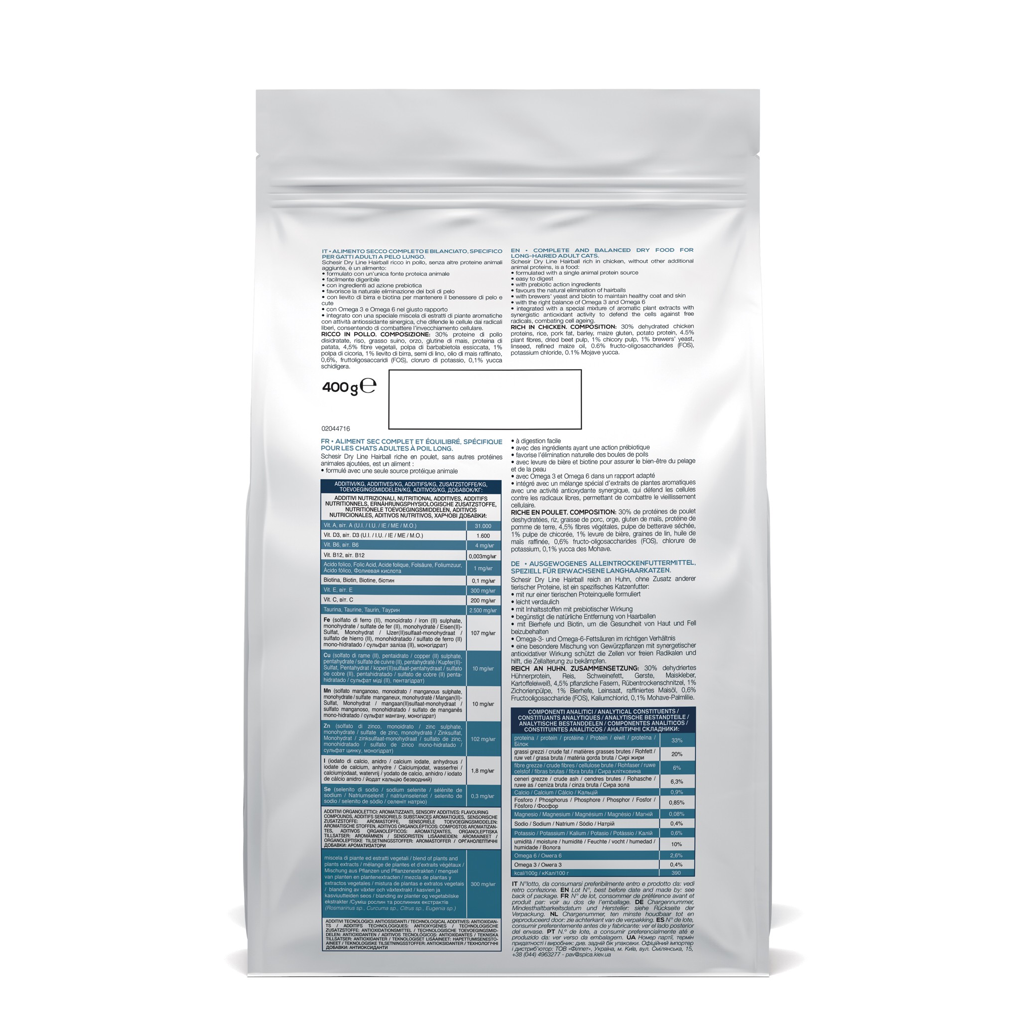 Linia Original Schesir oferuje suchą karmę dla kotów długowłosych. Skomponowana z jednym źródłem białka zwierzęcego, karma ta jest wzbogacona o witaminy i minerały oraz zawiera ekstrakty roślin aromatycznych o synergicznym działaniu przeciwutleniającym. Dodatkowo, wyższa zawartość tłuszczów i rozpuszczalnych błonników wspomaga naturalne usuwanie kul włosowych z żołądka, redukując epizody wymiotów.