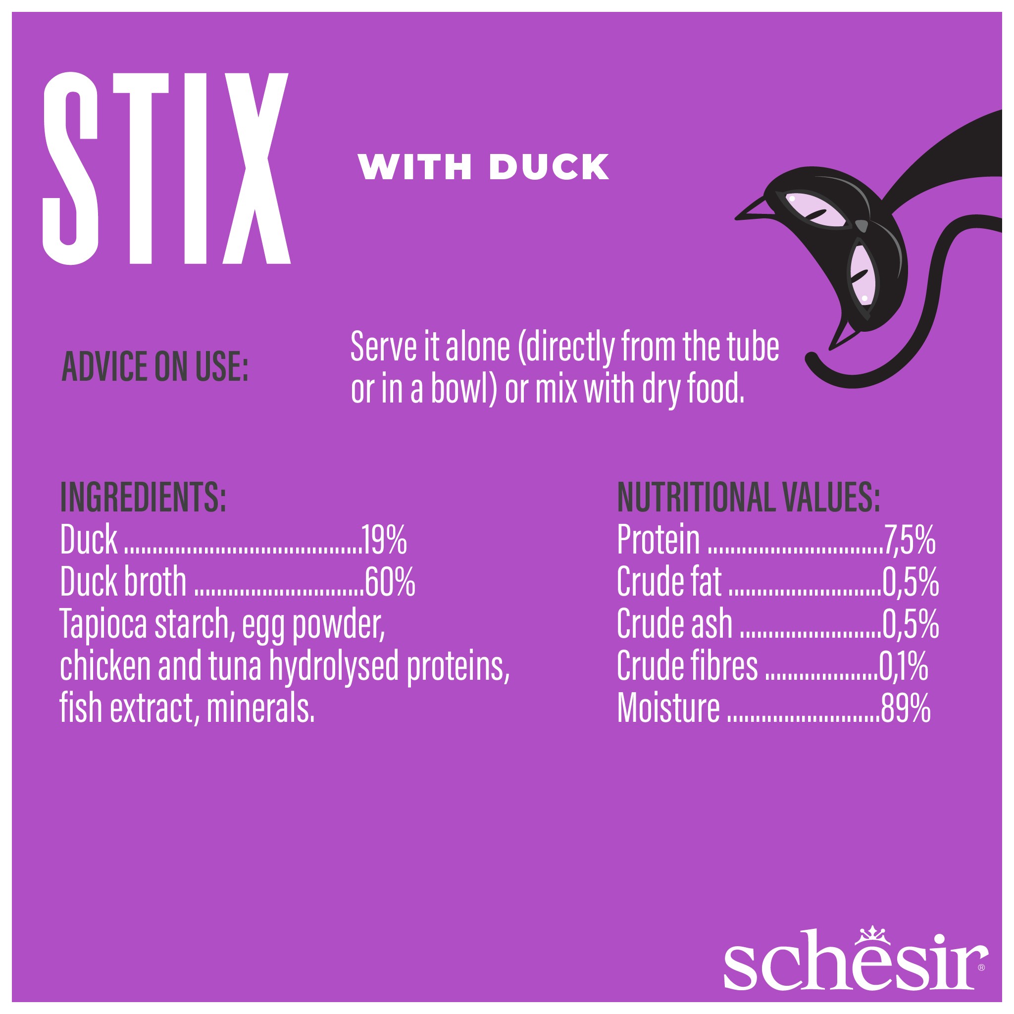 bulion z kaczki 60%, kaczka 19%, kurczak 16%, skrobia z tapioki, sproszkowane jaja, hydrolizowane białka z kurczaka i tuńczyka, ekstrakt z ryb, minerały.
