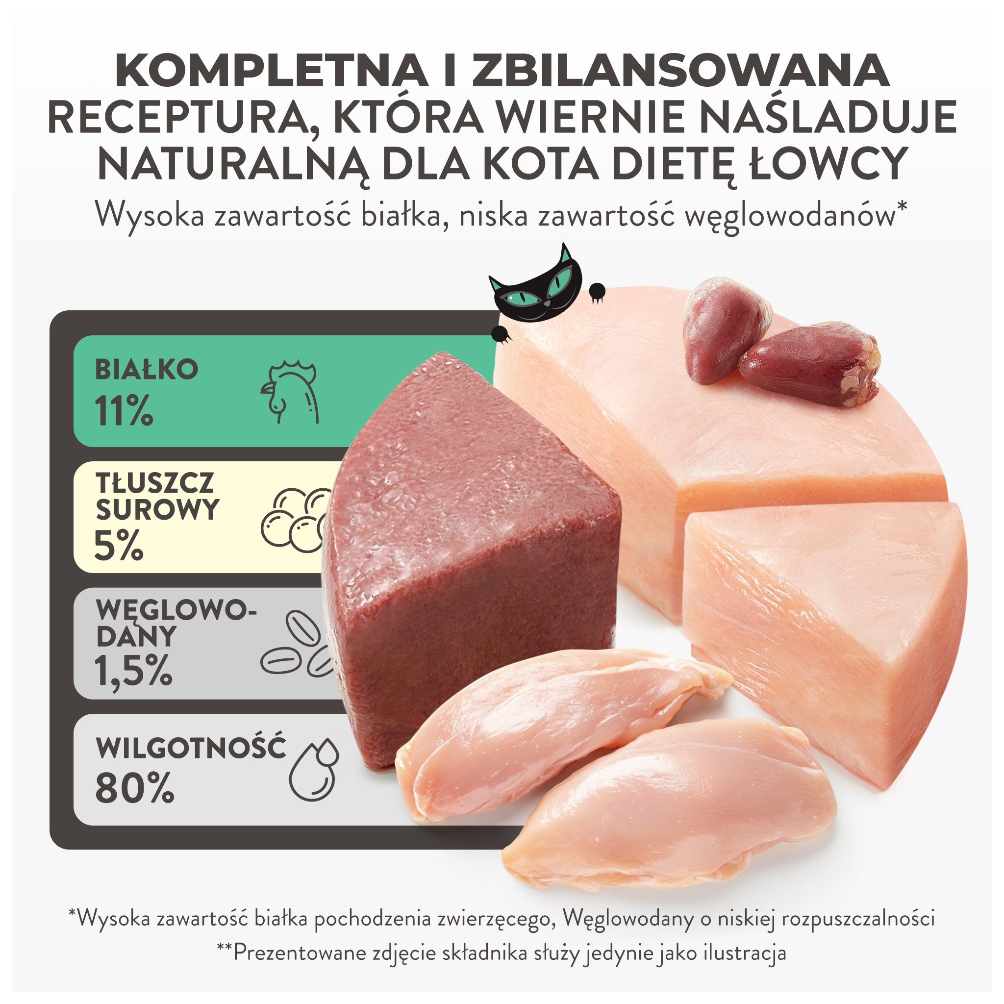 • Bogata w białko – wspiera zdrową masę mięśniową, kondycję i witalność, zgodnie z naturalnymi potrzebami kotów mięsożernych.