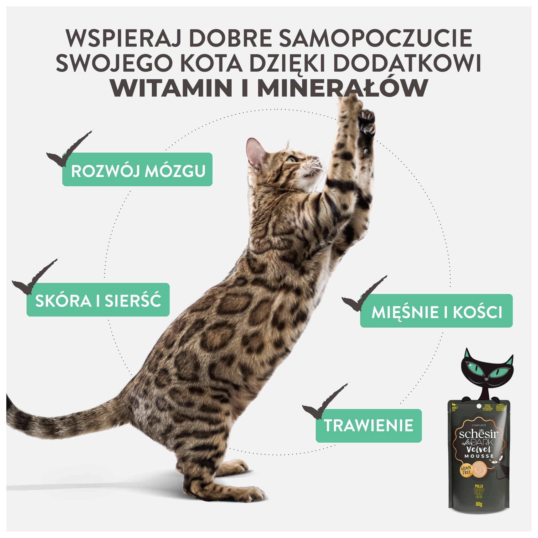• Aksamitna konsystencja musu – lekka, kremowa i smakowita, idealna także dla kotów o wrażliwym uzębieniu, kociaków przechodzących na stały pokarm i seniorów.