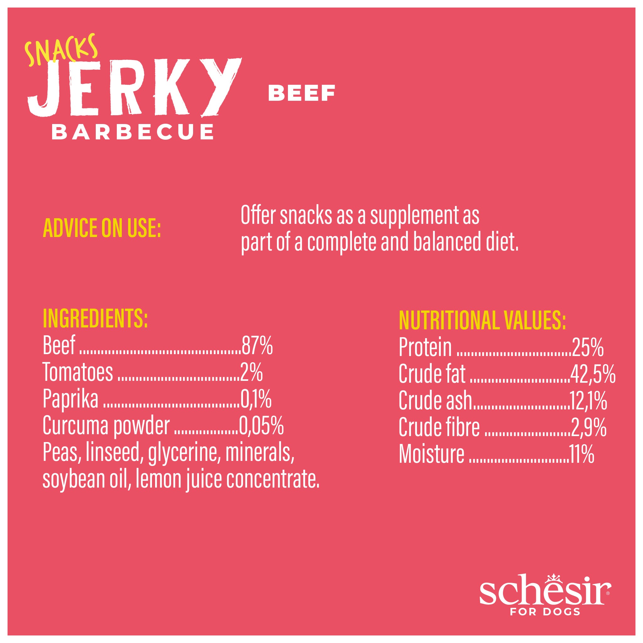 wołowina 87%, groch, siemię lniane, pomidory 2%, glicerol, minerały, olej sojowy, papryka 0,1%, koncentrat soku z cytryny, kurkuma w proszku 0,05%.