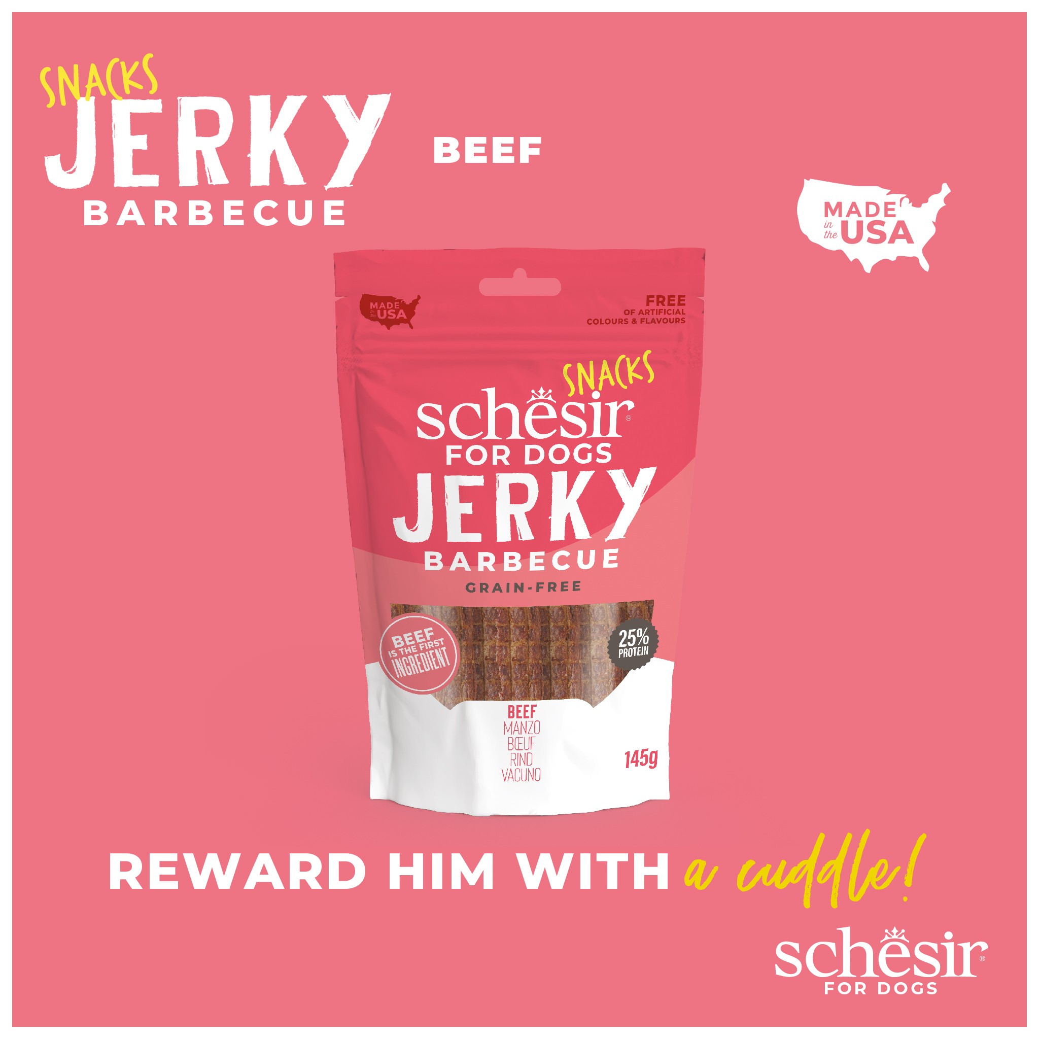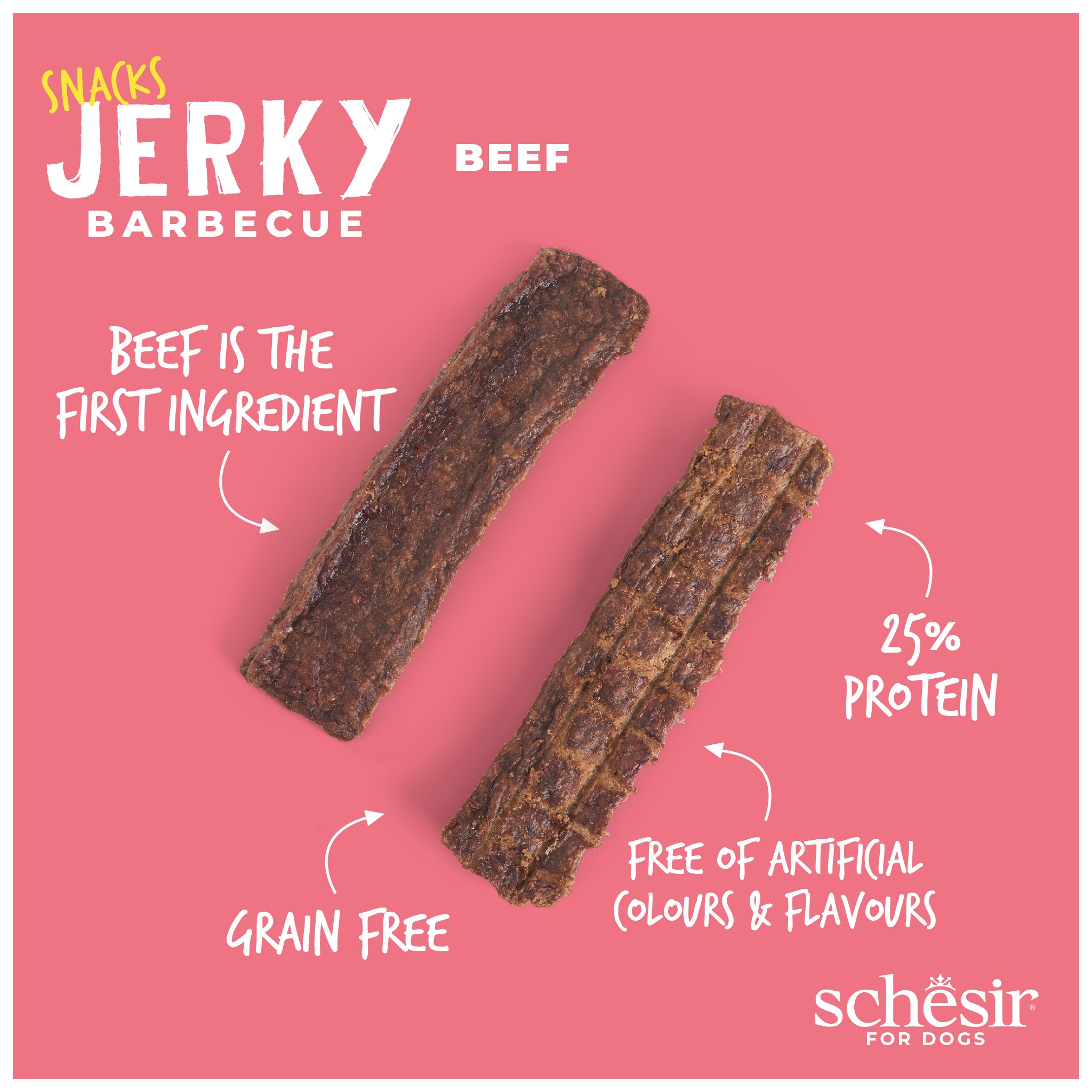 Jerky wołowe o smaku barbecue, z 25% zawartością białka. Smaczna i pyszna przekąska, idealna do rozpieszczania swojego futrzanego członka rodziny i wzmacniania Waszej wyjątkowej więzi.