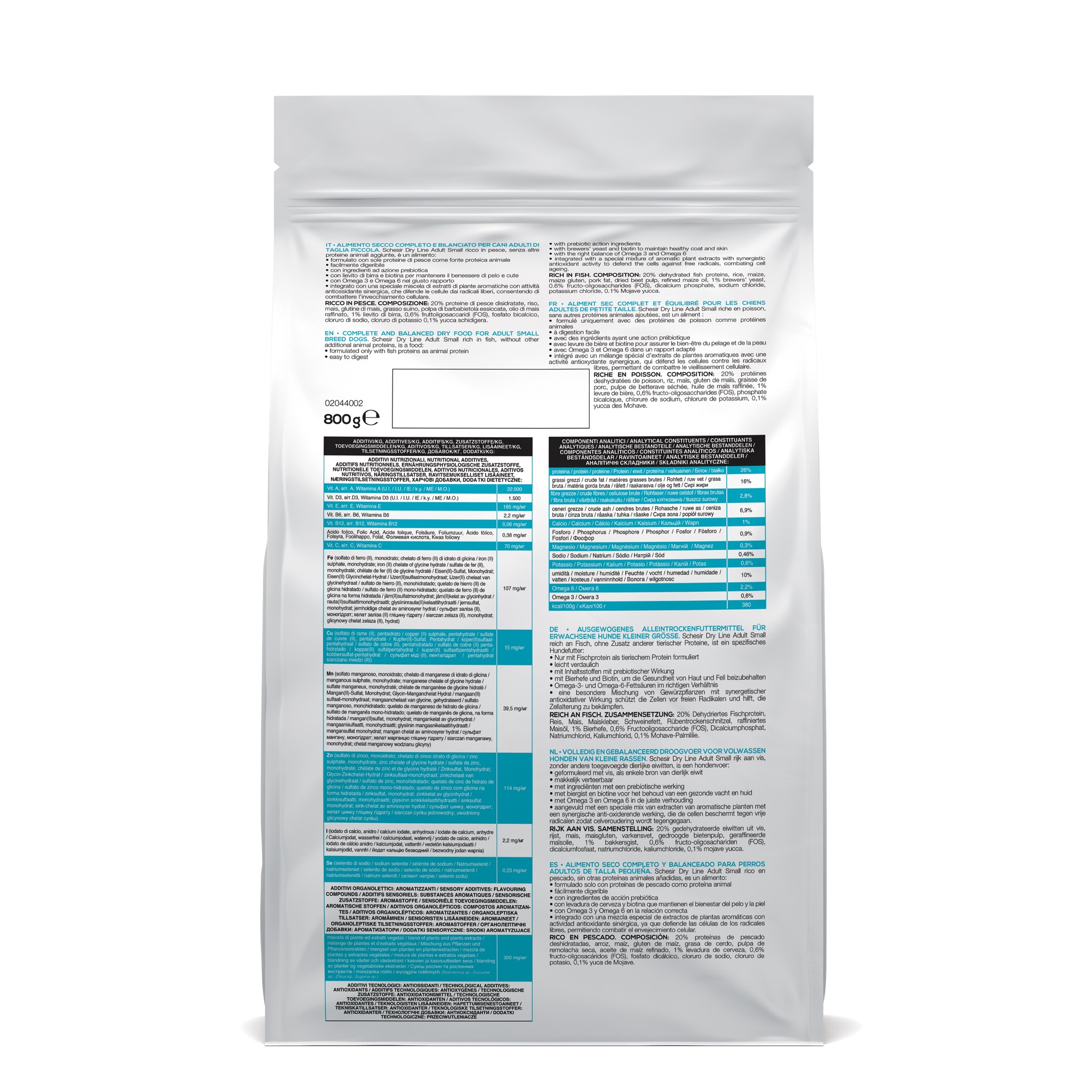 Formuła oparta na jednym źródle białka zwierzęcego (ryba), które jest również głównym składnikiem karmy, sprawia, że jest to smaczny, lekkostrawny, kompletny i zbilansowany posiłek zaspokajający potrzeby żywieniowe dorosłych małych psów wszystkich ras.