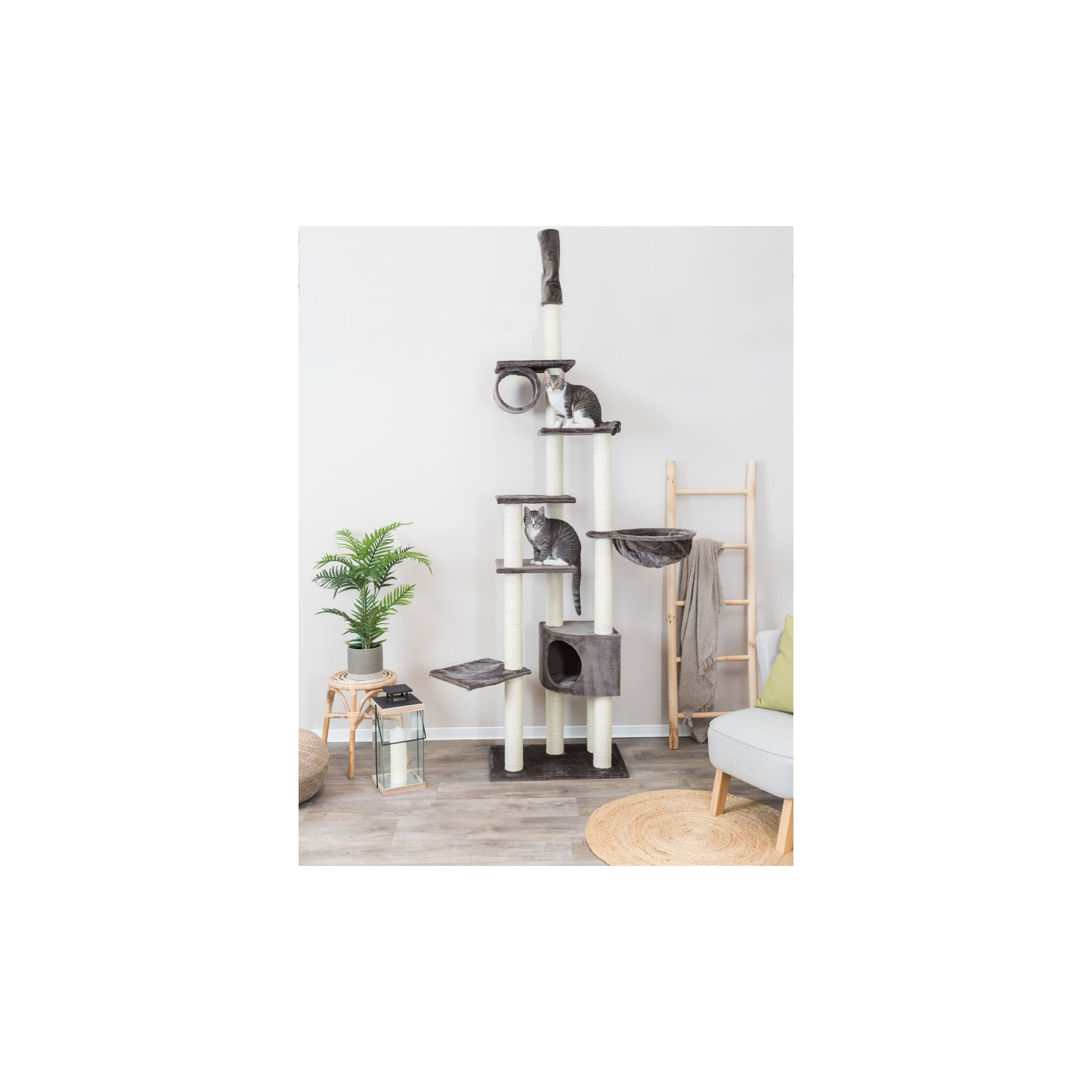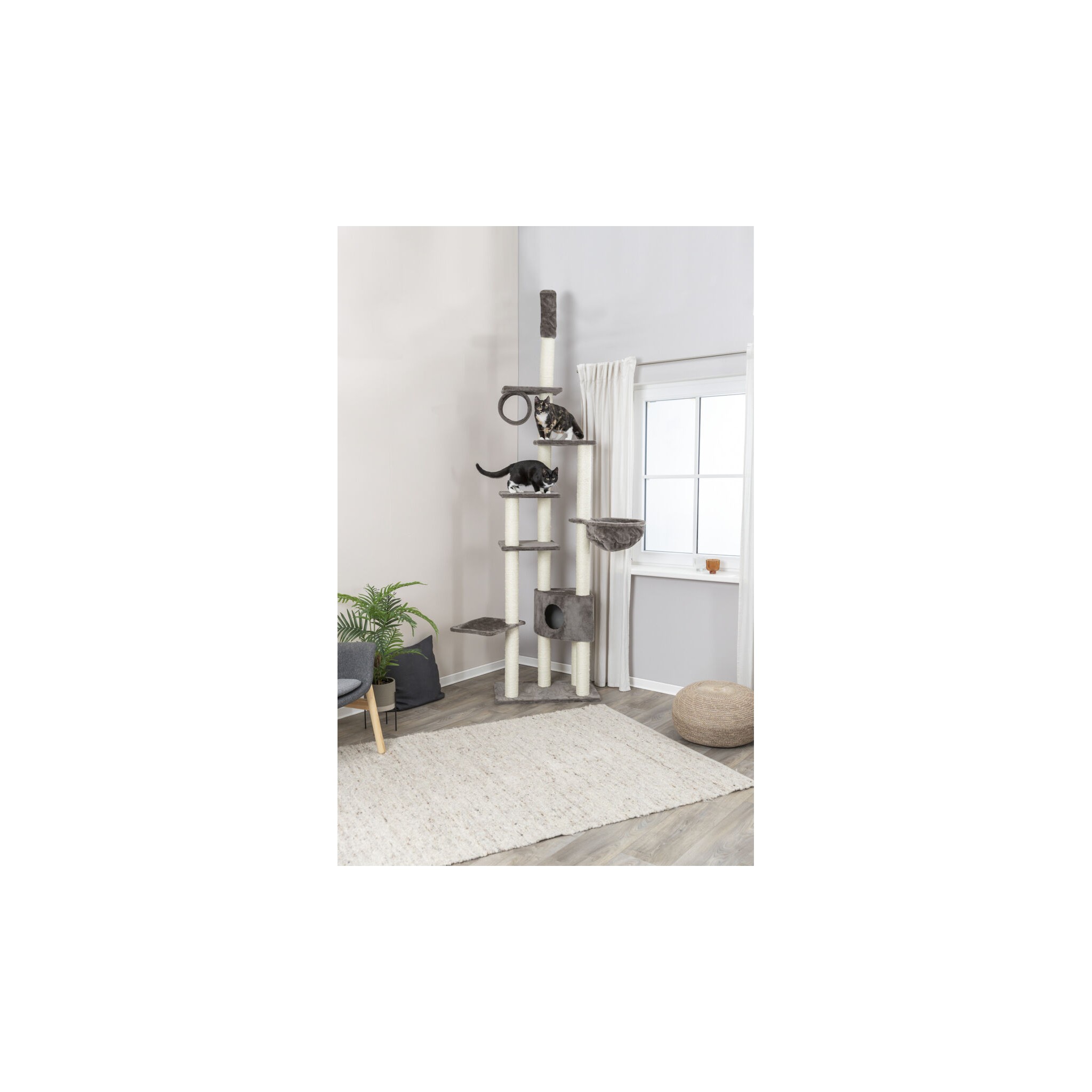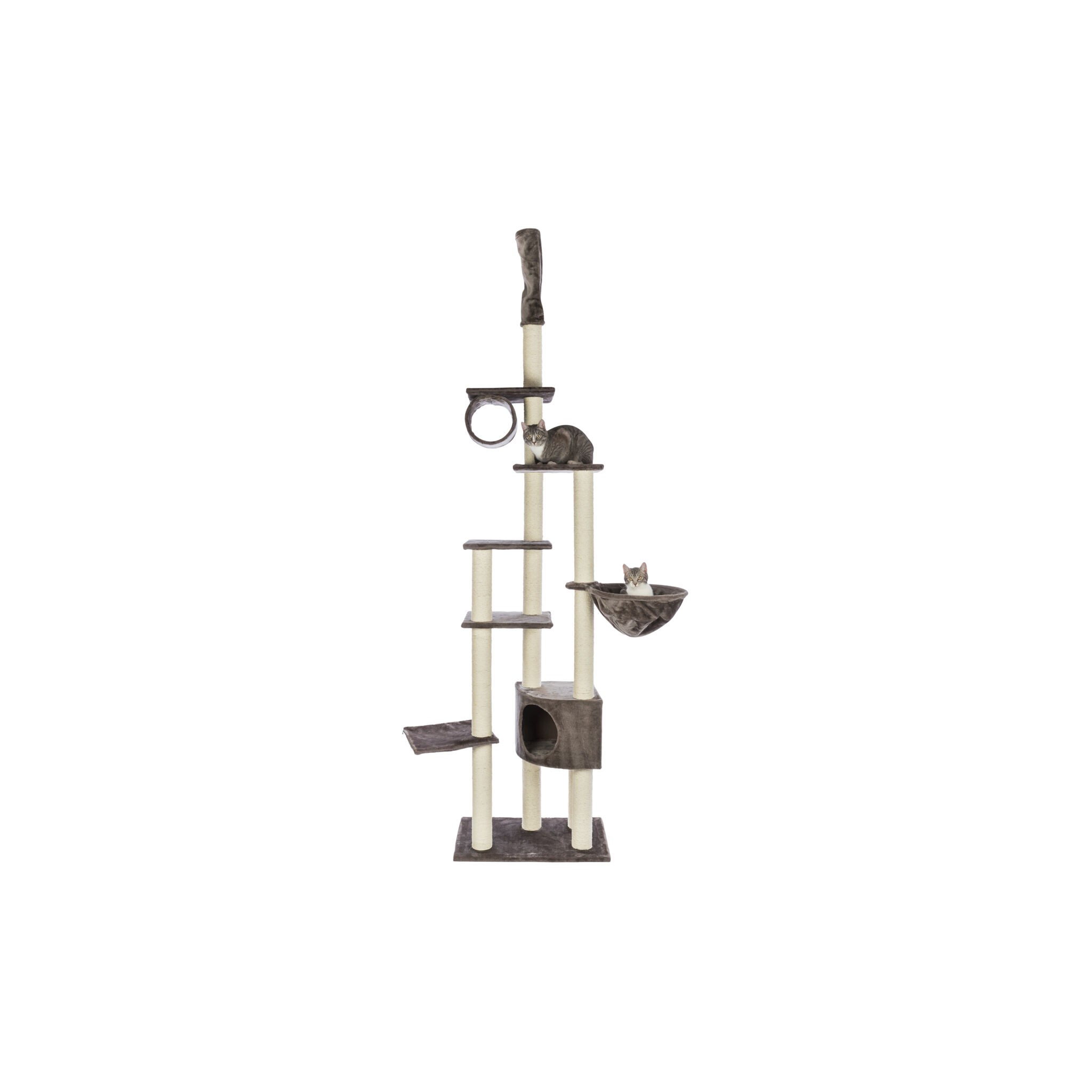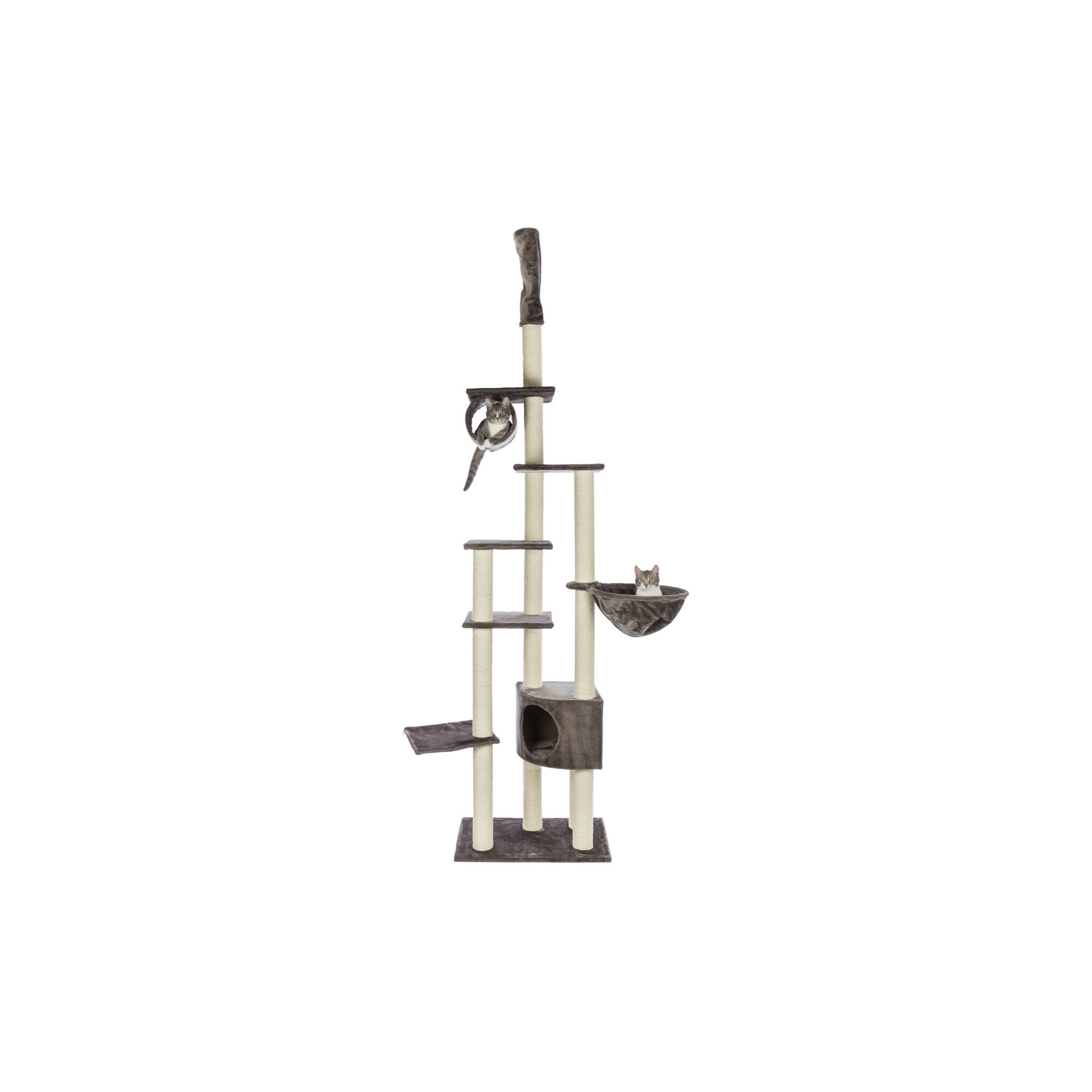 Drapak stojący Madrid to niezwykle stabilne i wysokiej jakości miejsce do wspinaczki oraz pielęgnacji pazurków dla Twojego kota. Obudowany trwałym sizalem o grubości 6 mm, zapewnia idealną powierzchnię do drapania. Tkanina pluszowa (240 g/m²) gwarantuje dodatkowy komfort, będąc jednocześnie delikatnym w dotyku. Model ten jest wyposażony w praktyczne mocowanie sufitowe, co zwiększa stabilność konstrukcji. Legowisko wyściełane miękkim pluszem zapewnia kotu wygodne miejsce do odpoczynku. Drapak prezentuje się w eleganckim, szarym kolorze platynowym, który będzie pasował do wielu wnętrz.
