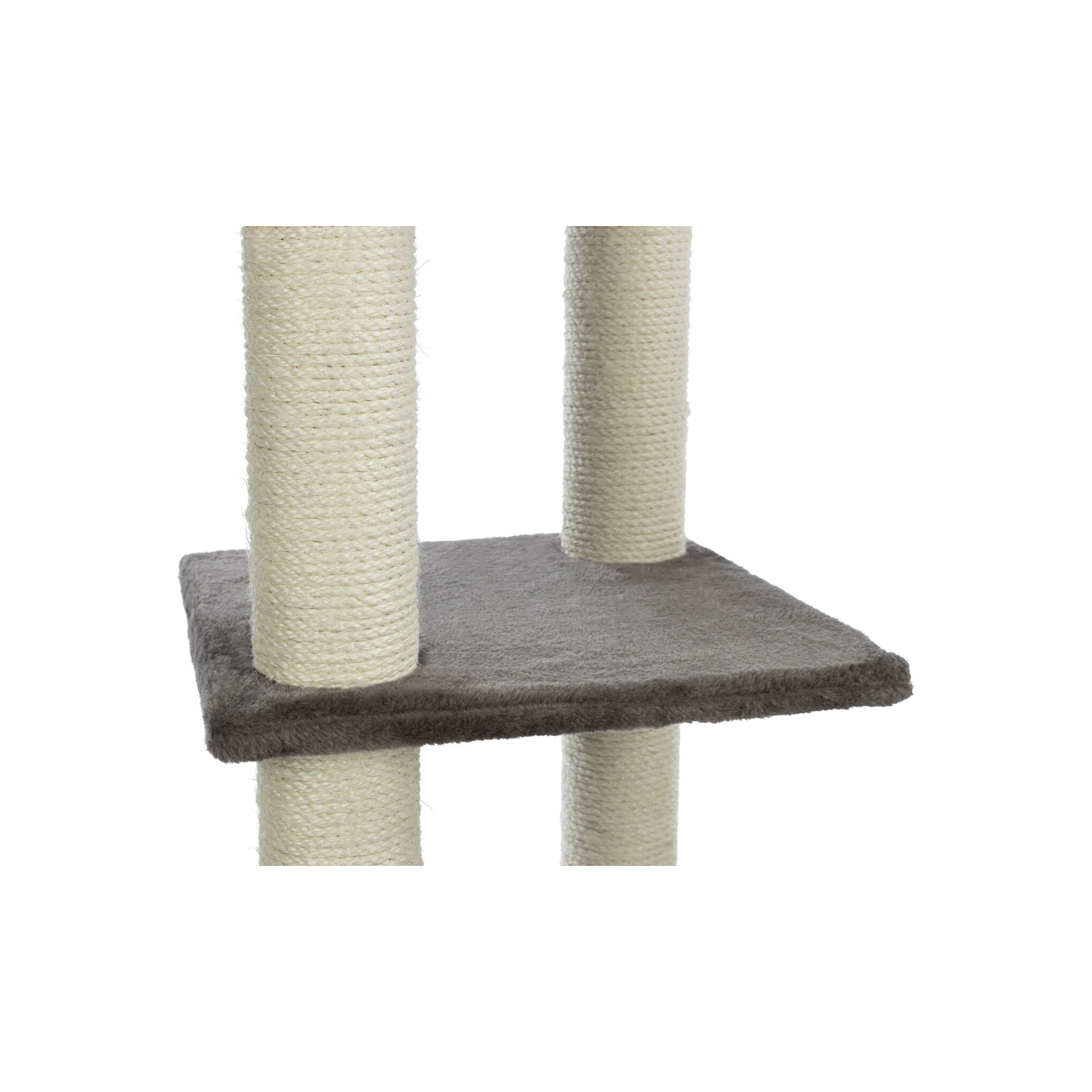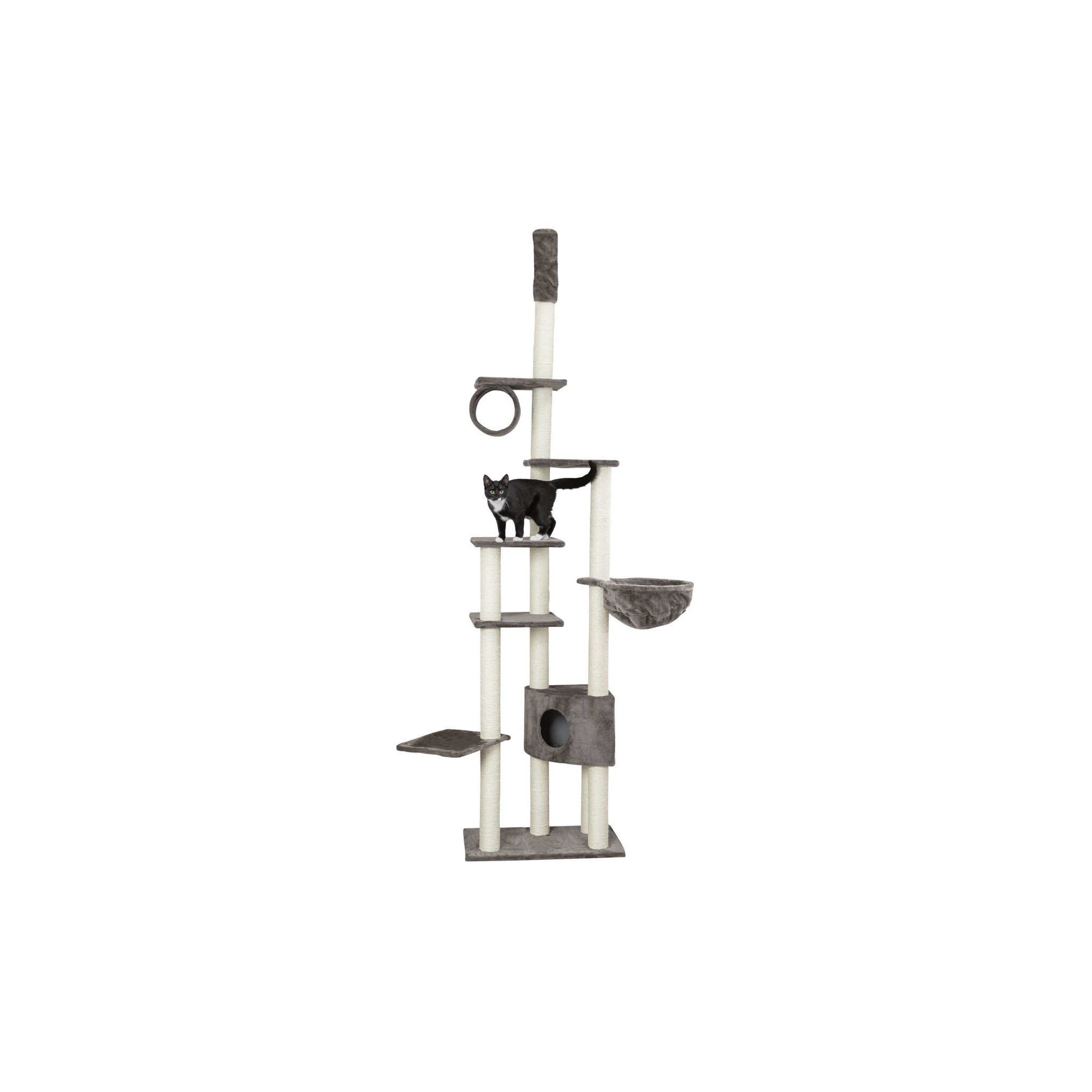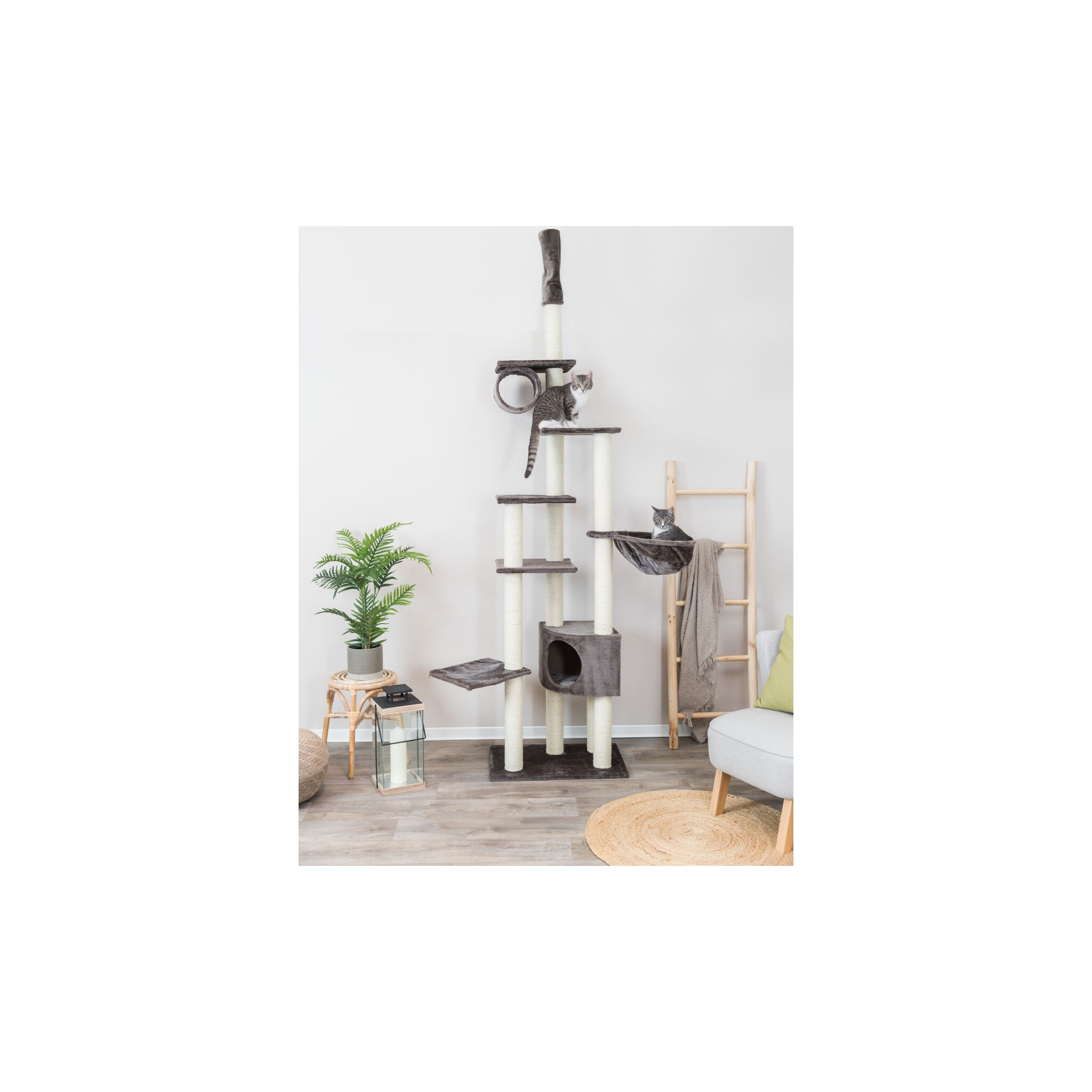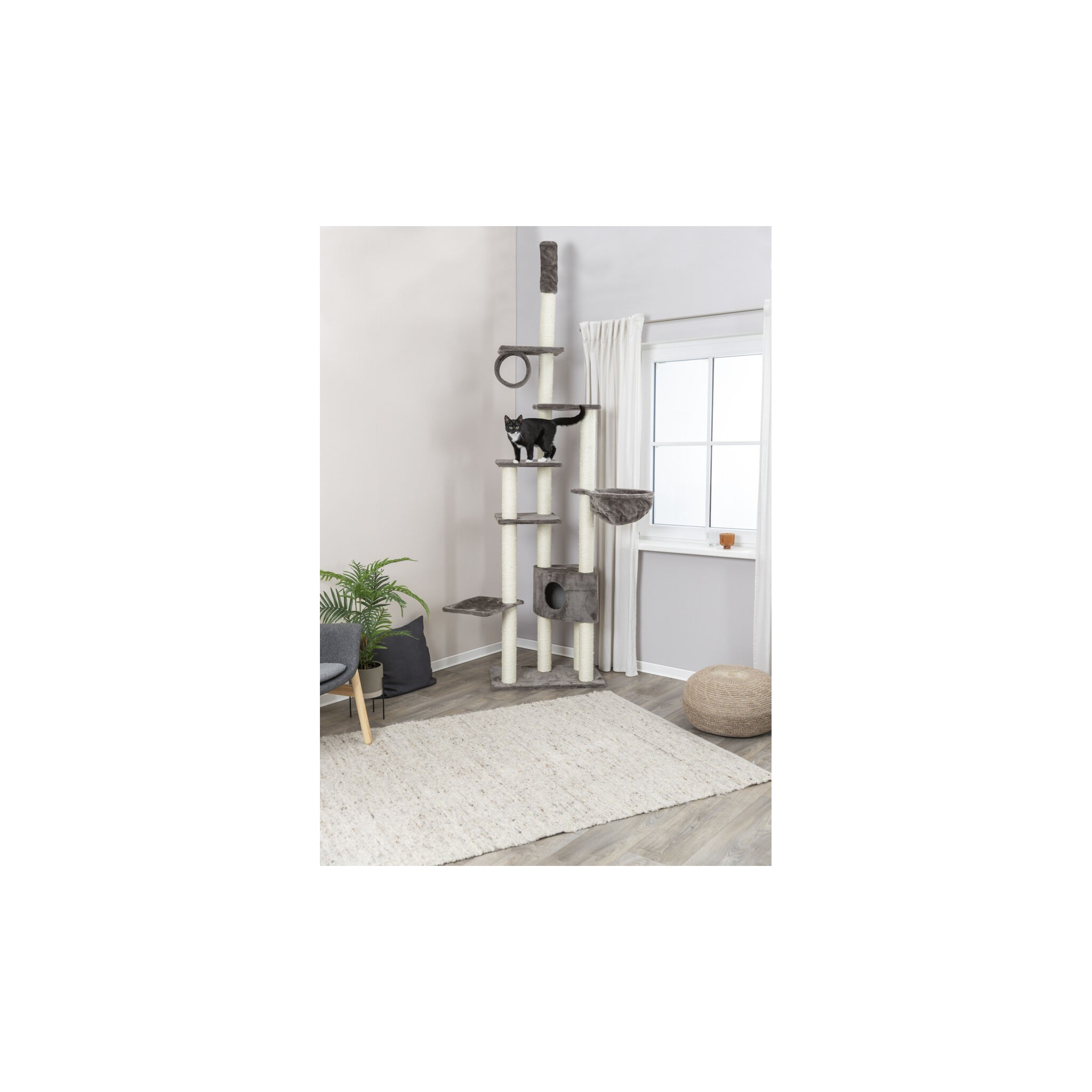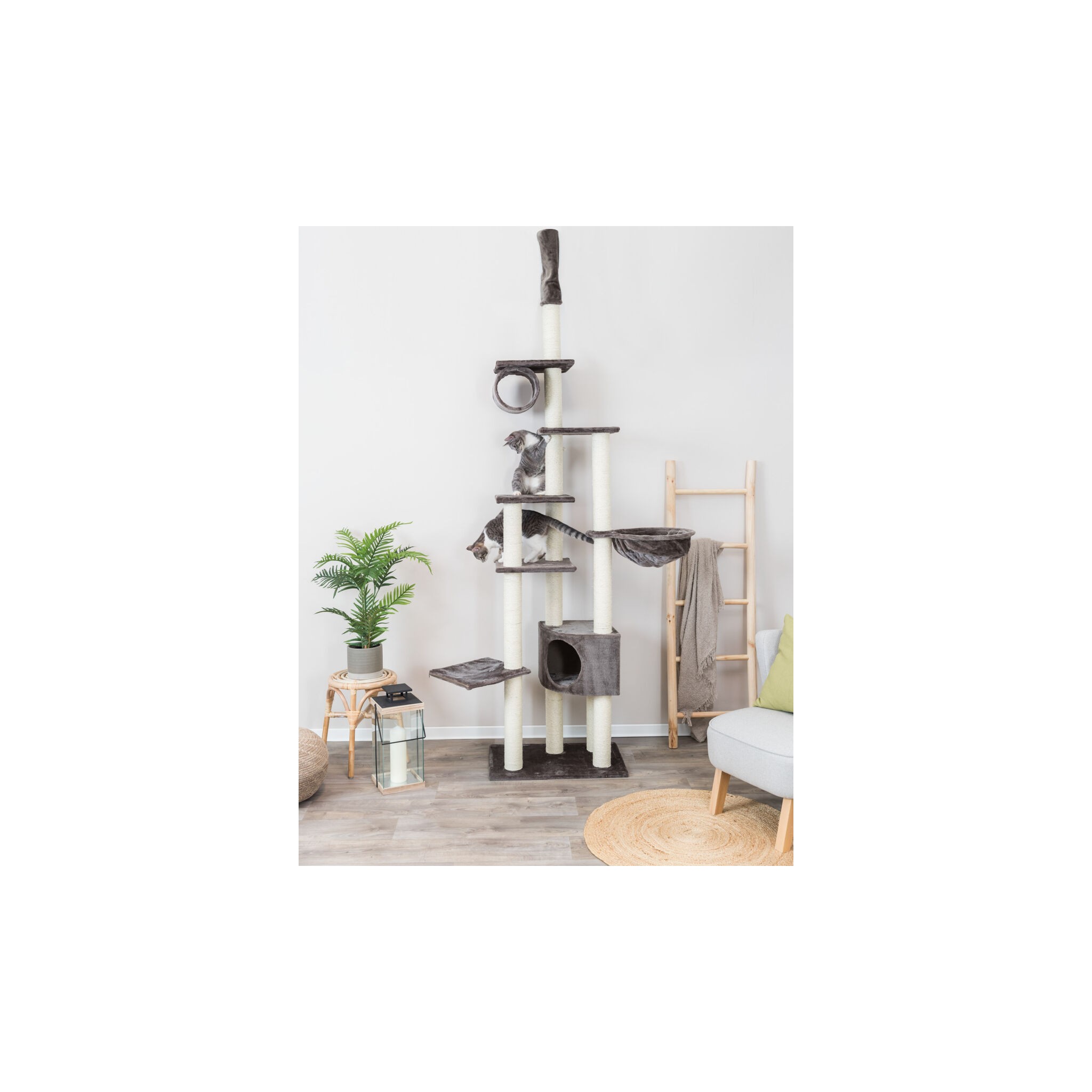 Drapak stojący Madrid to niezwykle stabilne i wysokiej jakości miejsce do wspinaczki oraz pielęgnacji pazurków dla Twojego kota. Obudowany trwałym sizalem o grubości 6 mm, zapewnia idealną powierzchnię do drapania. Tkanina pluszowa (240 g/m²) gwarantuje dodatkowy komfort, będąc jednocześnie delikatnym w dotyku. Model ten jest wyposażony w praktyczne mocowanie sufitowe, co zwiększa stabilność konstrukcji. Legowisko wyściełane miękkim pluszem zapewnia kotu wygodne miejsce do odpoczynku. Drapak prezentuje się w eleganckim, szarym kolorze platynowym, który będzie pasował do wielu wnętrz.