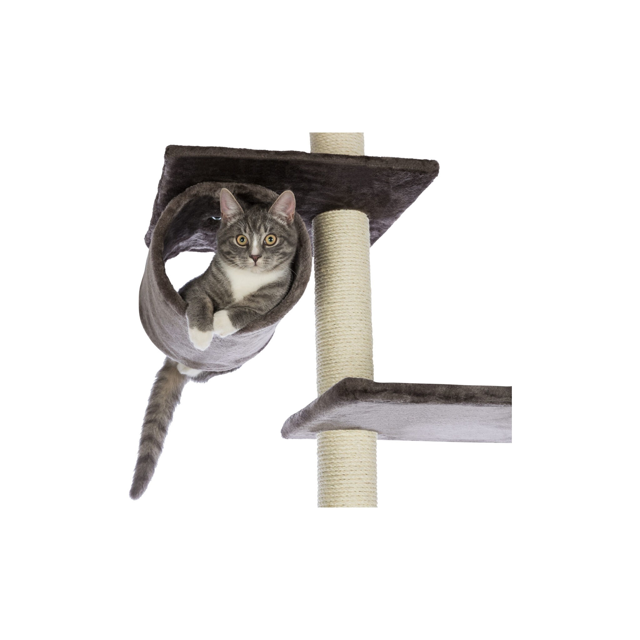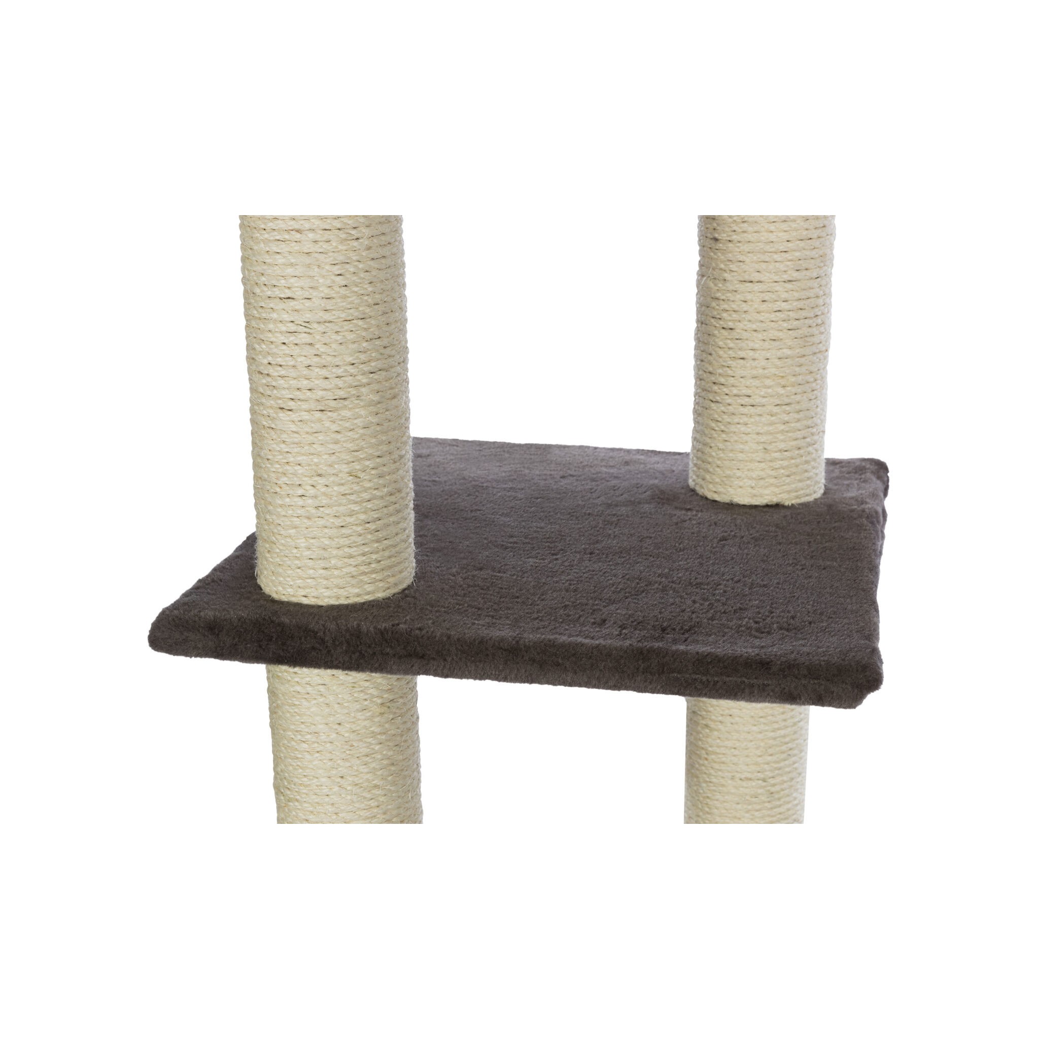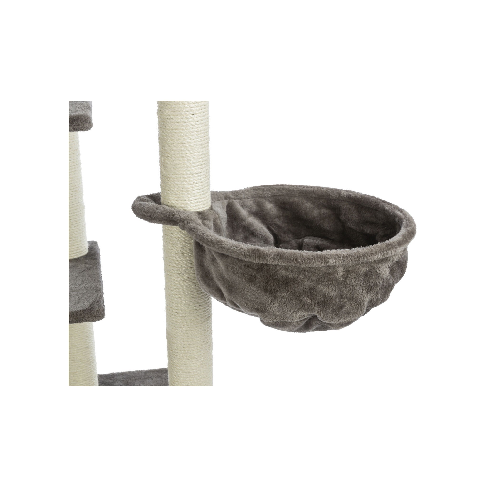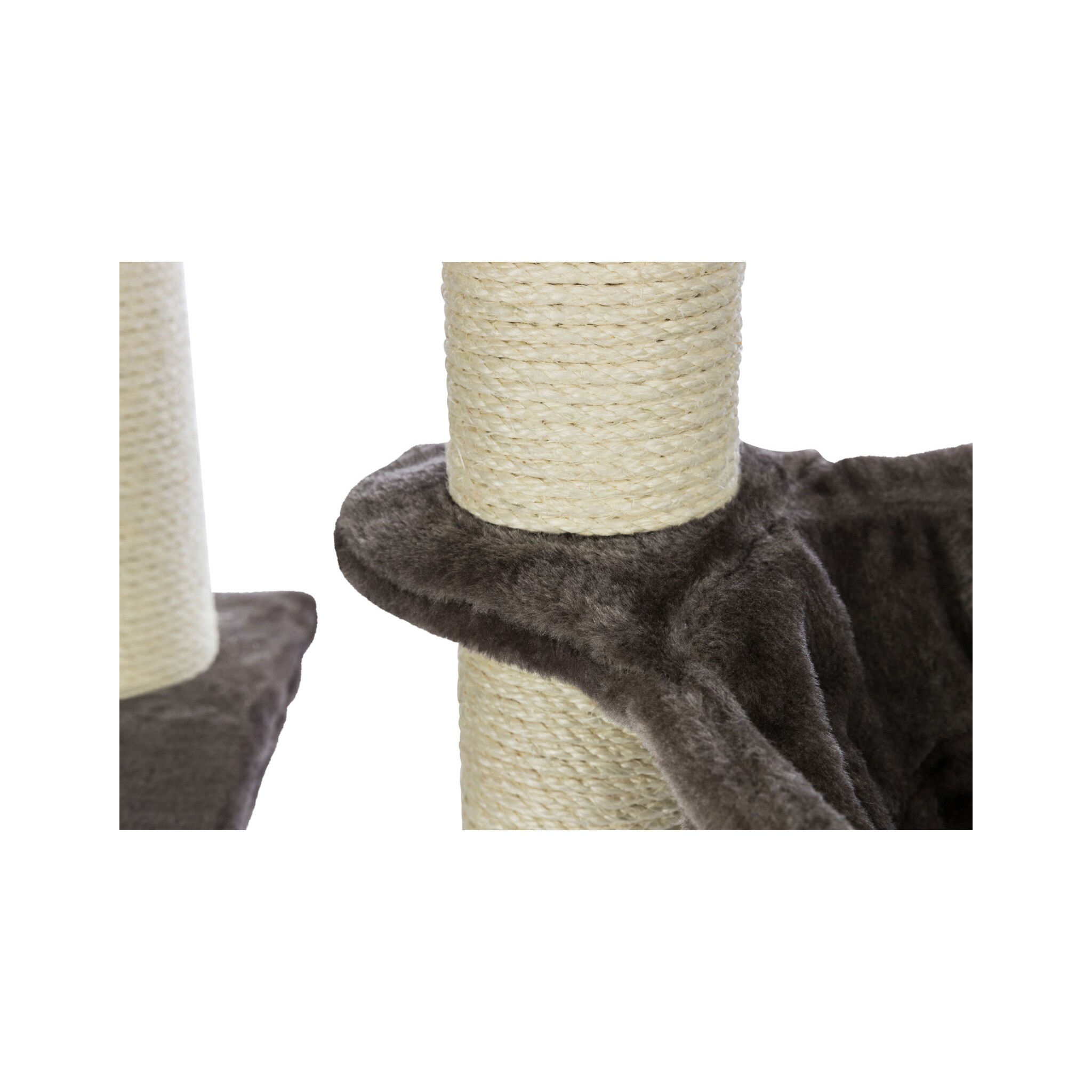 Drapak stojący Madrid to niezwykle stabilne i wysokiej jakości miejsce do wspinaczki oraz pielęgnacji pazurków dla Twojego kota. Obudowany trwałym sizalem o grubości 6 mm, zapewnia idealną powierzchnię do drapania. Tkanina pluszowa (240 g/m²) gwarantuje dodatkowy komfort, będąc jednocześnie delikatnym w dotyku. Model ten jest wyposażony w praktyczne mocowanie sufitowe, co zwiększa stabilność konstrukcji. Legowisko wyściełane miękkim pluszem zapewnia kotu wygodne miejsce do odpoczynku. Drapak prezentuje się w eleganckim, szarym kolorze platynowym, który będzie pasował do wielu wnętrz.
