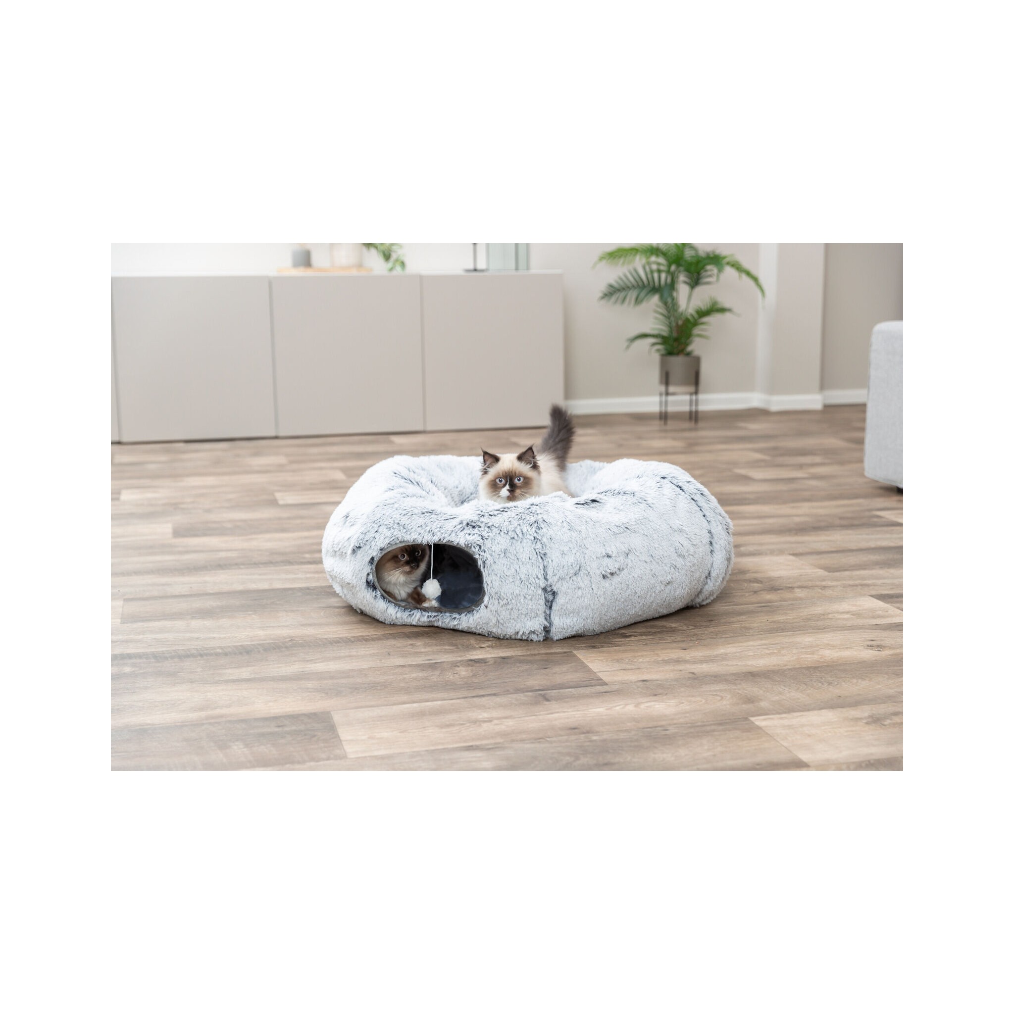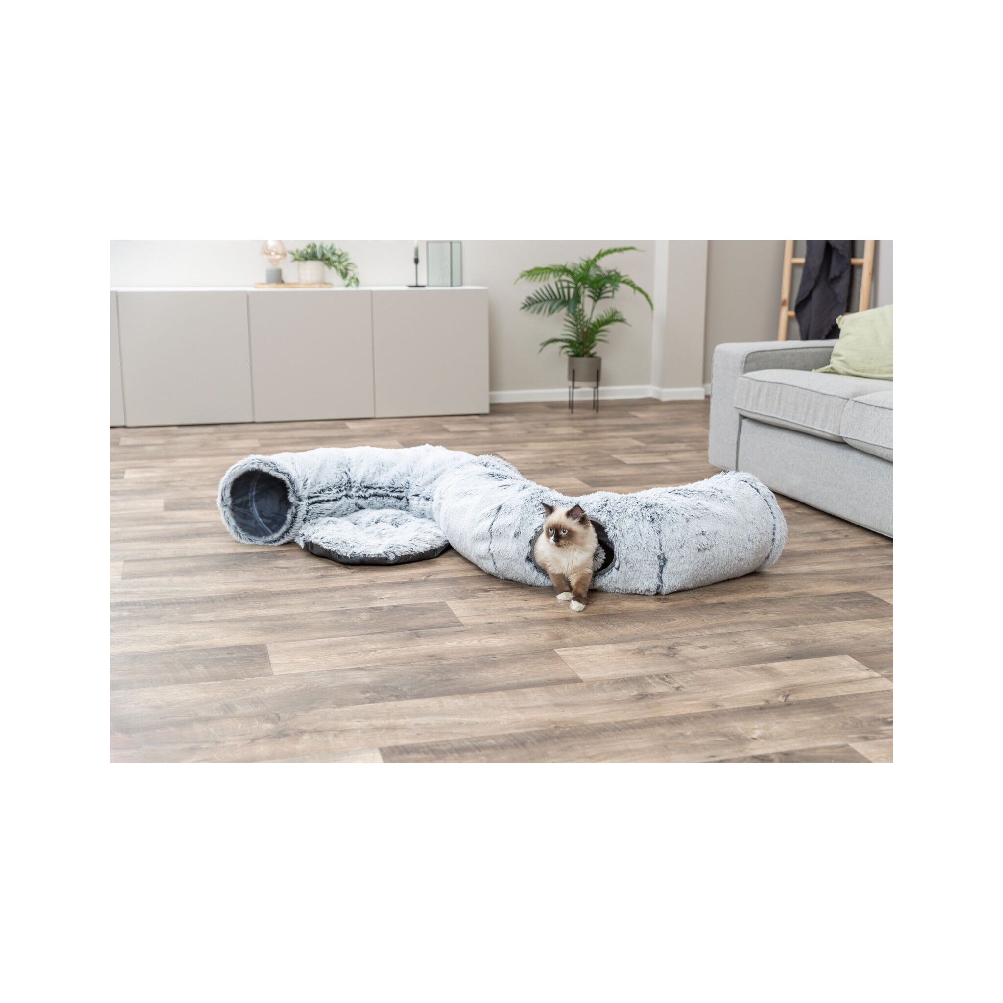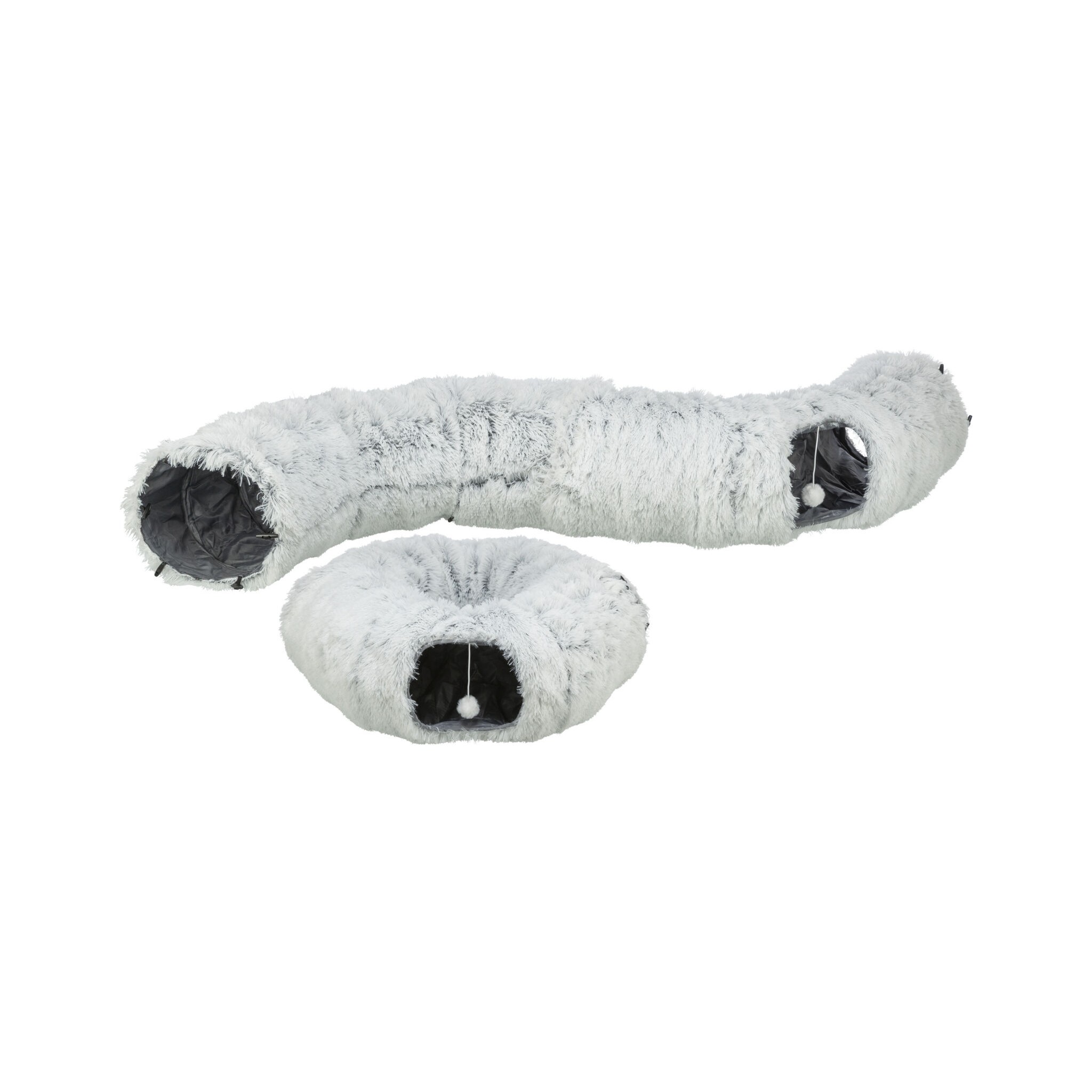Tunel do zabawy Harvey to atrakcyjna zabawka dla Twojego kota, wykonana z miękkiego imitacji zamszu i pluszu z poliestru. Posiada powierzchnię do leżenia i może być ustawiony na dwa sposoby: jako pączek lub jako tunel w kształcie litery S, dzięki czemu zapewnia różne formy zabawy. Wyposażony jest w cztery wejścia, co umożliwia kotu swobodne poruszanie się i eksplorację. Dodatkowo, w zestawie znajduje się zabawka na sznurku, która zachęca do aktywności i interakcji.