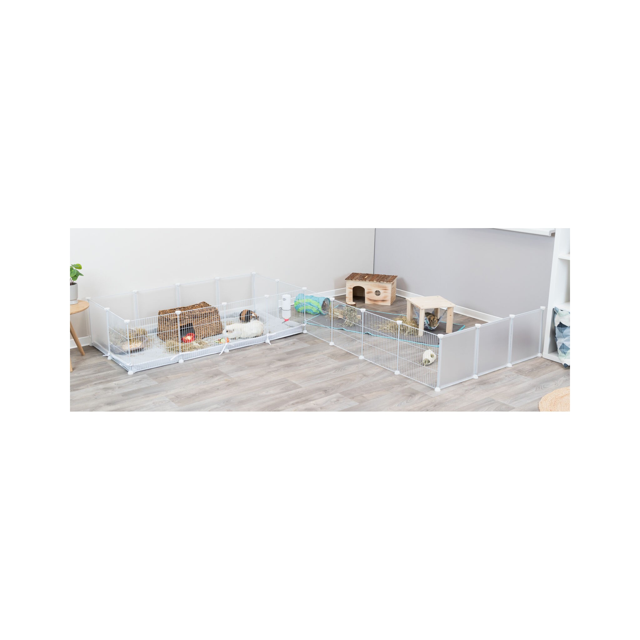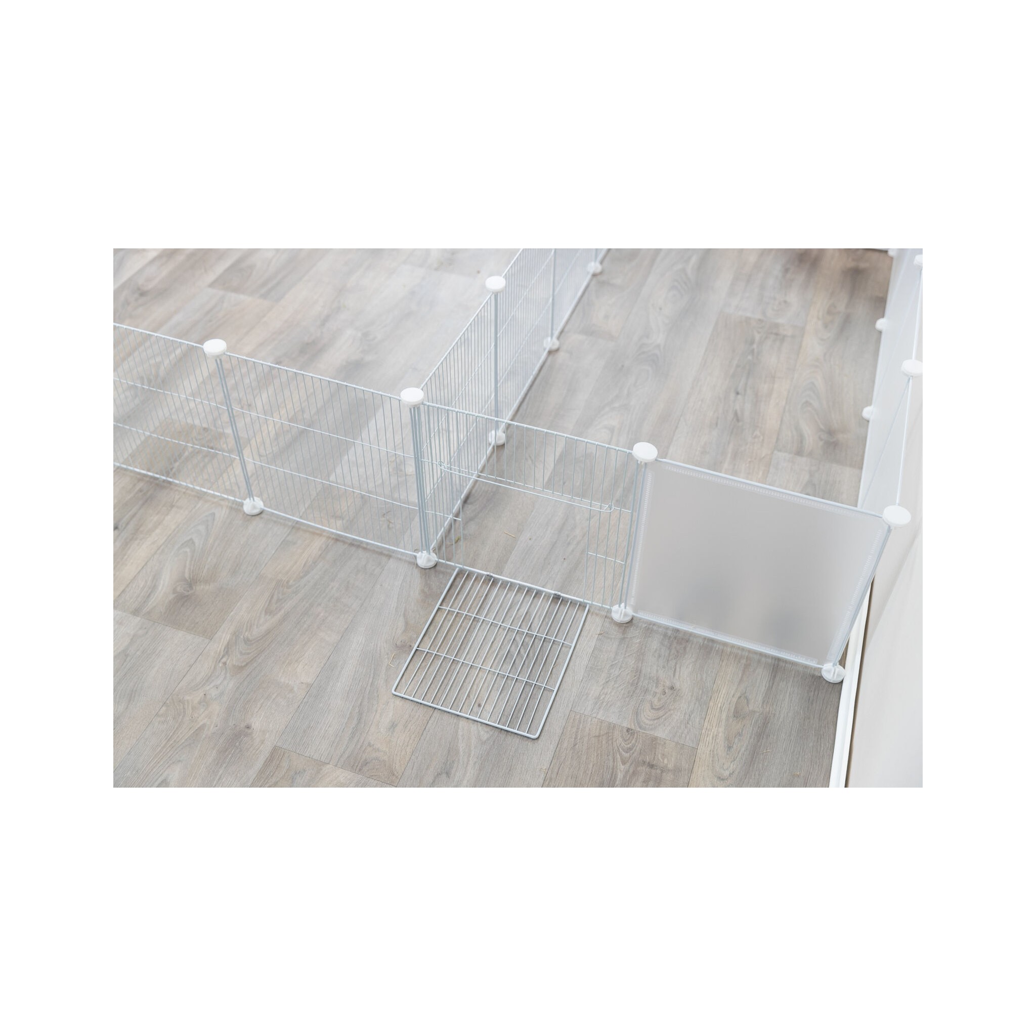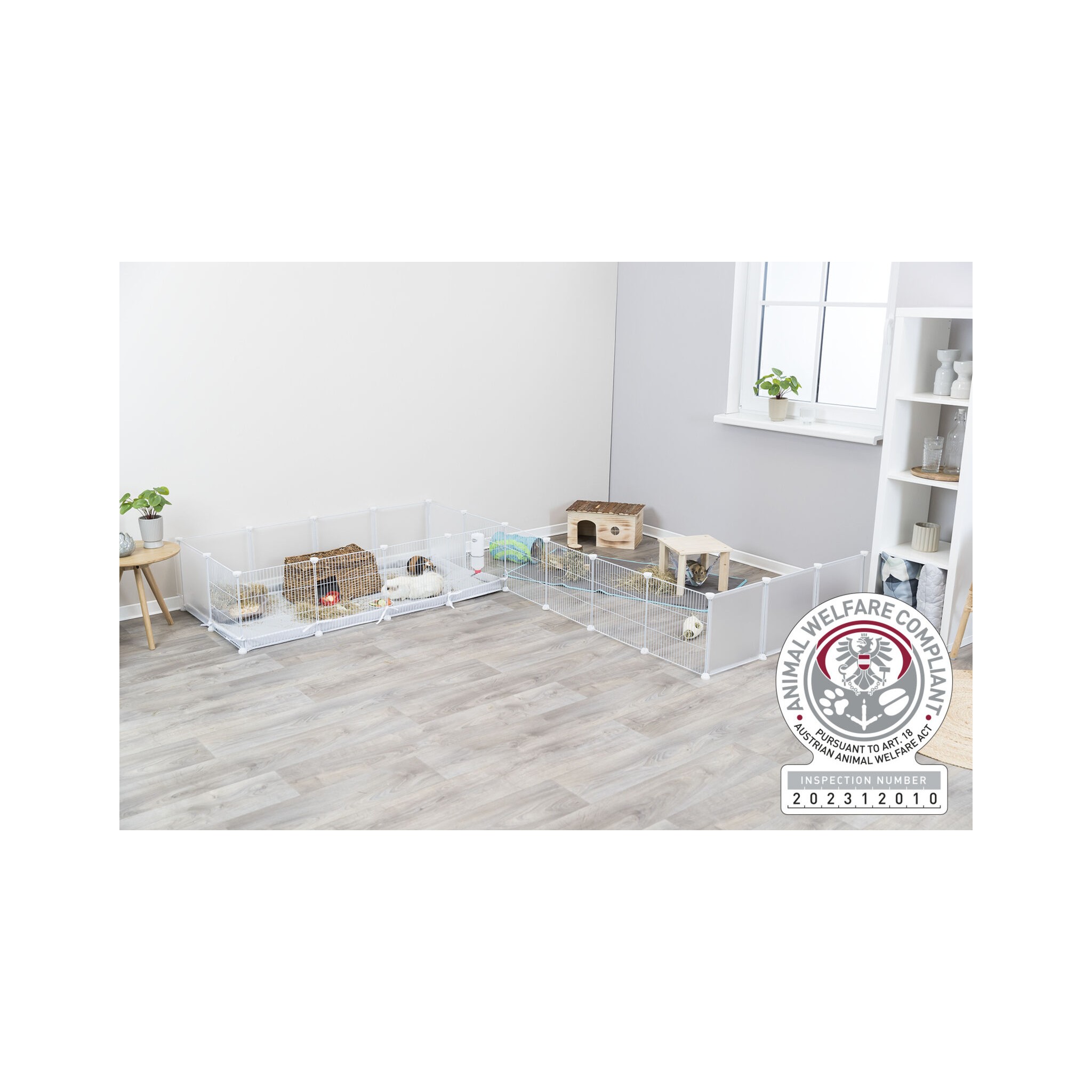 Elementy przedłużający do wybiegu domowego są idealne dla właścicieli królików i gryzoni, którzy chcą stworzyć dodatkową przestrzeń dla swoich pupili. Zestaw składa się z 4 elementów o wymiarach 35 × 35 cm wraz z akcesoriami montażowymi, co pozwala na elastyczne dopasowanie do istniejącego wybiegu. Elementy można montować i rozszerzać na różne sposoby, zapewniając różnorodne konfiguracje dla zwierząt. Co ważne, produkt jest zgodny z ustawą o ochronie zwierząt - §18 (AT), co stanowi dodatkowe zabezpieczenie dla zwierząt.