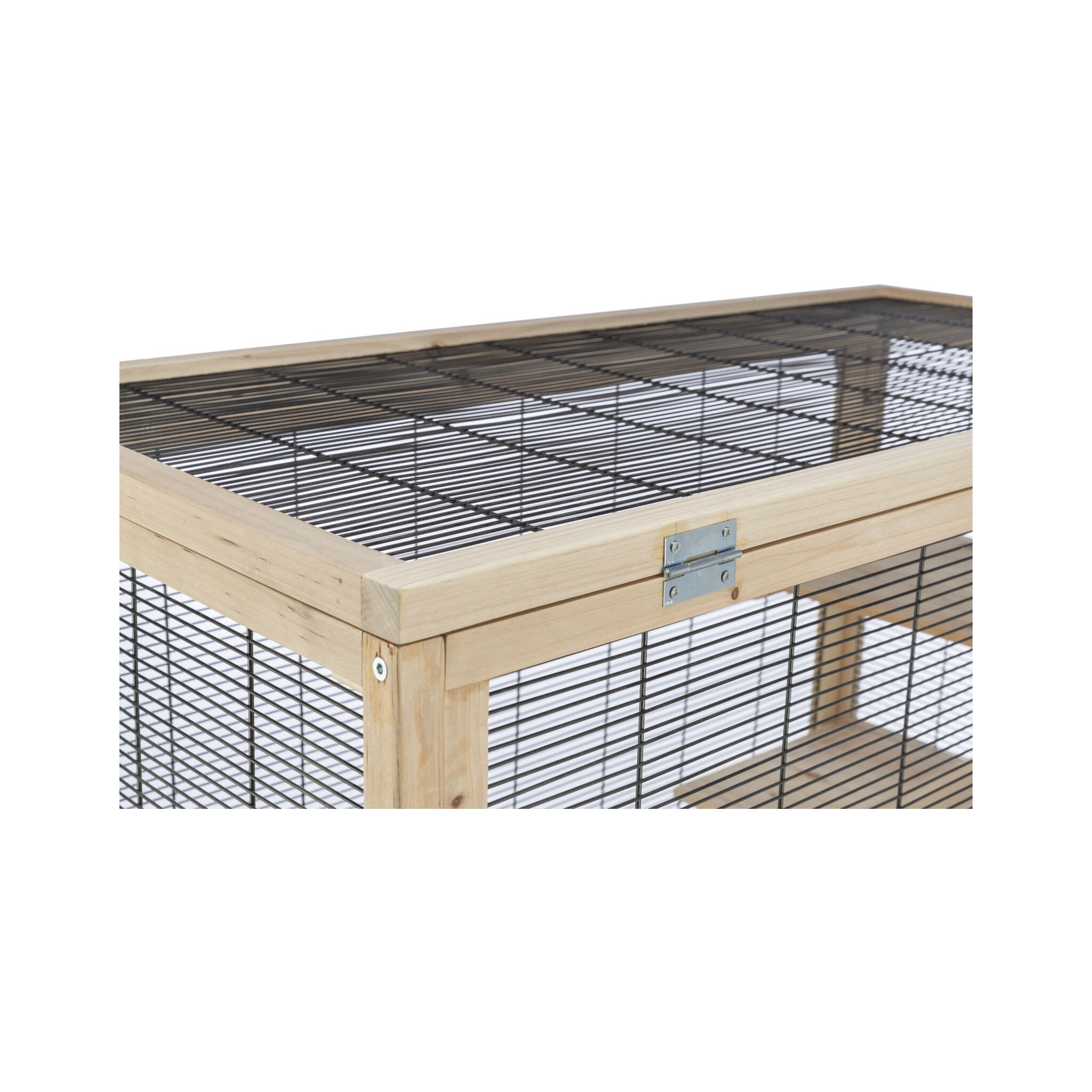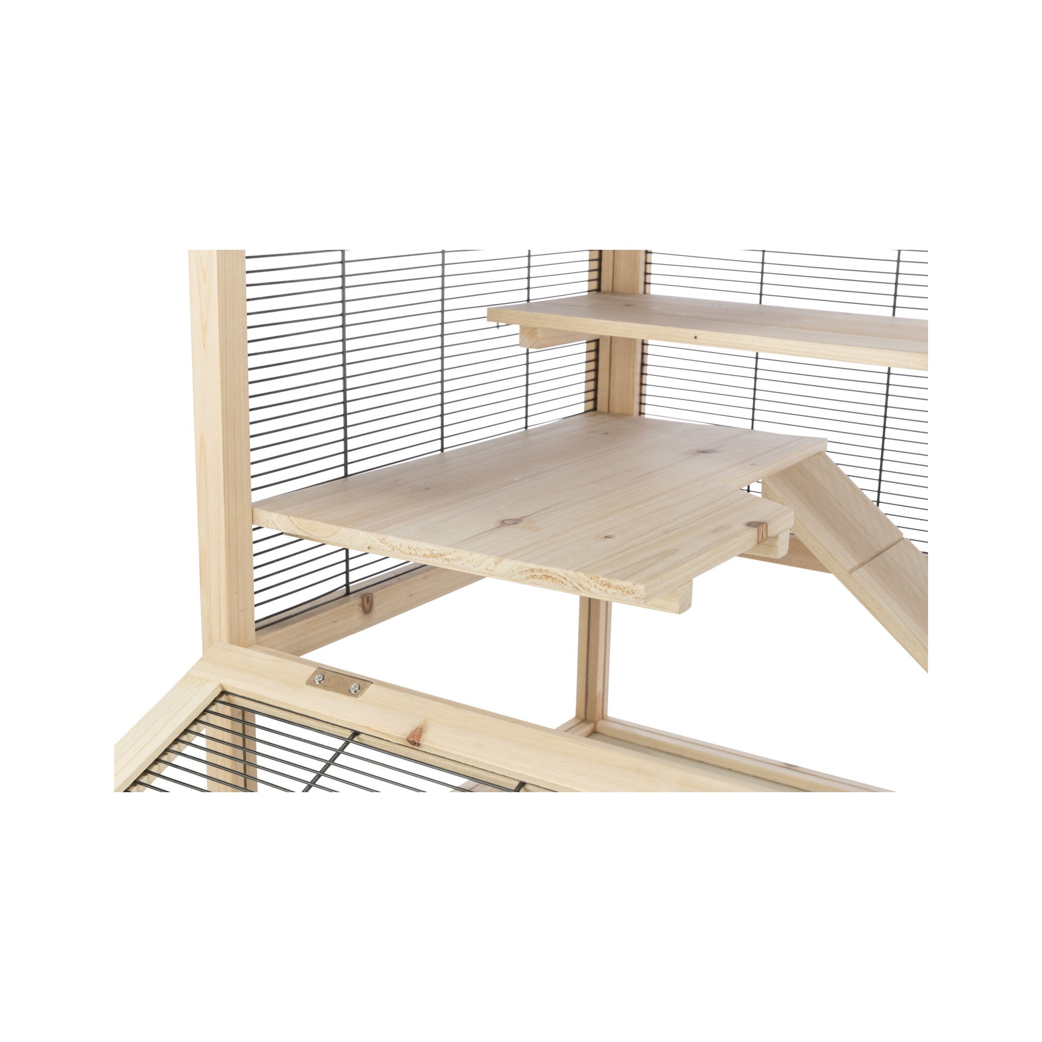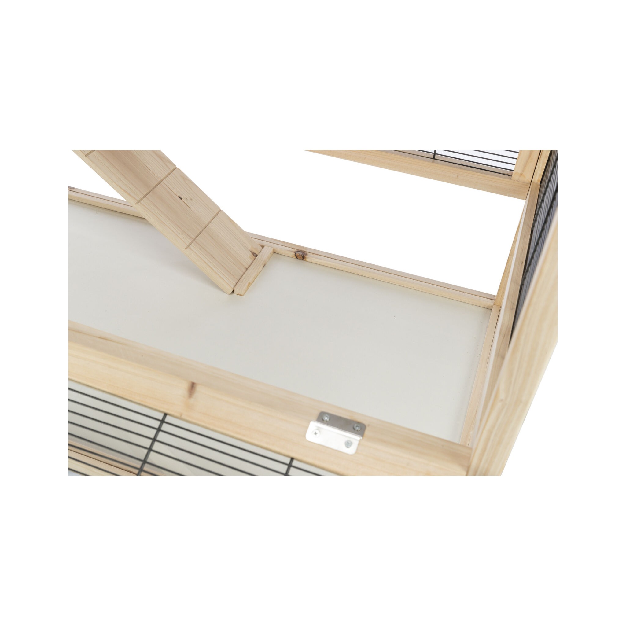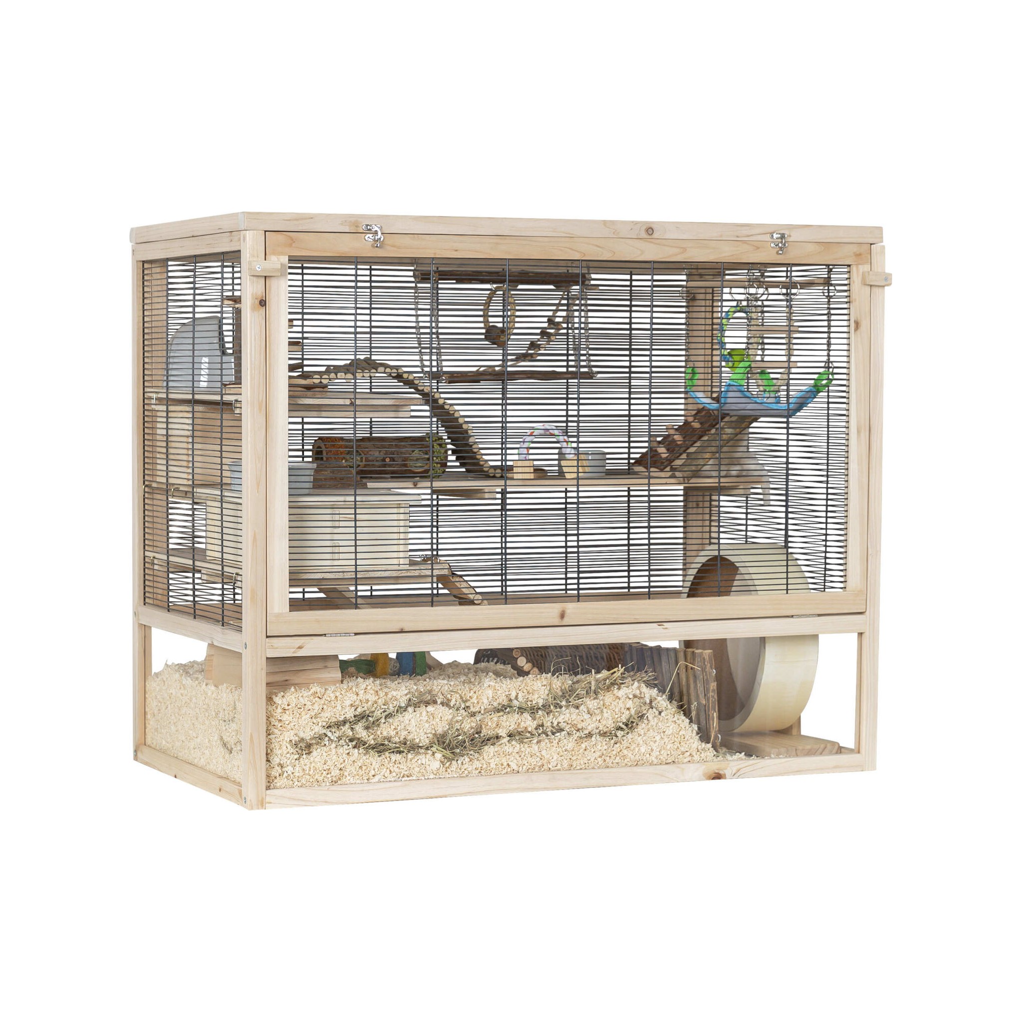 Klatka dla gryzoni z akrylową szybą do oglądania zwierząt, różnymi poziomami umożliwiającymi zróżnicowaną konfigurację, dolnym panelem przednim umożliwiającym wysokie wypełnienie ściółką do kopania i budowania norek, frontowym panelem na zawiasach dla łatwego czyszczenia i karmienia, pokrywą otwieraną od góry i bezpiecznie zamykaną, metalową kratką umożliwiającą powieszenie elementów do wspinania, łatwym montażem oraz wykonana z drewna, metalu i akrylu. Klatka jest zgodna z ustawą o ochronie zwierząt - §18 (AT).