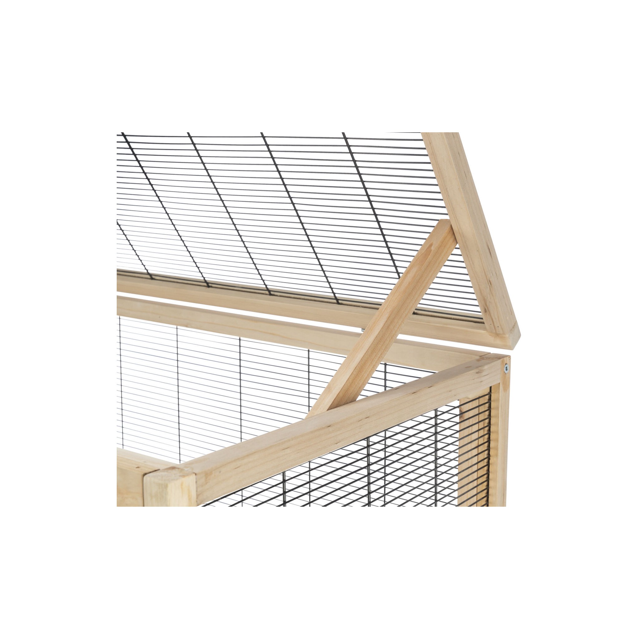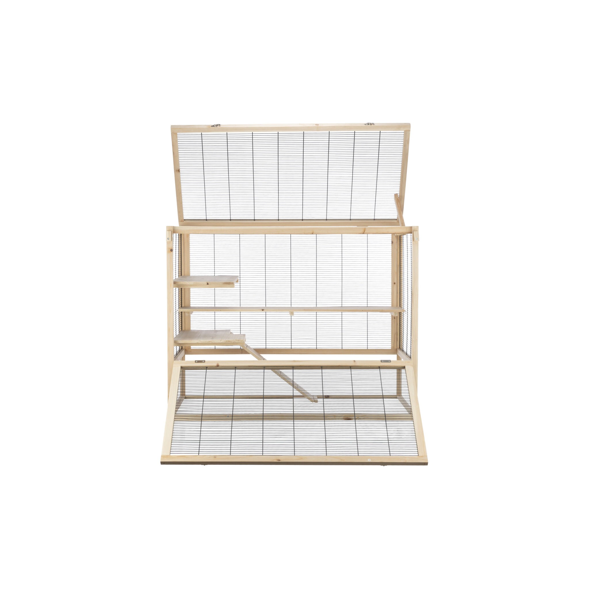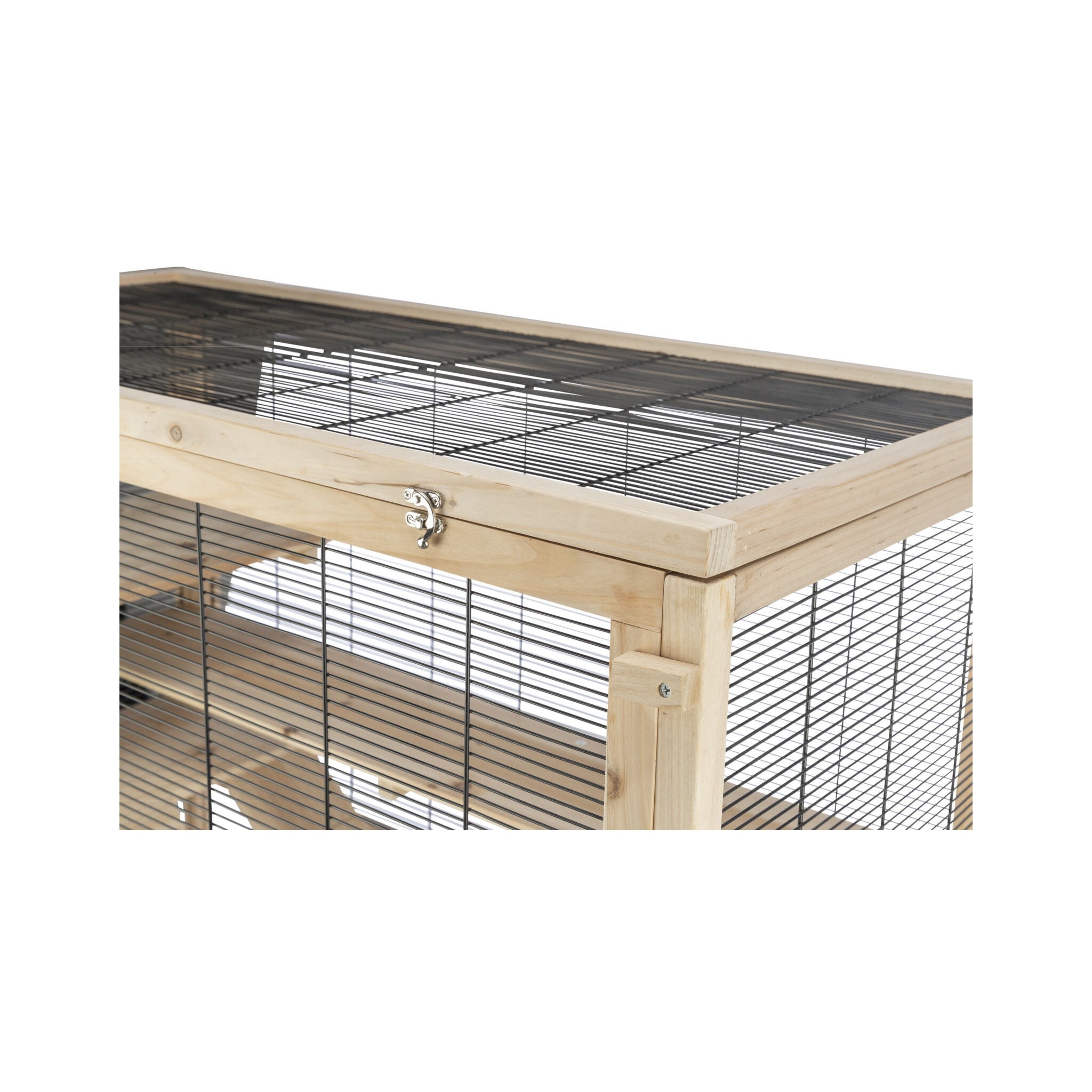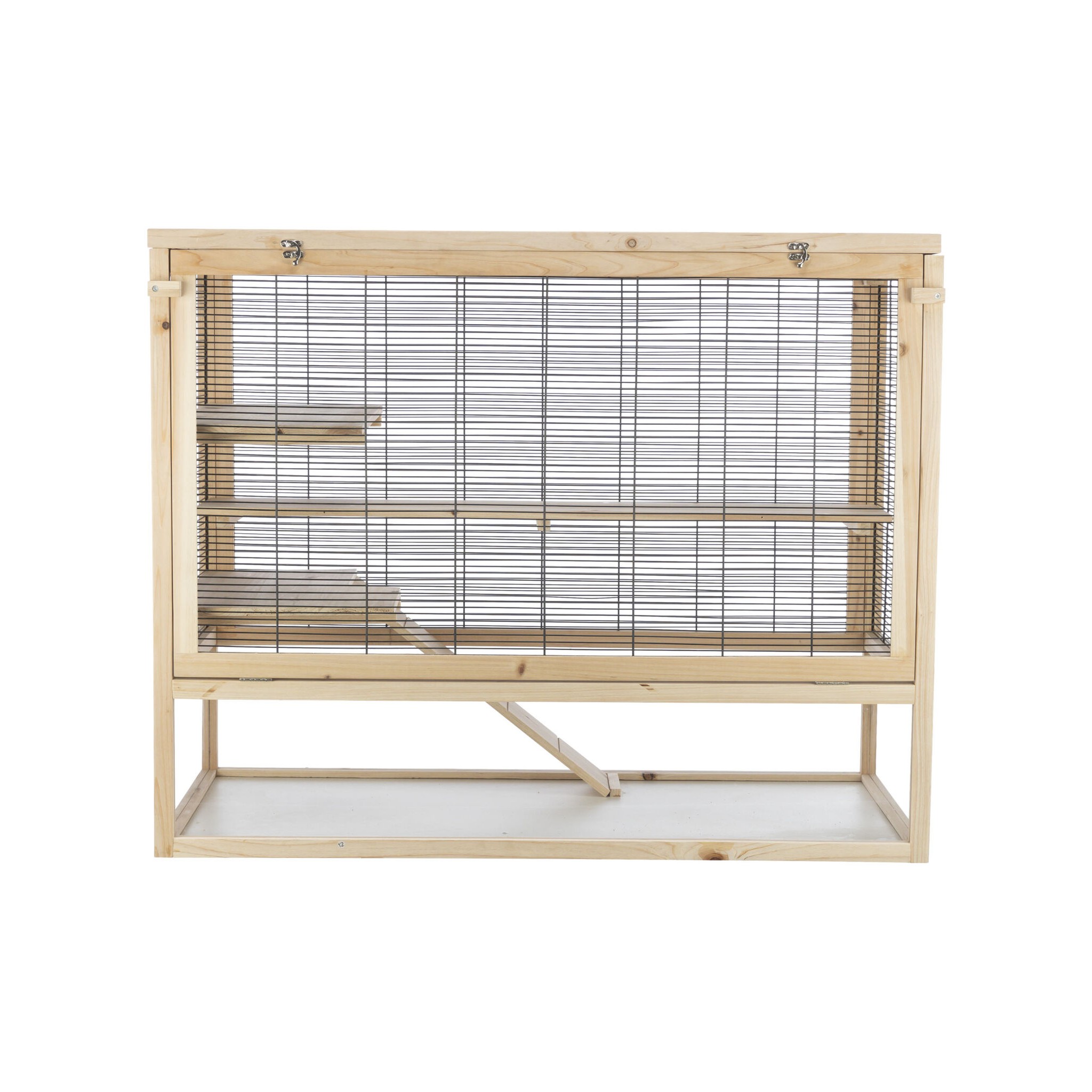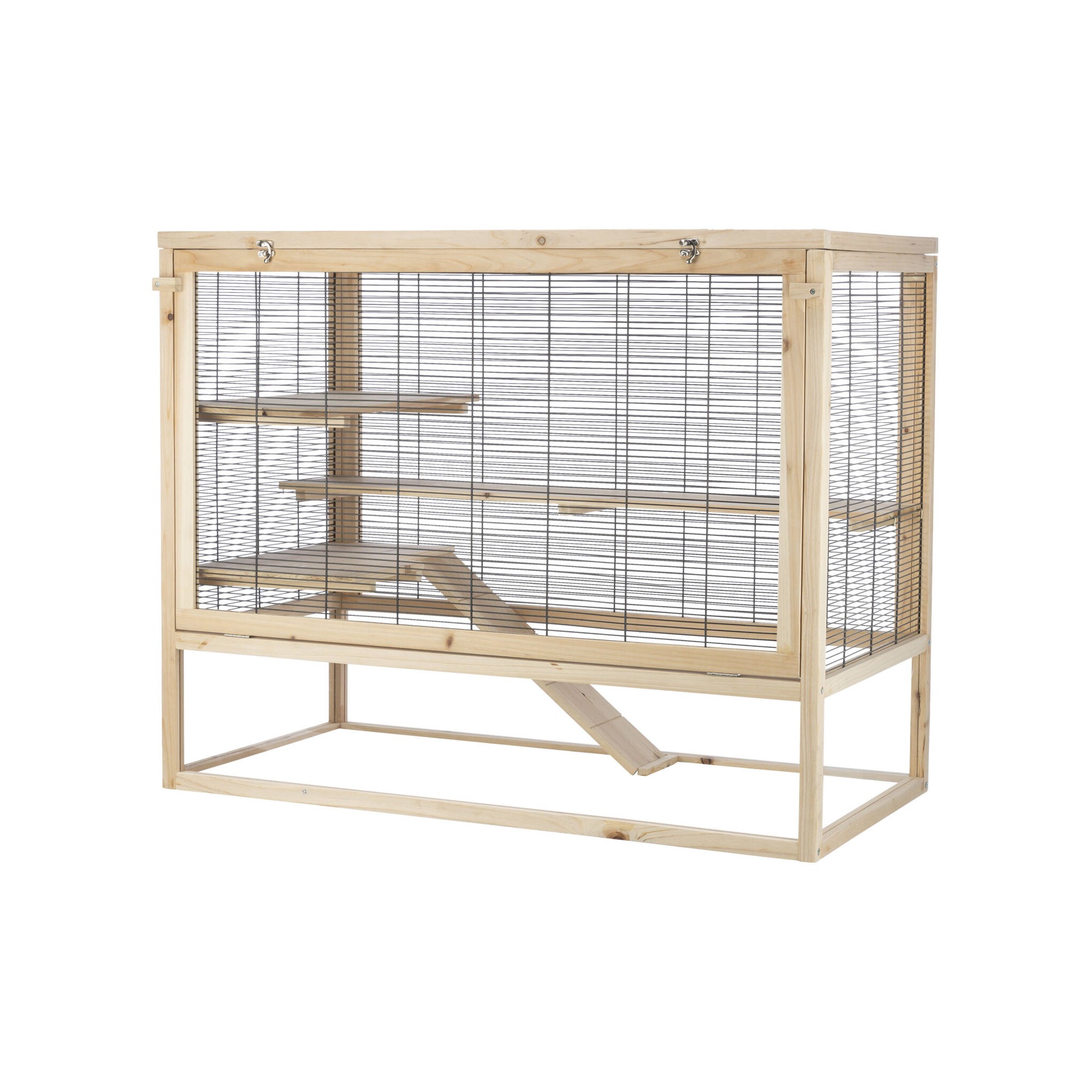Klatka dla gryzoni z akrylową szybą do oglądania zwierząt, różnymi poziomami umożliwiającymi zróżnicowaną konfigurację, dolnym panelem przednim umożliwiającym wysokie wypełnienie ściółką do kopania i budowania norek, frontowym panelem na zawiasach dla łatwego czyszczenia i karmienia, pokrywą otwieraną od góry i bezpiecznie zamykaną, metalową kratką umożliwiającą powieszenie elementów do wspinania, łatwym montażem oraz wykonana z drewna, metalu i akrylu. Klatka jest zgodna z ustawą o ochronie zwierząt - §18 (AT).