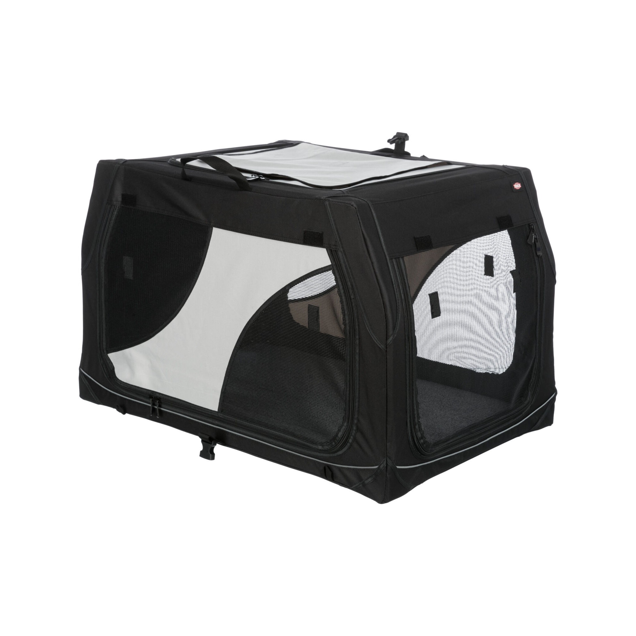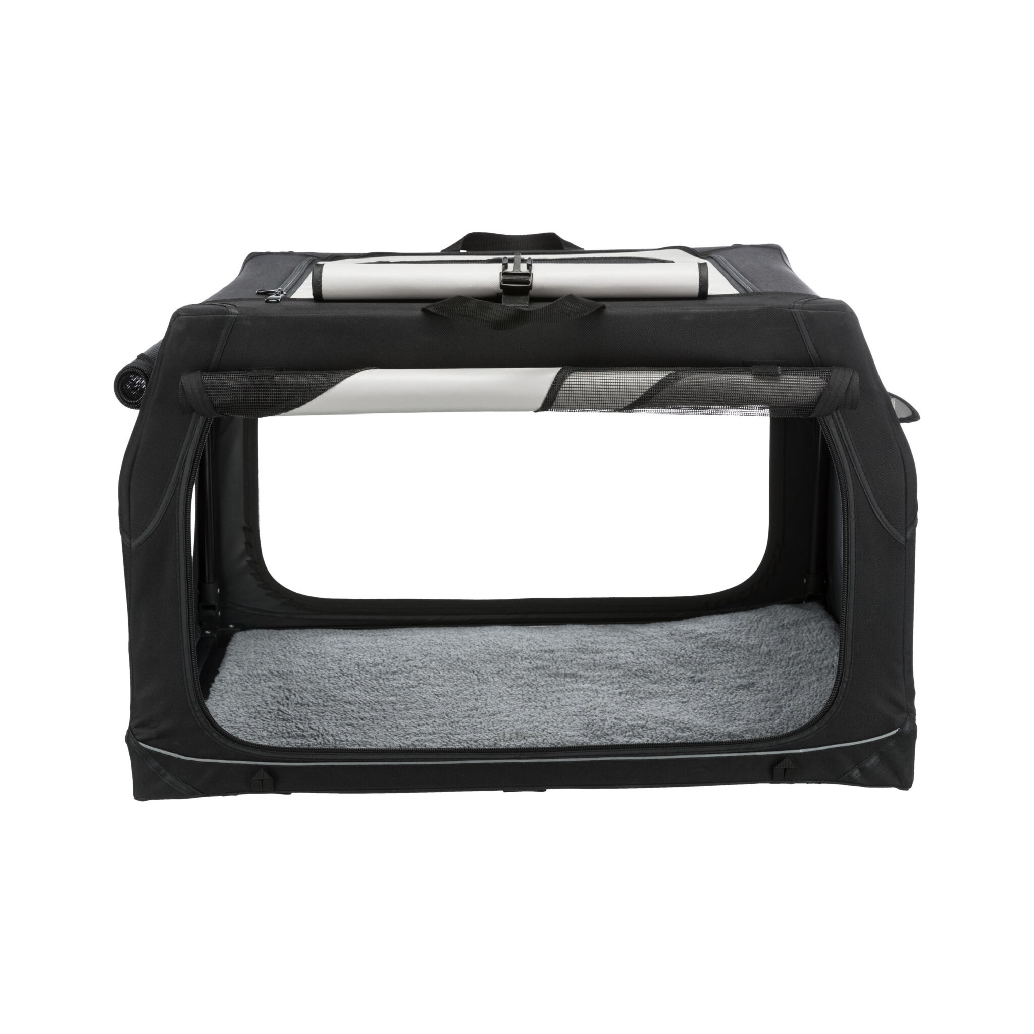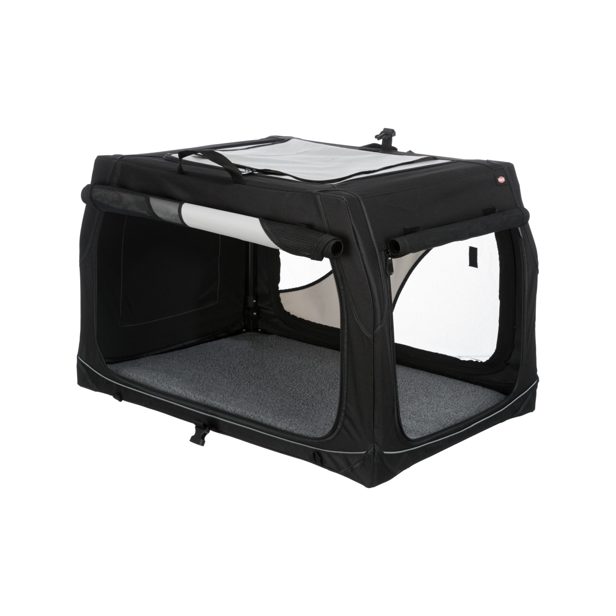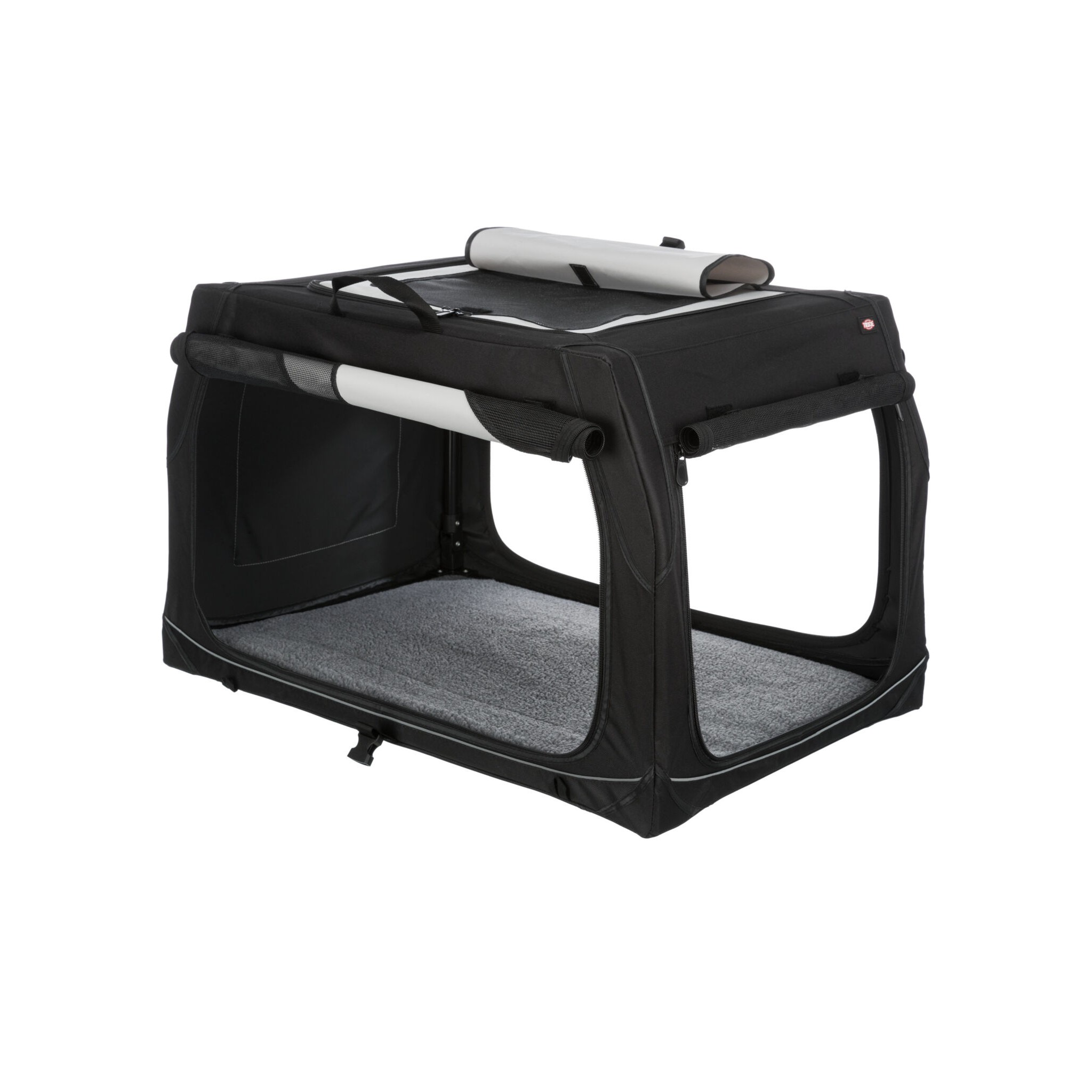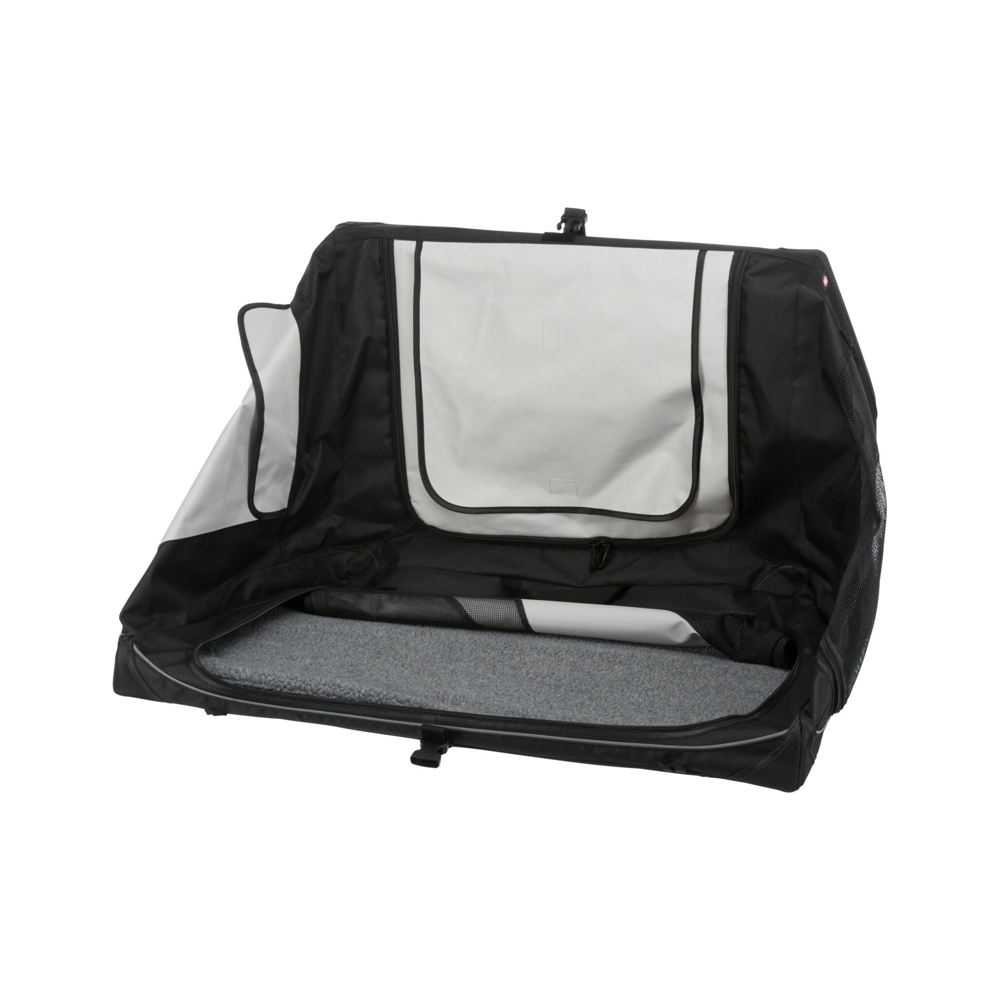 Klatka dla psa Vario to stabilna metalowa rama z mechanizmem szybkiego składania, idealna do użytku na zewnątrz dzięki dodatkowym klapom i sledziom. Posiada otwarcie z 3 stron oraz górną wstawkę siatkową, którą można zakryć. Dodatkowo wyposażona jest w zewnętrzne kieszenie, rzepy zapobiegające przesuwaniu się oraz ochronę zderzaka. W zestawie znajduje się również torba do transportu oraz mata do leżenia z imitacji futra jagnięcego (poliester). Kolor: czarny/szary.