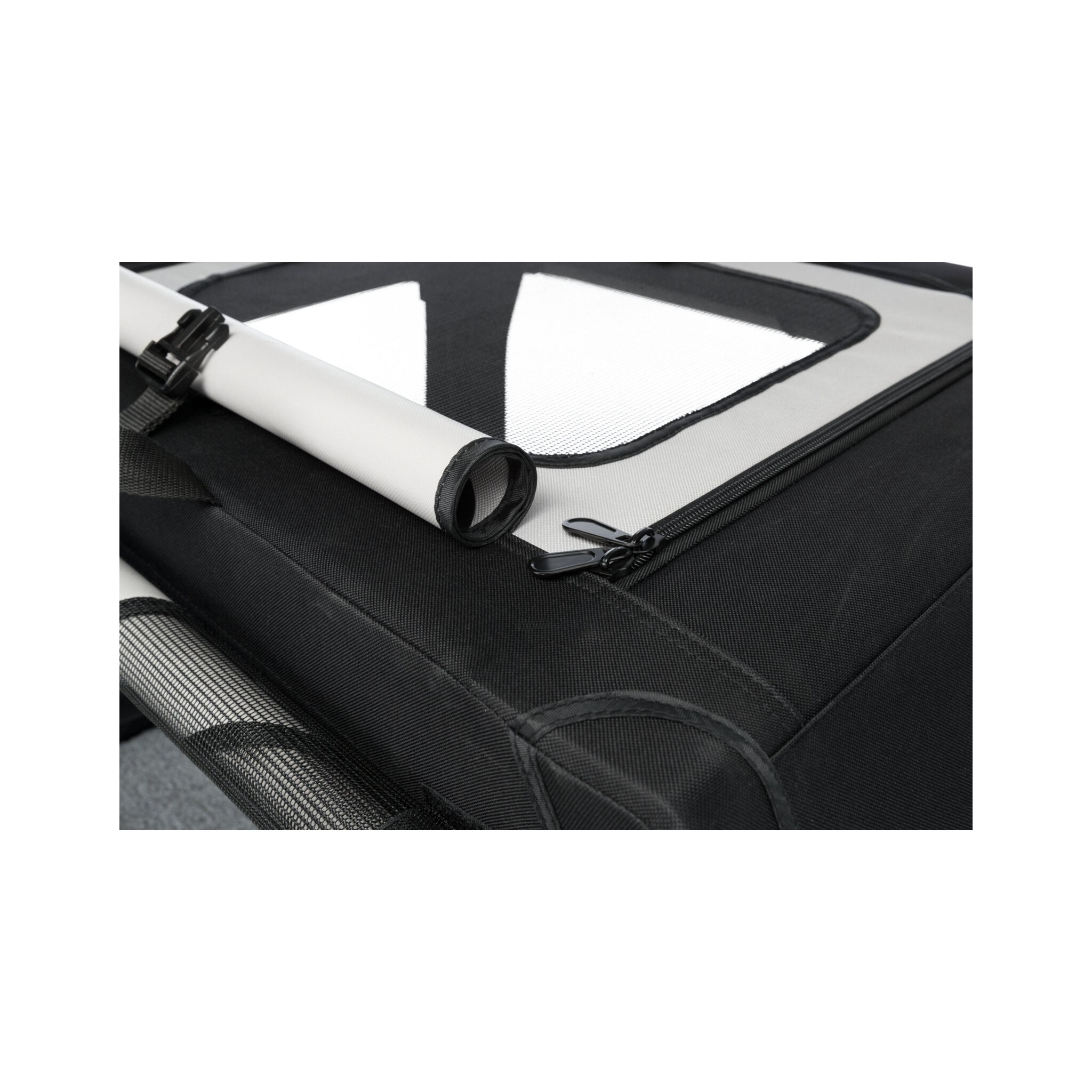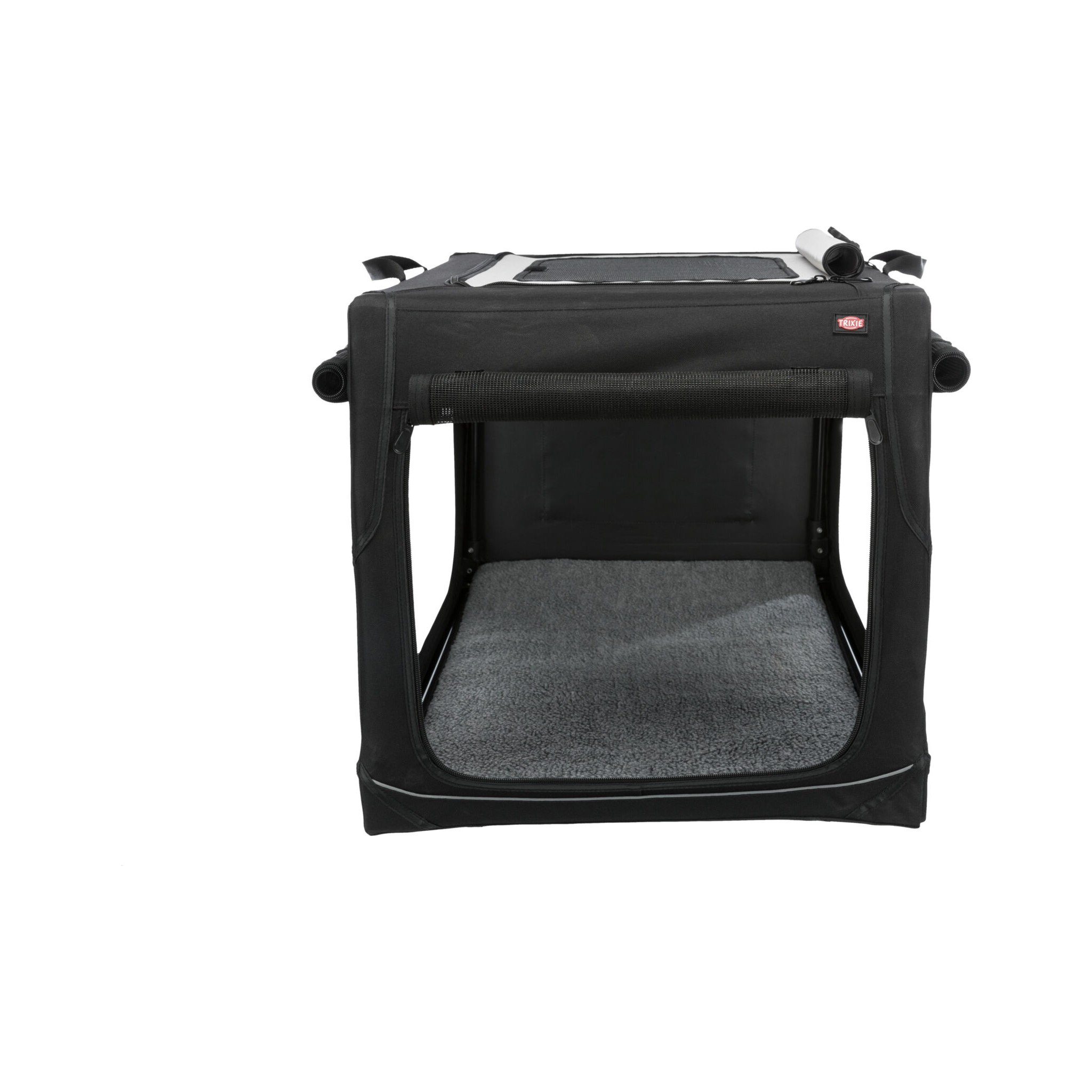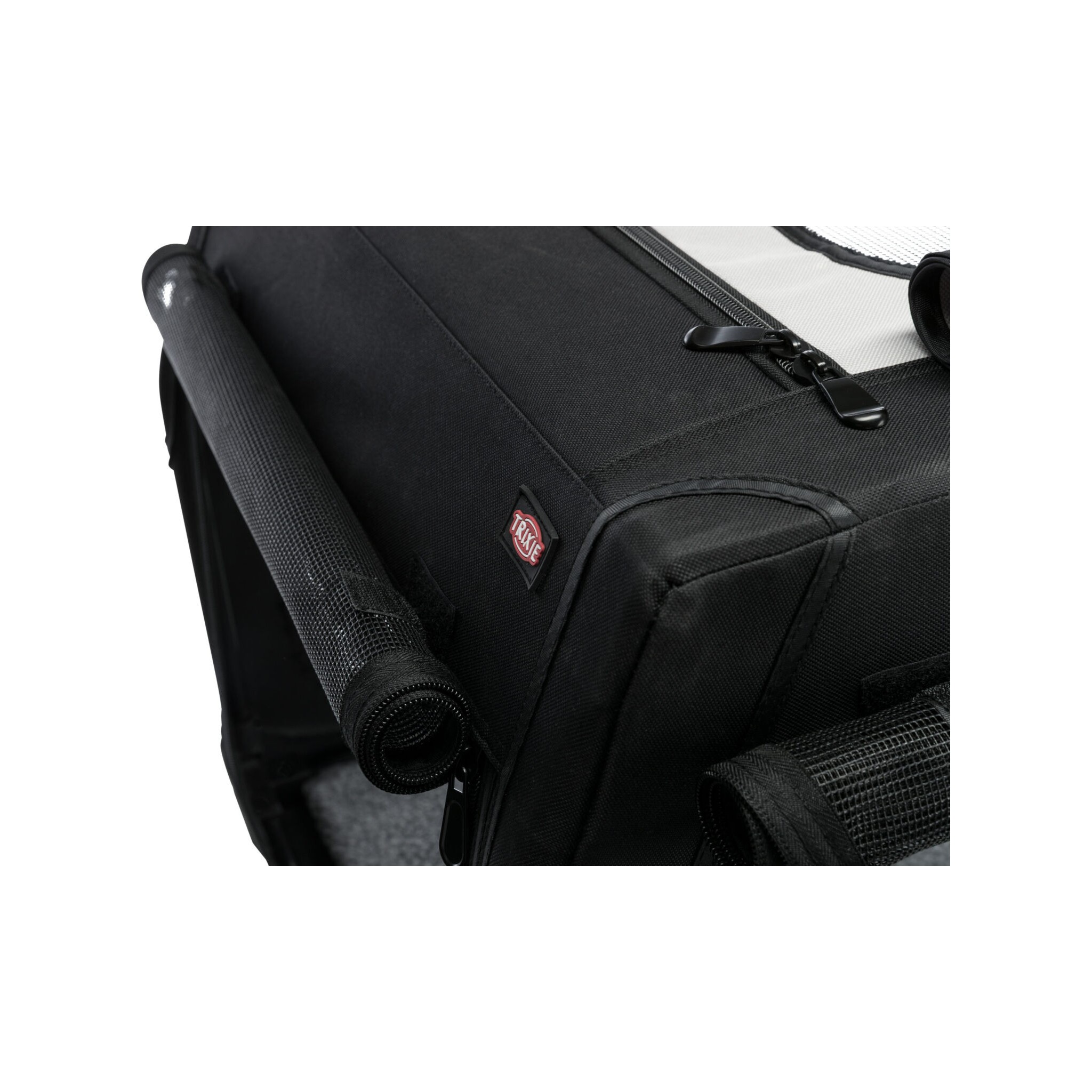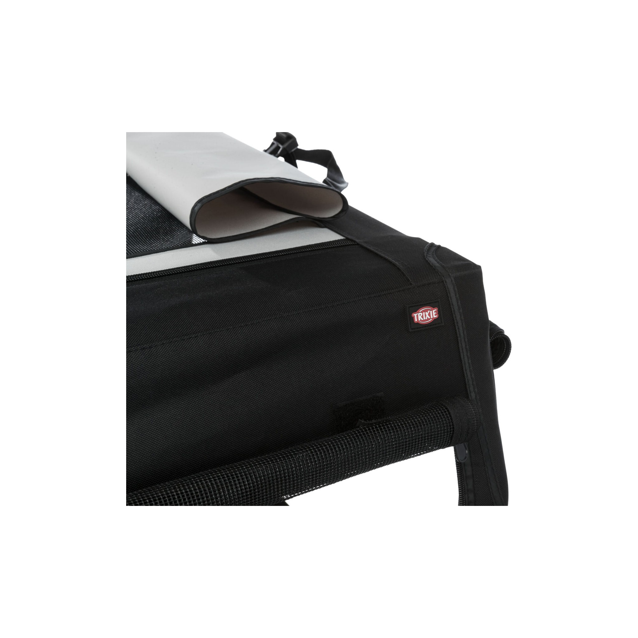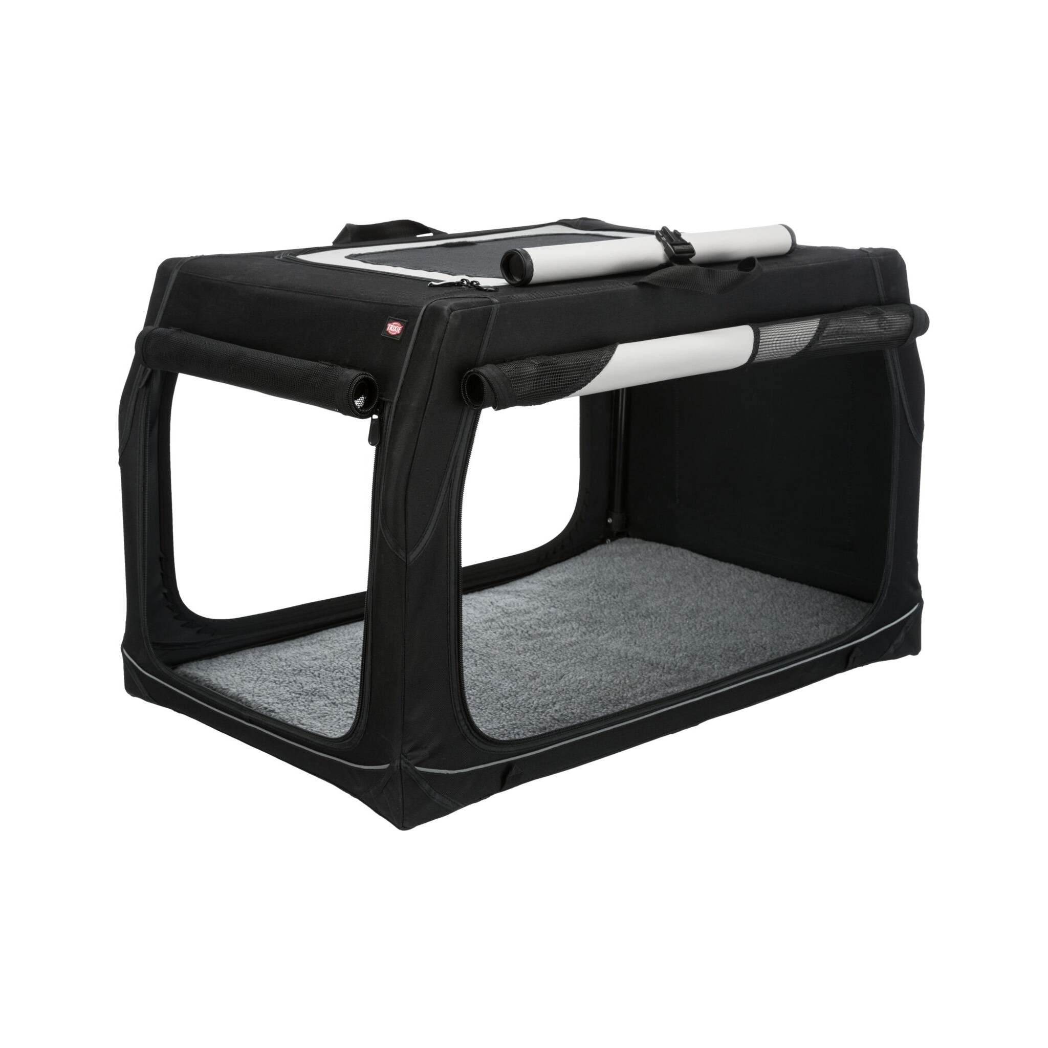 Klatka dla psa Vario to stabilna metalowa rama z mechanizmem szybkiego składania, idealna do użytku na zewnątrz dzięki dodatkowym klapom i sledziom. Posiada otwarcie z 3 stron oraz górną wstawkę siatkową, którą można zakryć. Dodatkowo wyposażona jest w zewnętrzne kieszenie, rzepy zapobiegające przesuwaniu się oraz ochronę zderzaka. W zestawie znajduje się również torba do transportu oraz mata do leżenia z imitacji futra jagnięcego (poliester). Kolor: czarny/szary.