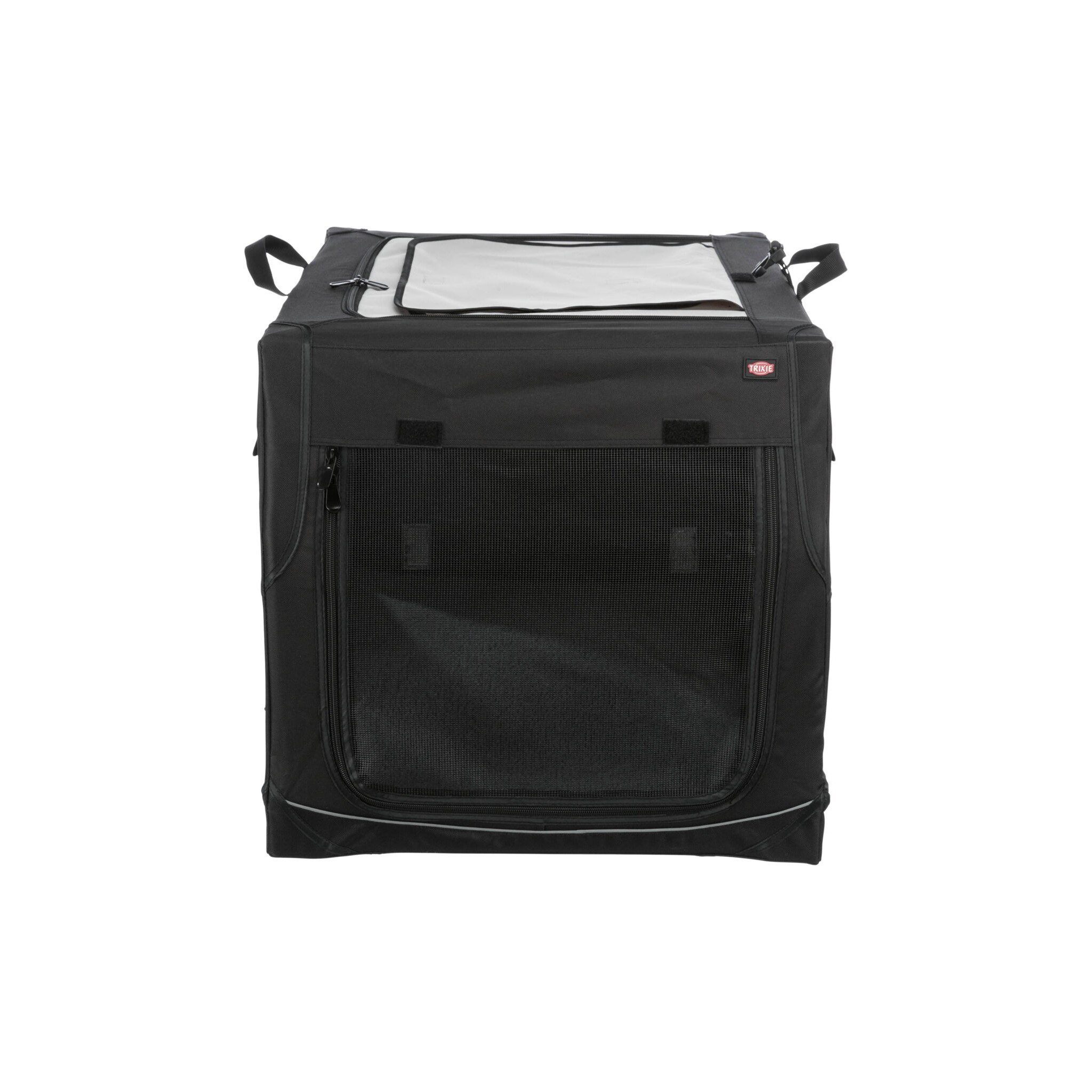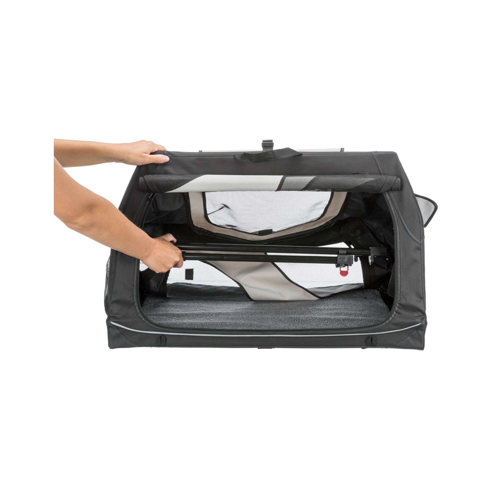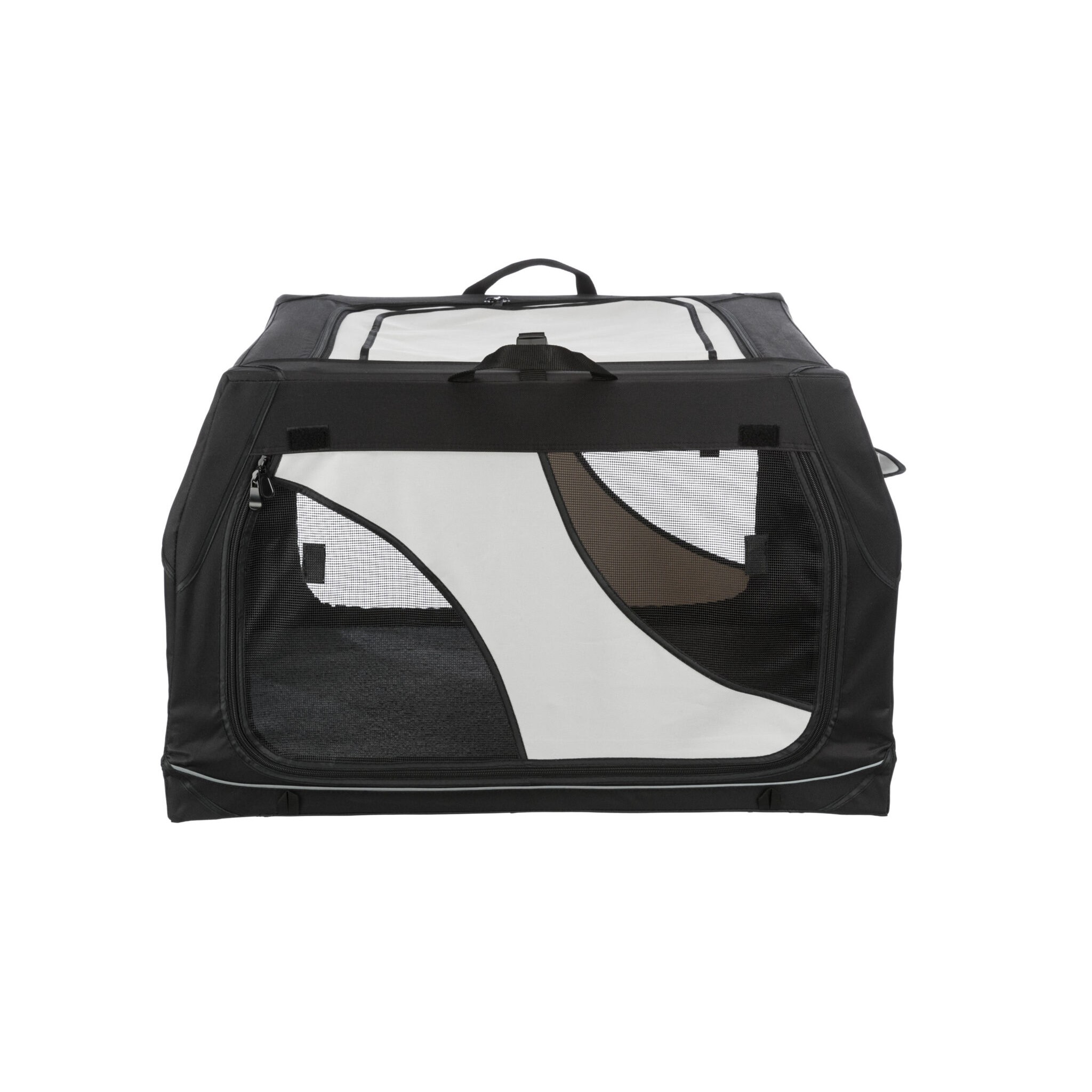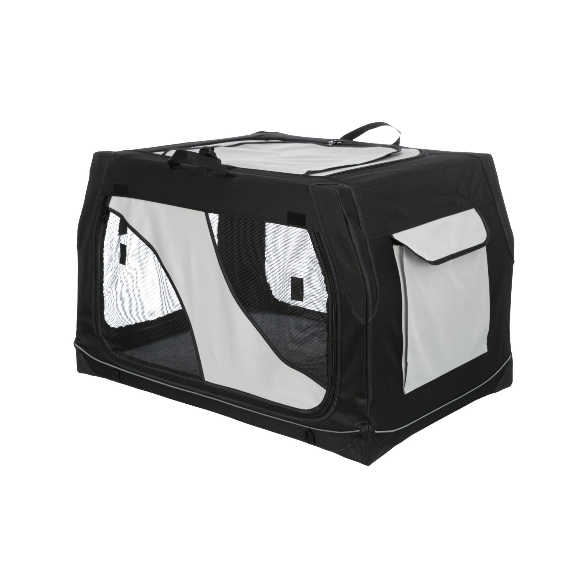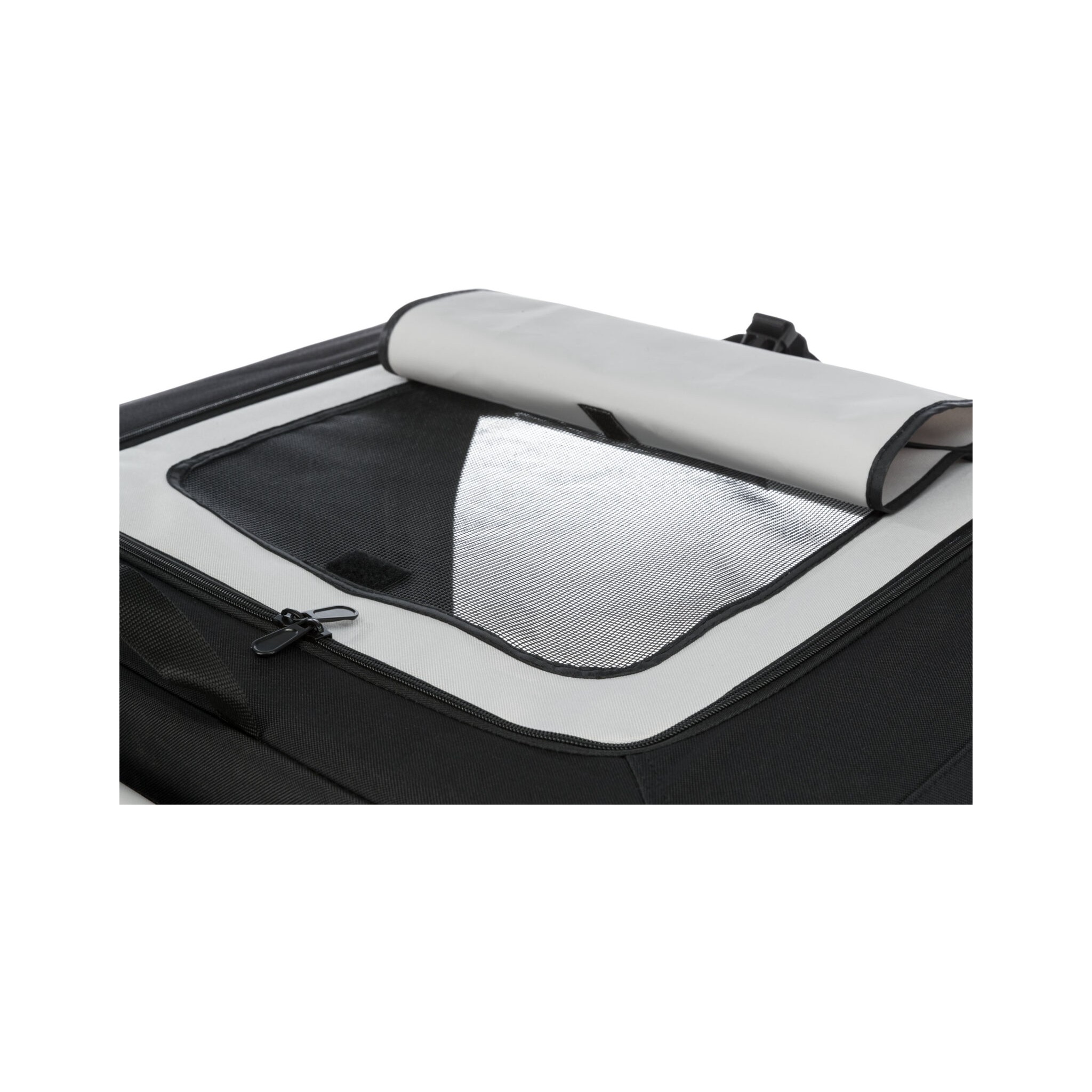 Klatka dla psa Vario to stabilna metalowa rama z mechanizmem szybkiego składania, idealna do użytku na zewnątrz dzięki dodatkowym klapom i sledziom. Posiada otwarcie z 3 stron oraz górną wstawkę siatkową, którą można zakryć. Dodatkowo wyposażona jest w zewnętrzne kieszenie, rzepy zapobiegające przesuwaniu się oraz ochronę zderzaka. W zestawie znajduje się również torba do transportu oraz mata do leżenia z imitacji futra jagnięcego (poliester). Kolor: czarny/szary.