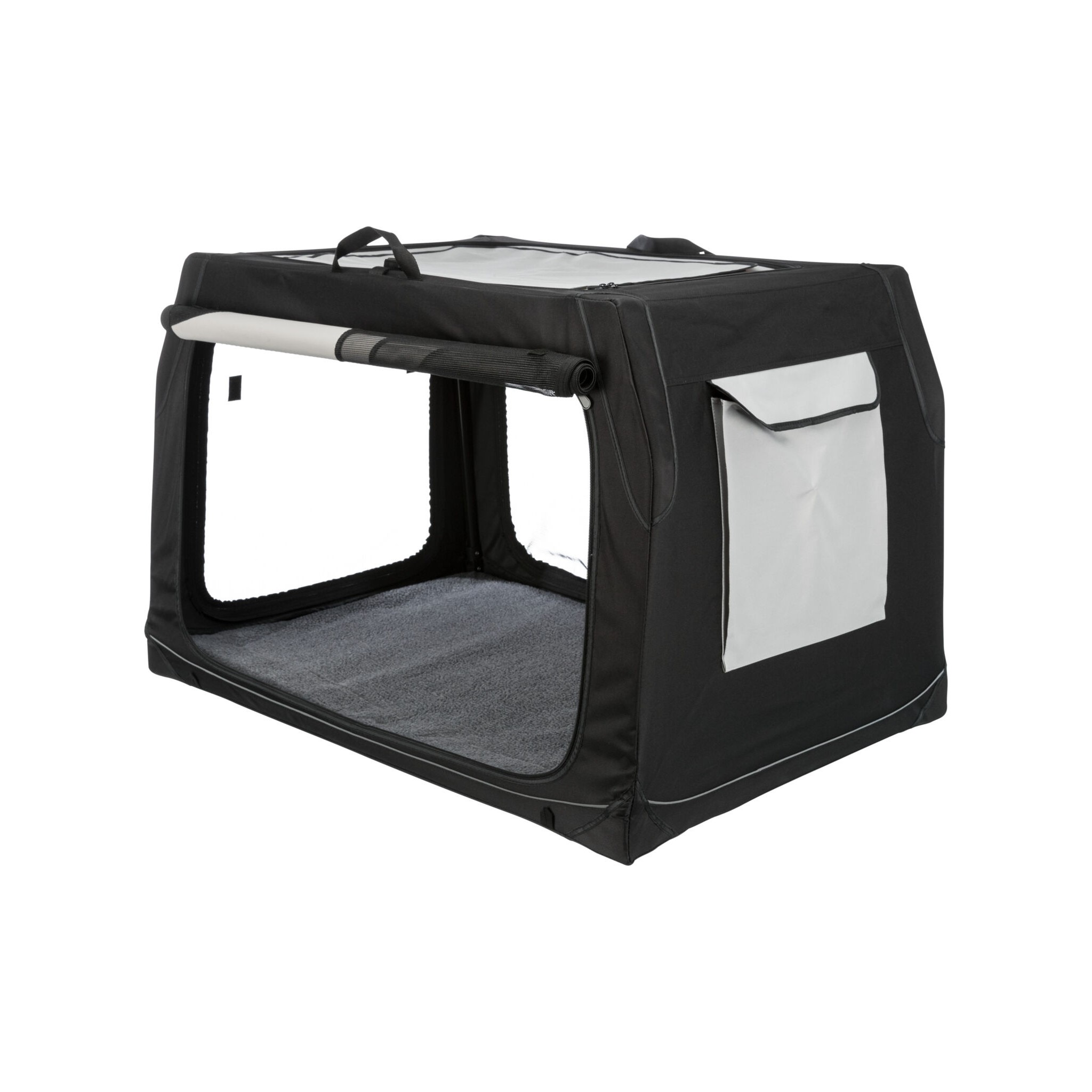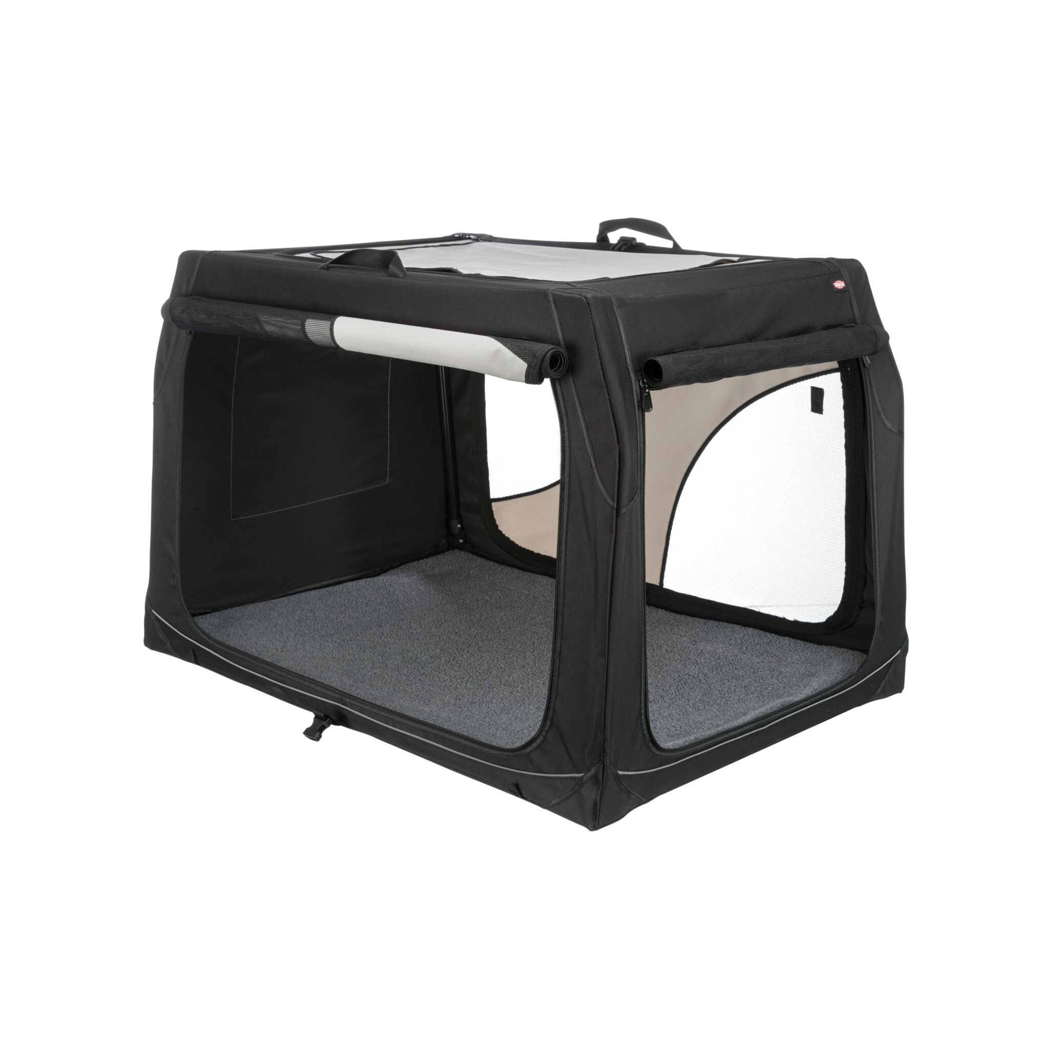 Klatka dla psa Vario to stabilna metalowa rama z mechanizmem szybkiego składania, idealna do użytku na zewnątrz dzięki dodatkowym klapom i sledziom. Posiada otwarcie z 3 stron oraz górną wstawkę siatkową, którą można zakryć. Dodatkowo wyposażona jest w zewnętrzne kieszenie, rzepy zapobiegające przesuwaniu się oraz ochronę zderzaka. W zestawie znajduje się również torba do transportu oraz mata do leżenia z imitacji futra jagnięcego (poliester). Kolor: czarny/szary.