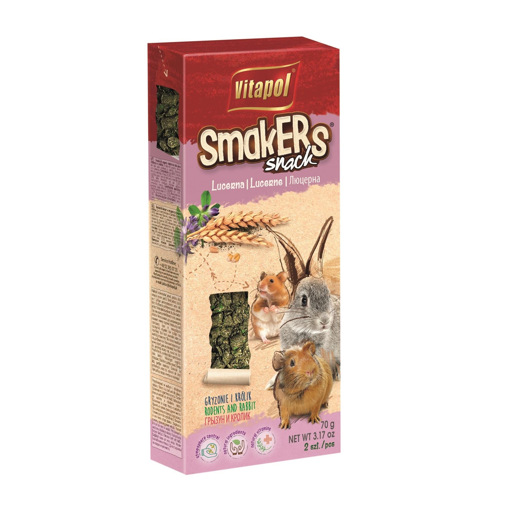 Smakers® stanowiący cenne źródło wysokowartościowego białka roślinnego. Lucerna to też znaczne ilości beta karotenu, witamin B, C, D, E i K oraz soli mineralnych: potasu, żelaza, wapnia i fosforu. Forma granulatu sprzyja ścieraniu ząbków gryzoni i królików.
