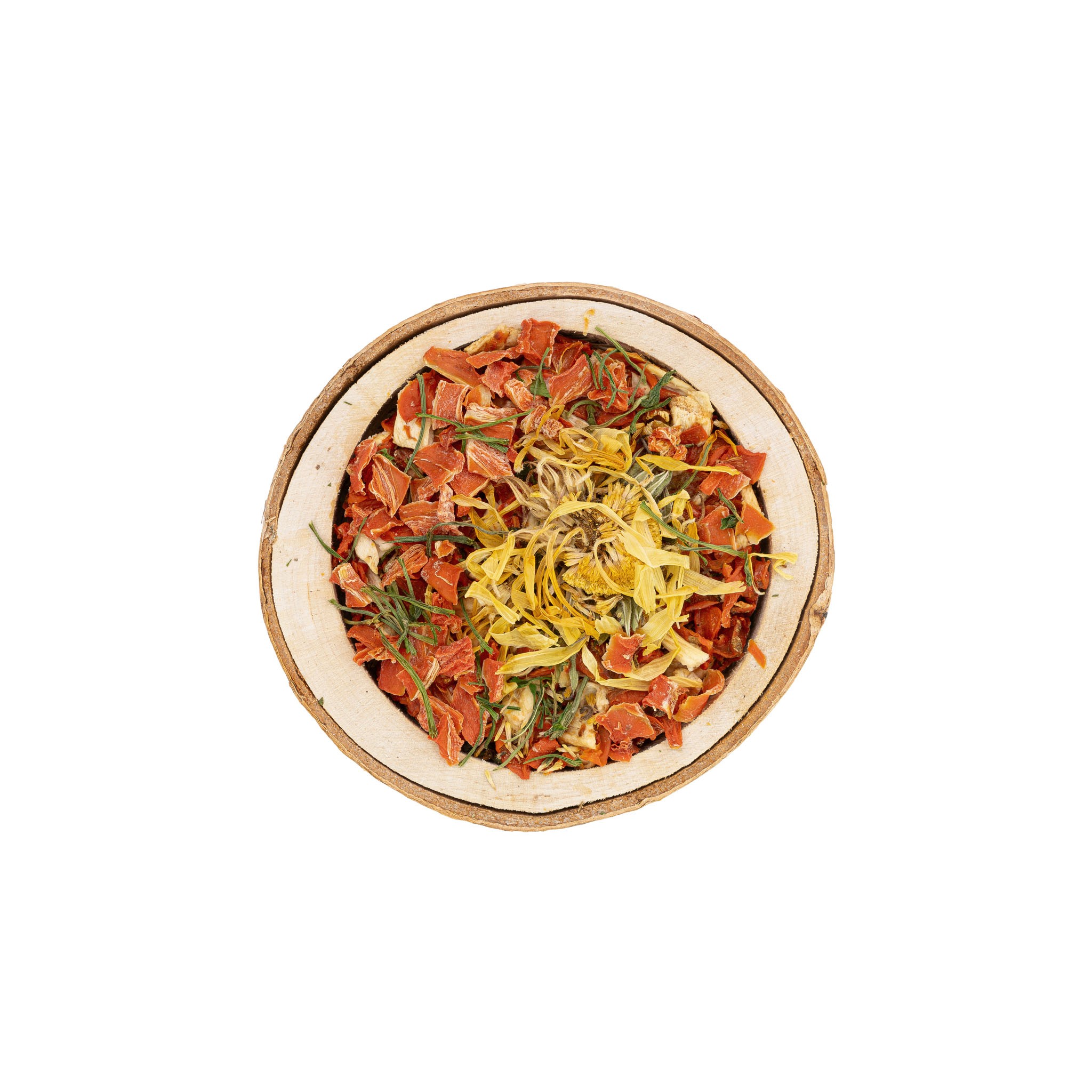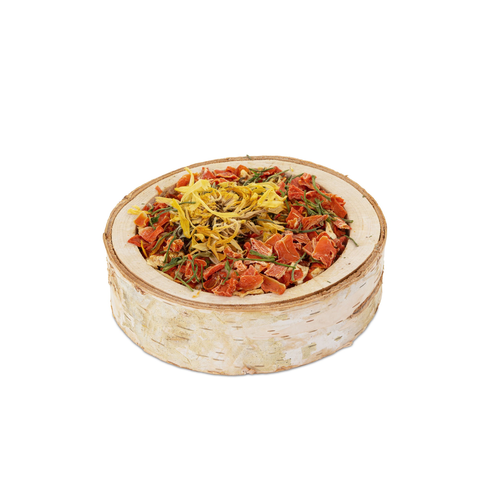 Skład: drewno brzozowe suszone, marchew suszona, pasternak suszony, łodyga pietruszki suszona, kwiat nagietka suszony, skrobia. Składniki analityczne: białko surowe (ozn. Met. Kjeldahla) min. 3,4%, tłuszcz surowy min. 0,1%, włókno surowe max. 6,35%, popiół surowy max. 6,28%, wilgotność max. 12%.
