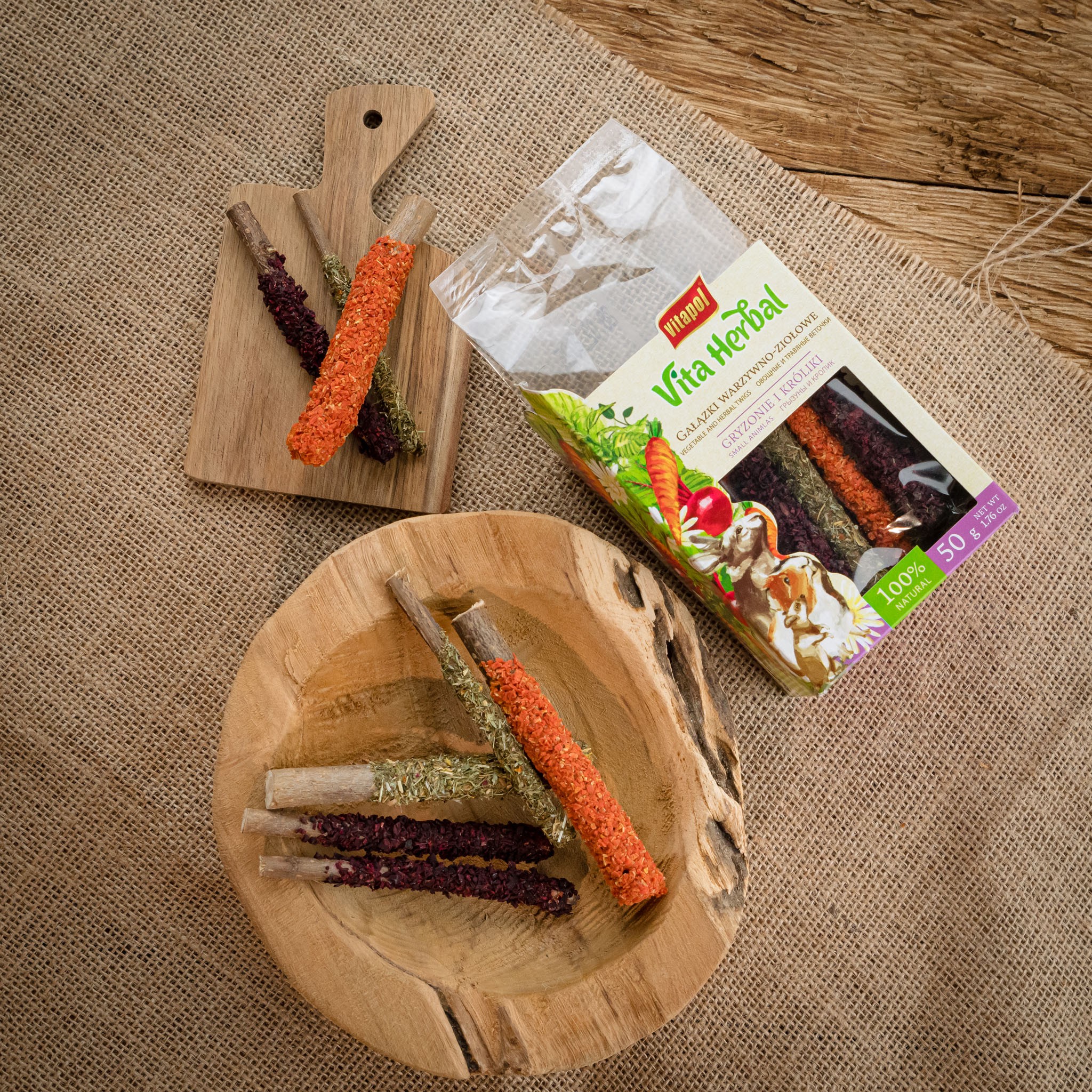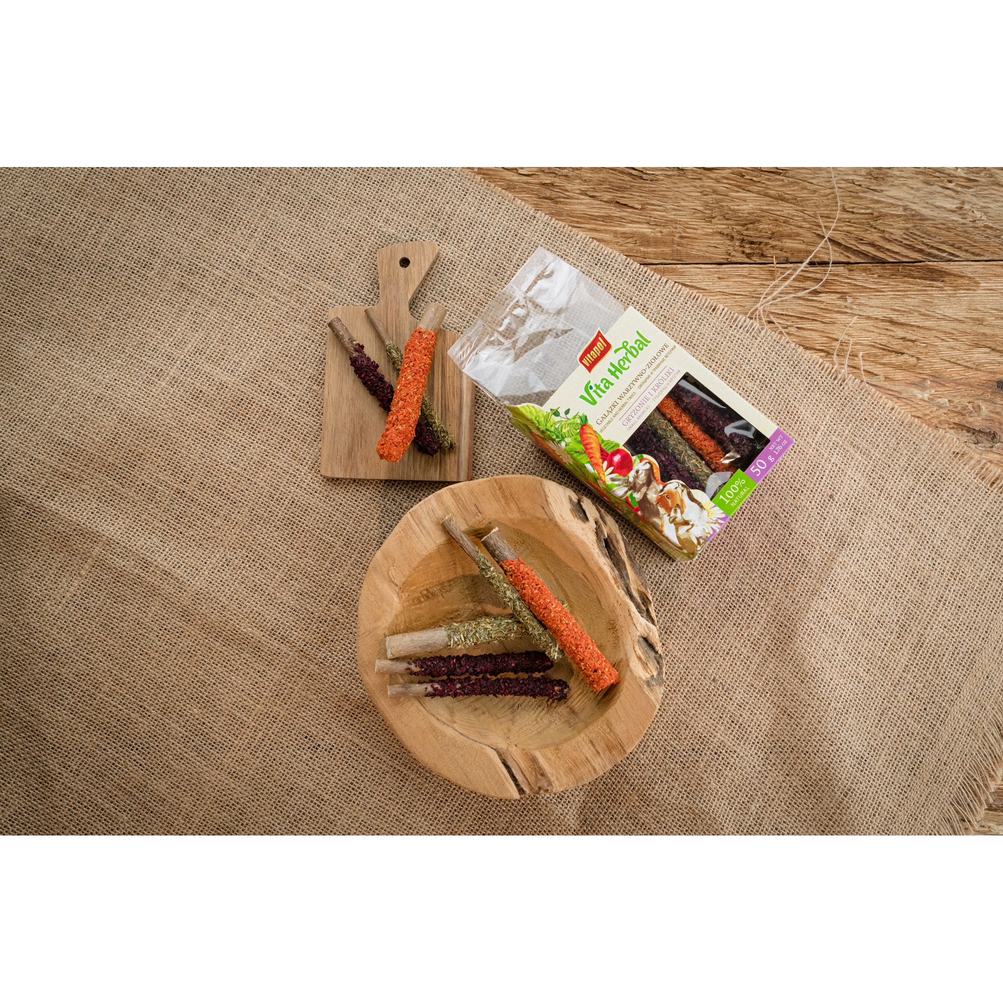 Mieszanka paszowa uzupełniająca. Skład: pędy leszczyny suszone, pietruszka suszona, skrobia. Składniki analityczne: białko surowe (ozn. met. Kjeldahla) min. 6,7%, tłuszcz surowy min. 0,01%, włókno surowe max. 19,97%, popiół surowy max. 10,24%, wilgotność max. 12%. Zalecenia dotyczące żywienia: jako przysmak uzupełniający karmę podstawową.
