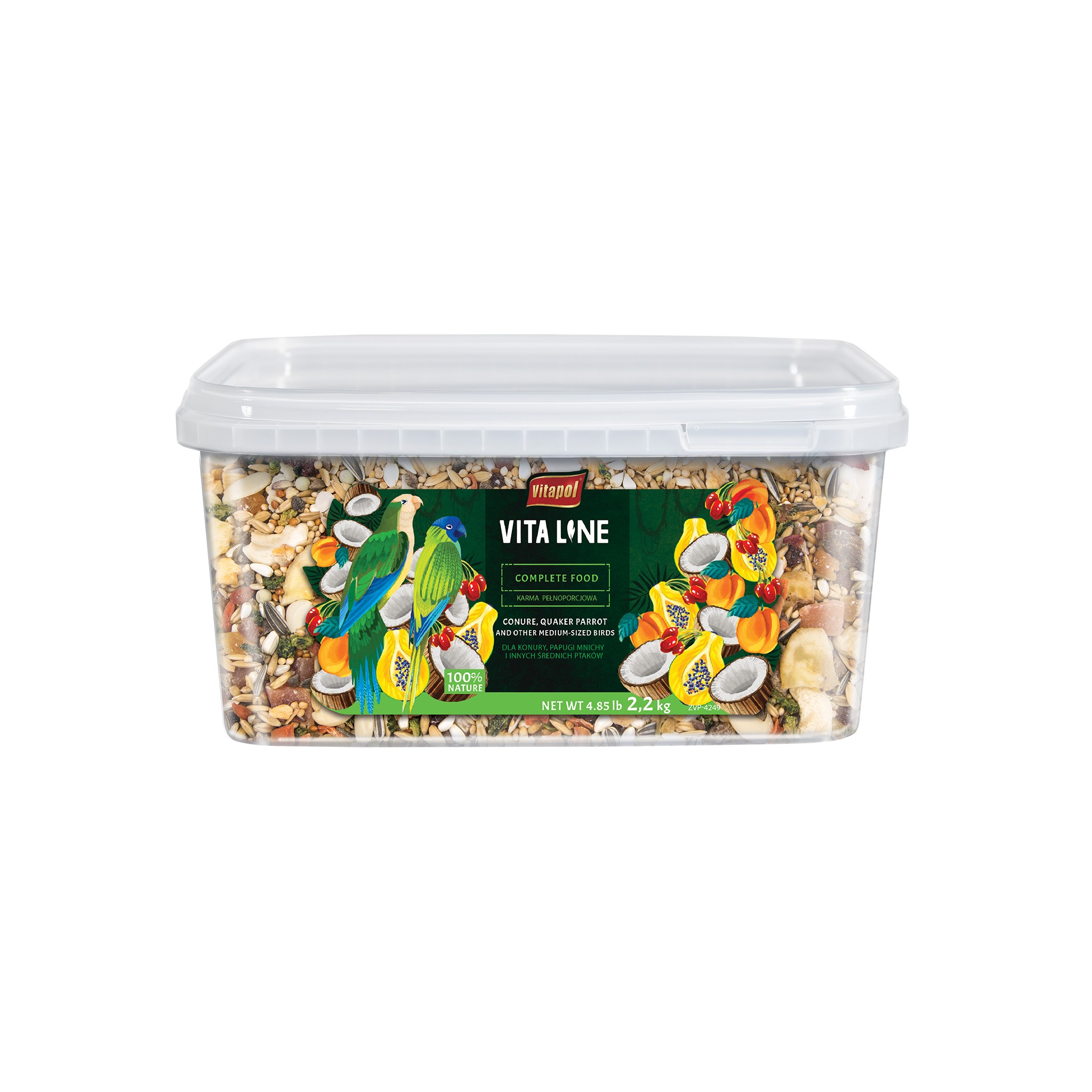 Vitaline karma pełnoporcjowa dla konury, papugi mnichy oraz innych średnich ptaków to idealne połączenie składników tworzących zbilansowaną i odżywczą dietę na każdy dzień. Całkowicie naturalna mieszanka nasion, zbóż, warzyw i owoców, idealna, aby dostarczyć ptakom witamin i minerałów, których potrzebują, aby zachować szczęście i zdrowie. Ze smacznymi kawałkami, które ptaki znajdą na wolności, w tym z bananem, nasionami krokosza barwierskiego, groszkiem, migdałami, morelą, kokosem, orzechami laskowymi.