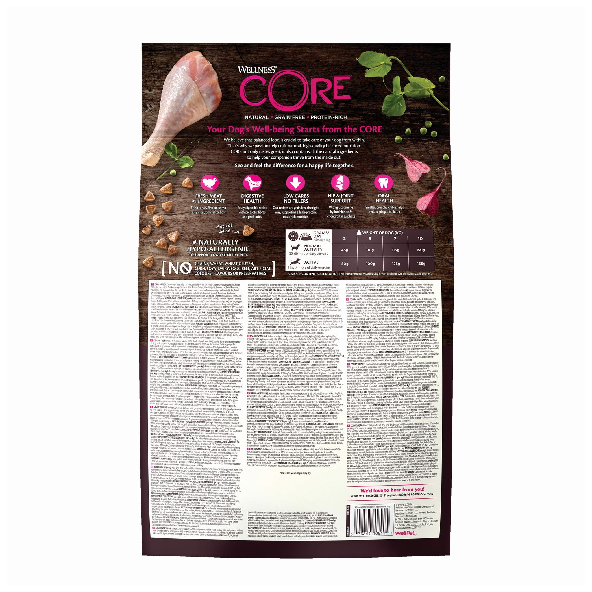 • Uniwersalność podawania – karma Wellness CORE Small Breed Adult Original może być podawana samodzielnie jako kompletny, suchy posiłek lub jako chrupiący dodatek do mokrej karmy Wellness Core, co zapewnia różnorodność w diecie Twojego pupila.