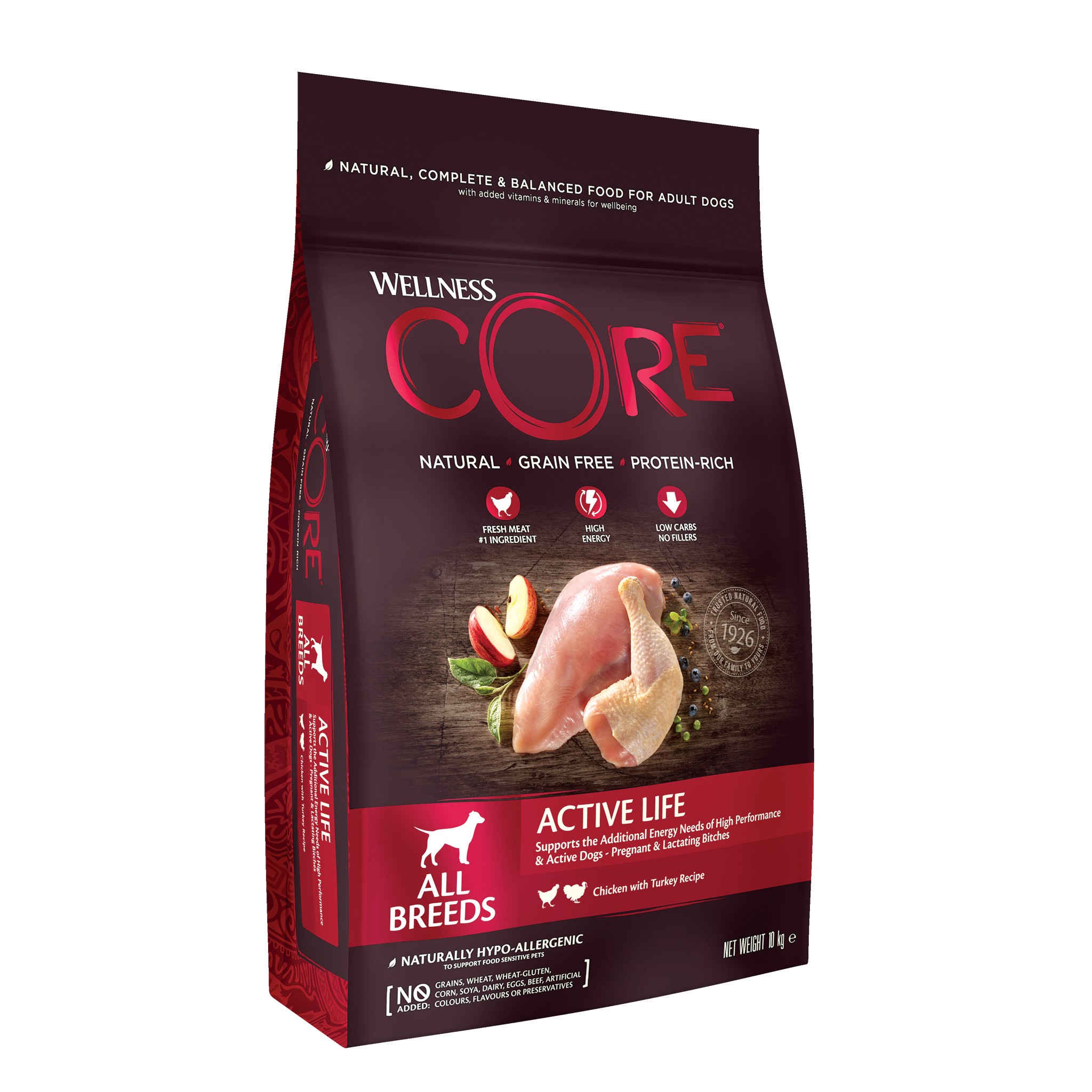 Wellness Core Active Life to doskonały wybór dla dorosłych psów o wysokiej wydajności, suk ciężarnych i karmiących, które potrzebują wyjątkowego wsparcia żywieniowego. Podaruj swojemu psu dietę, która dostarczy mu niezbędnej energii, wspiera jego zdrowie i kondycję, i ciesz się jego siłą oraz witalnością każdego dnia!