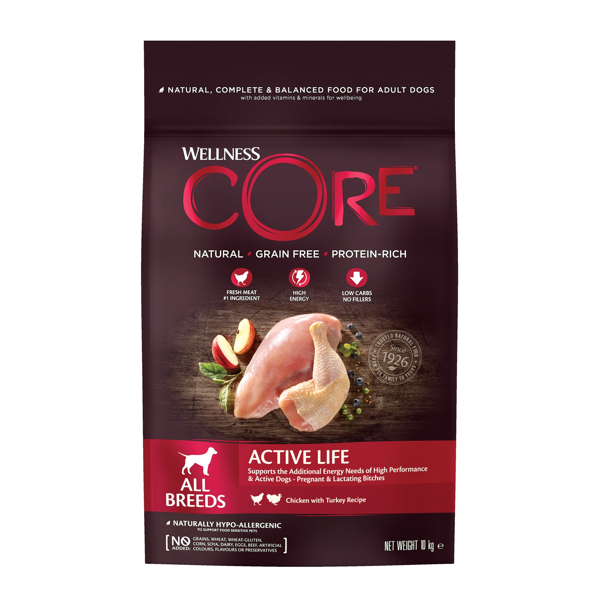 Wellness Core Active Life to najwyższej jakości sucha karma z kurczakiem i indykiem w ekonomicznym opakowaniu 10kg, stworzona specjalnie z myślą o psach o wysokiej aktywności, które potrzebują dodatkowej energii, aby sprostać intensywnym aktywnościom na świeżym powietrzu. Ta hipoalergiczna formuła jest idealna dla psów pracujących, które muszą być czujne i aktywne przez dłuższy czas, jak również dla suk ciężarnych i karmiących, wspierając ich siłę i zdrowie, aby mogły jak najlepiej zatroszczyć się o swoje szczenięta.